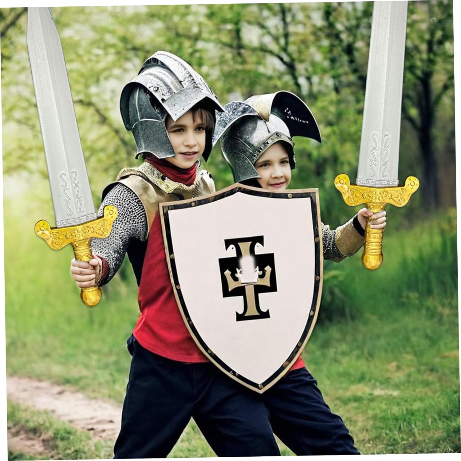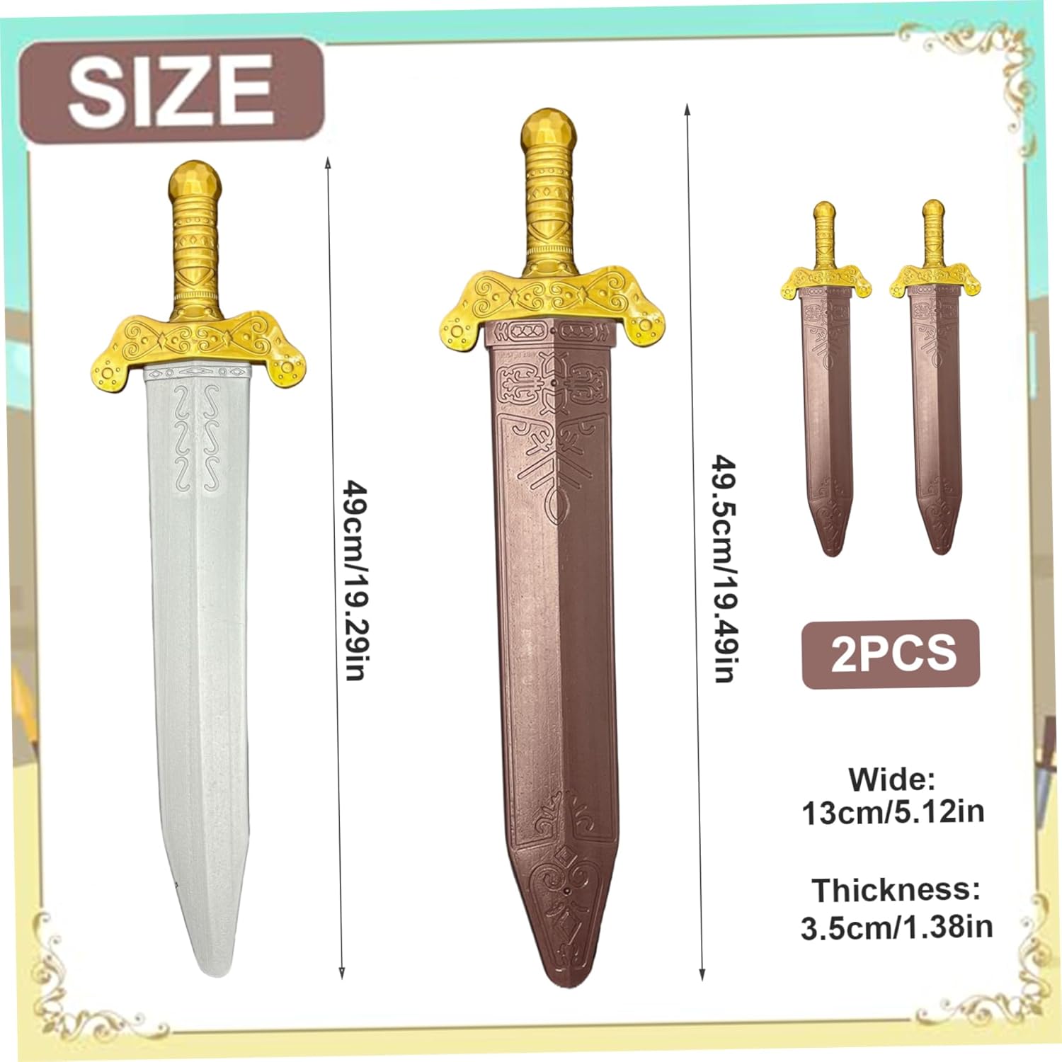 Design sicuro: realizzati in plastica morbida, queste spade assicurano un gioco sicuro per i bambini..Il design leggero consente una facile maneggevolezza durante i combattimenti di gioco, eliminando il rischio di lesioni. Spade per bambini Spada Emozionante gioco di gioco: queste spade giocattoli da 19 pollici sono perfette per scatenare l'immaginazione e l'avventura!.I bambini possono impegnarsi in battaglie e creare le loro storie come cavalieri medievali, guerrieri romani o eroi fantasy..Toy Sword Knight Sword Incoraggia il gioco attivo: queste spade giocattoli promuovono l'attività fisica e le capacità motorie mentre i bambini si impegnano in un gioco attivo, rendendoli una aggiunta alla collezione di giocattoli di qualsiasi bambino!.Cavaliere spada finta spada Set di battaglia completo: questo set include due spade giocattolo con guaine abbinate, perfette per la condivisione di duelli con gli amici..I bambini possono mettere in atto battaglie elettrizzanti insieme, incoraggiando il lavoro di squadra e il gioco cooperativo..Spada di plastica di spada finta Divertimento per tutte le occasioni: ideale per costumi di Halloween, feste a tema, giocate di travestimento o gioco immaginativo quotidiano, queste spade aggiungono elementi entusiasmanti a qualsiasi evento..Spada di schiuma per spada di plastica