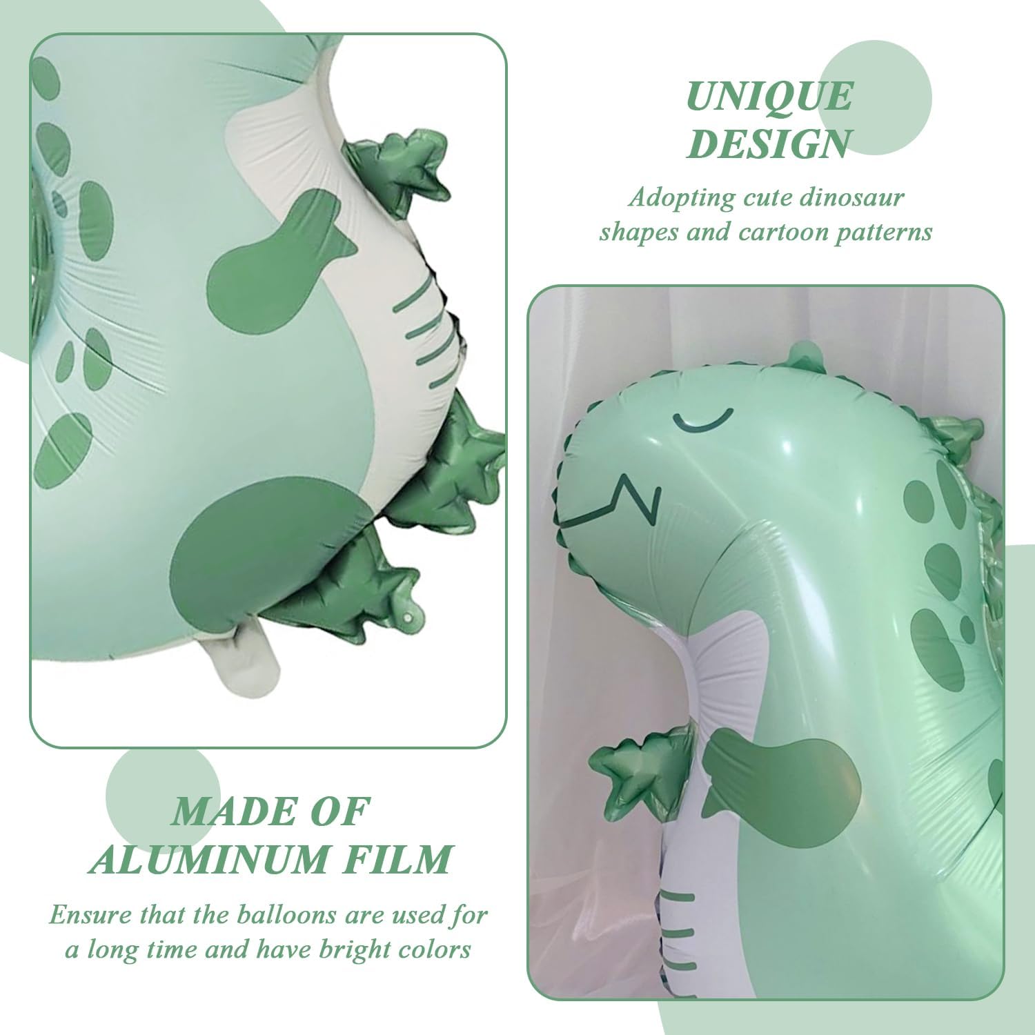 【Contenuto Del Prodotto】 Ottieni 4 Pezzi Dinosauri: Bile Film Aluminum. Ogni Palloncino Ha Una Dimensione Di 59*49 Cm Ed È Di Colore Verde, Adatto Alla Decorazione Delle Feste E Alle Disposizioni Degli Eventi. 【Materiale Del Prodotto】 Questo Prodotto È Costituito Da Film In Alluminio Resistente E Leggero. Il Materiale Del Film In Alluminio Non Solo Garantisce Che Il Pallone Dura A Lungo, Ma Abbia Anche Colori Vivaci E Non È Facile Da Sbiadire, Il Che Aumenta Il Divertimento E L'Estetica Della Decorazione. 【Design Creativo】 Questo Prodotto È Unico Con Forme Di Dinosauro Carine E Motivi Di Cartoni Animati Che Sono Perfetti Per Le Feste Per Bambini E I Temi Degli Animali. Il Cartello A Palloncino È Vivo E Interessante, Che Può Attirare L'Attenzione Dei Bambini E Creare Un'Atmosfera Gioiosa. 【Ampliato】 Questo Prodotto È Molto Adatto Come Decorazione Per Feste Di Compleanno, Eventi A Tema, Celebrazioni Del Festival E Altre Occasioni. Non Solo Può Essere Usato Da Solo, Ma Anche Combinato Con Altri Palloncini E Decorazioni Per Migliorare Gli Effetti Divertenti E Visivi Della Festa. 【Facile Da Usare】 Questi Palloncini Sono Facili Da Usare E Devono Solo Essere Gonfiati. Il Materiale Del Film In Alluminio Rende Più Facile Conservare Il Gas E Non Facile Da Leccare. Può Essere Facilmente Pulito Dopo L'Uso Ed È Anche Molto Comodo Riutilizzare Ciò Che È Ideale Per La Decorazione Delle Feste.