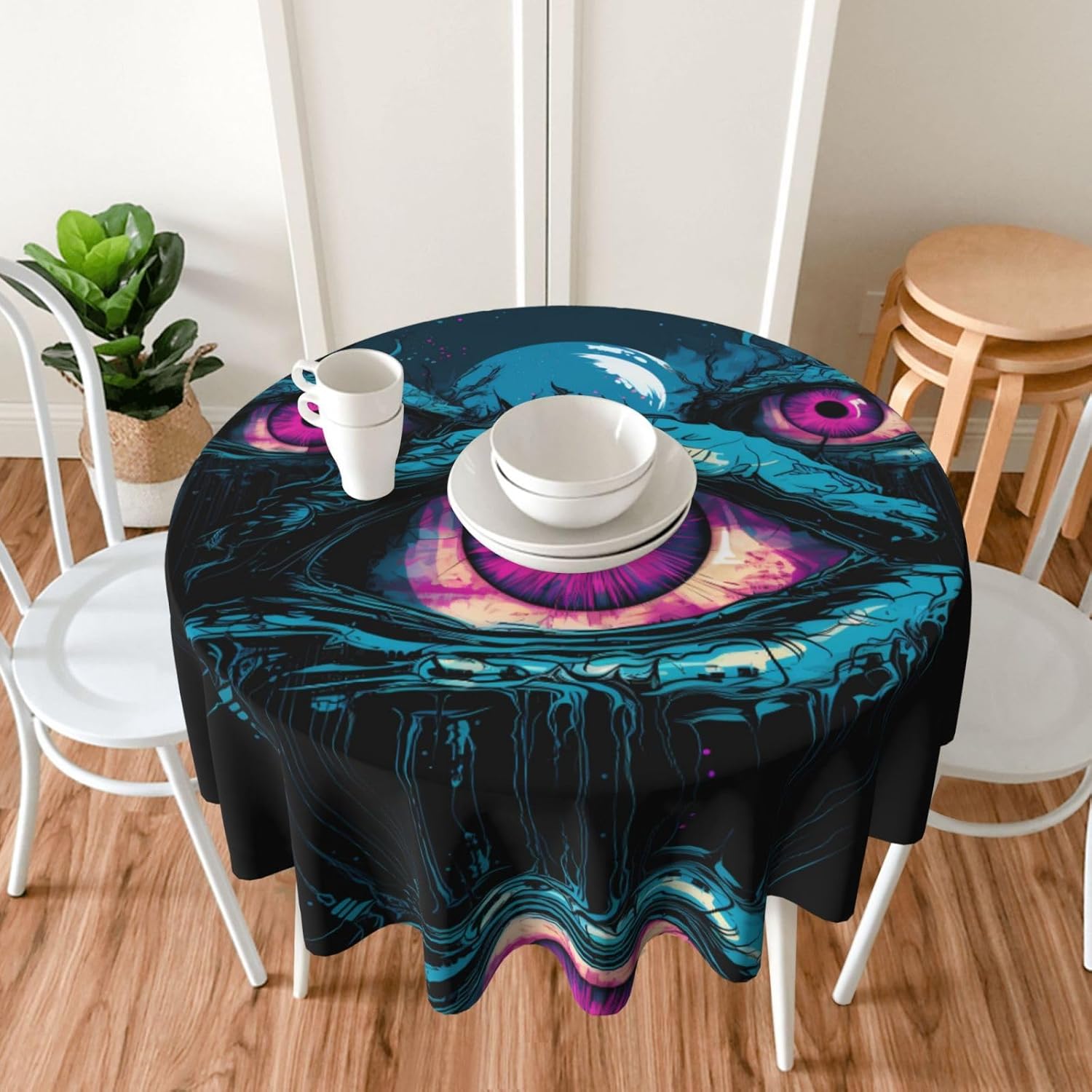 【Bellissimo motivo di design】 Questa tovaglia è stampata con un bellissimo motivo di mostri a tre occhi che illumina la tua sala da pranzo, il soggiorno e il patio con un aspetto fresco. MATERIALE DI ALTA QUALITÀ: questa tovaglia da 60" x 60" è realizzata in tessuto di poliestere di alta qualità, resistente alle pieghe, alle macchie, all'acqua e durevole. Proteggi la tavola: Con questa tovaglia la tua tavola non si sporcherà facilmente con oli e salse. Inoltre protegge il tuo tavolo da graffi e urti e lo fa sembrare nuovo. Adatto a molteplici occasioni: adatto per ogni occasione a casa, festa, hotel, ristorante, bar, cucina, patio o sala da pranzo. Puoi trovare la tovaglia giusta da abbinare a stoviglie, posate, tovaglioli, tovagliette e altre decorazioni. Durevole e adatto per uso interno ed esterno. Istruzioni per la cura: basta pulire con un panno umido per mantenere la tovaglia fresca e pulita. Lavare in lavatrice in acqua fredda, non candeggiare. Se necessario stirare a bassa temperatura dal rovescio della tovaglia.