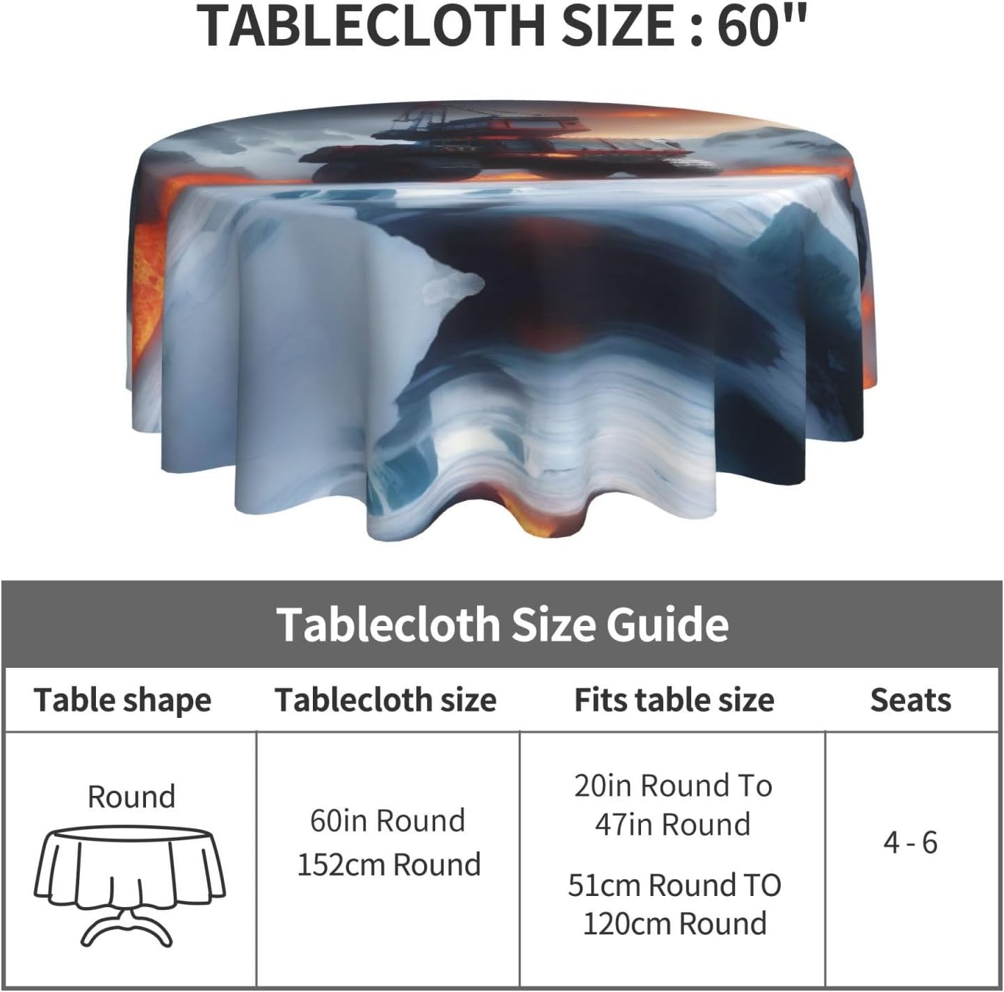 Bellissimo motivo: questa tovaglia è stampata con un bellissimo motivo di ghiaccio e fuoco che illuminerà la tua sala da pranzo, il soggiorno e il patio con un aspetto fresco. MATERIALE DI ALTA QUALITÀ: questa tovaglia da 60" x 60" è realizzata in tessuto di poliestere di alta qualità, resistente alle pieghe, alle macchie, all'acqua e durevole. Proteggi la tavola: Con questa tovaglia la tua tavola non si sporcherà facilmente con oli e salse. Inoltre protegge il tuo tavolo da graffi e urti e lo fa sembrare nuovo. Adatto a molteplici occasioni: adatto per ogni occasione a casa, festa, hotel, ristorante, bar, cucina, patio o sala da pranzo. Puoi trovare la tovaglia giusta da abbinare a stoviglie, posate, tovaglioli, tovagliette e altre decorazioni. Durevole e adatto per uso interno ed esterno. Istruzioni per la cura: basta pulire con un panno umido per mantenere la tovaglia fresca e pulita. Lavare in lavatrice in acqua fredda, non candeggiare. Se necessario stirare a bassa temperatura dal rovescio della tovaglia.