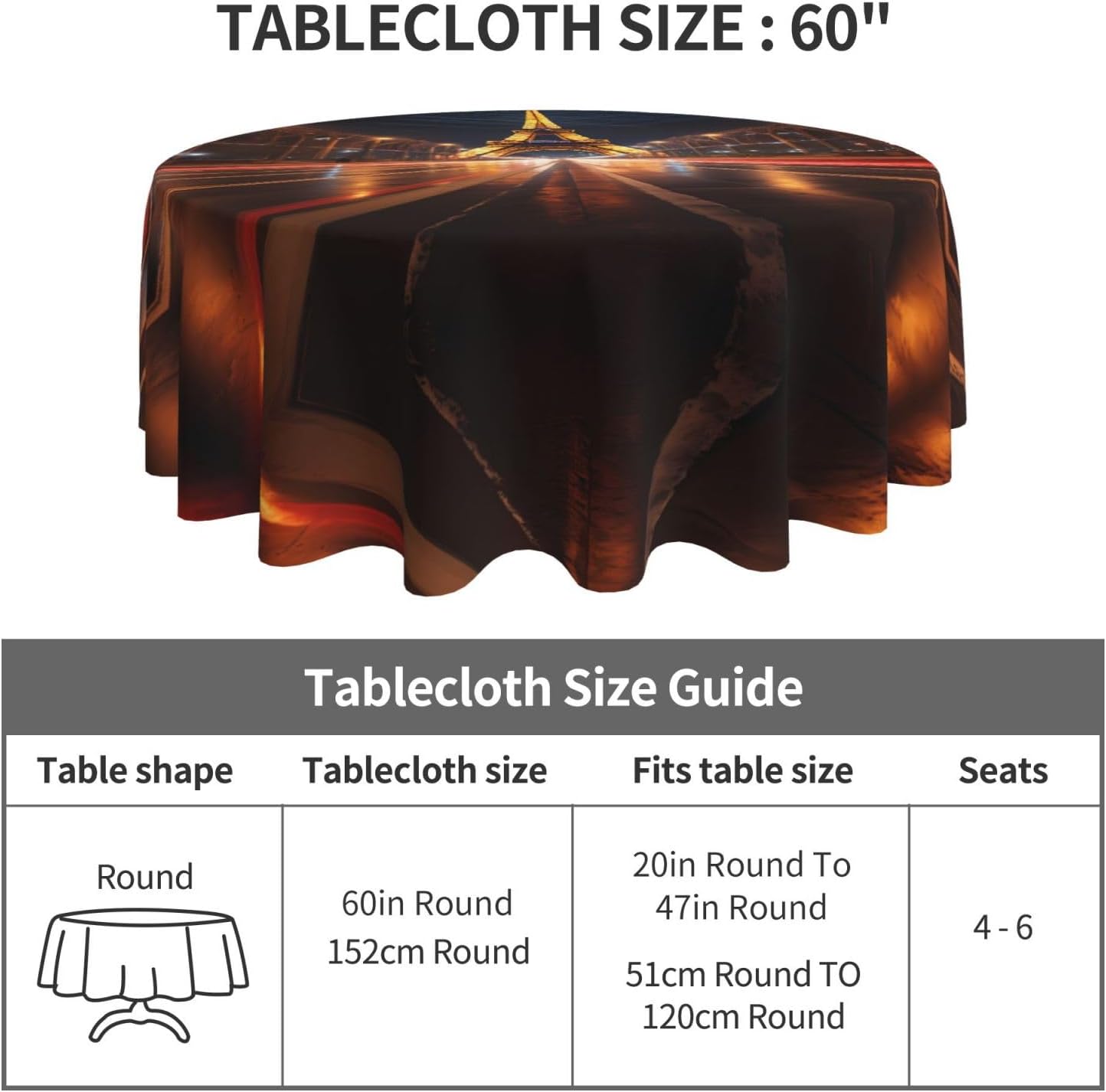 Bellissimo motivo: questa tovaglia è stampata con un bellissimo motivo della Torre Eiffel che illuminerà la tua sala da pranzo, il soggiorno e il patio con un look fresco. MATERIALE DI ALTA QUALITÀ: questa tovaglia da 60" x 60" è realizzata in tessuto di poliestere di alta qualità, resistente alle pieghe, alle macchie, all'acqua e durevole. Proteggi la tavola: Con questa tovaglia la tua tavola non si sporcherà facilmente con oli e salse. Inoltre protegge il tuo tavolo da graffi e urti e lo fa sembrare nuovo. Adatto a molteplici occasioni: adatto per ogni occasione a casa, festa, hotel, ristorante, bar, cucina, patio o sala da pranzo. Puoi trovare la tovaglia giusta da abbinare a stoviglie, posate, tovaglioli, tovagliette e altre decorazioni. Durevole e adatto per uso interno ed esterno. Istruzioni per la cura: basta pulire con un panno umido per mantenere la tovaglia fresca e pulita. Lavare in lavatrice in acqua fredda, non candeggiare. Se necessario stirare a bassa temperatura dal rovescio della tovaglia.