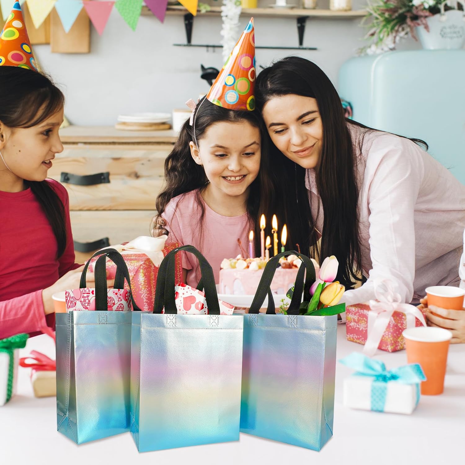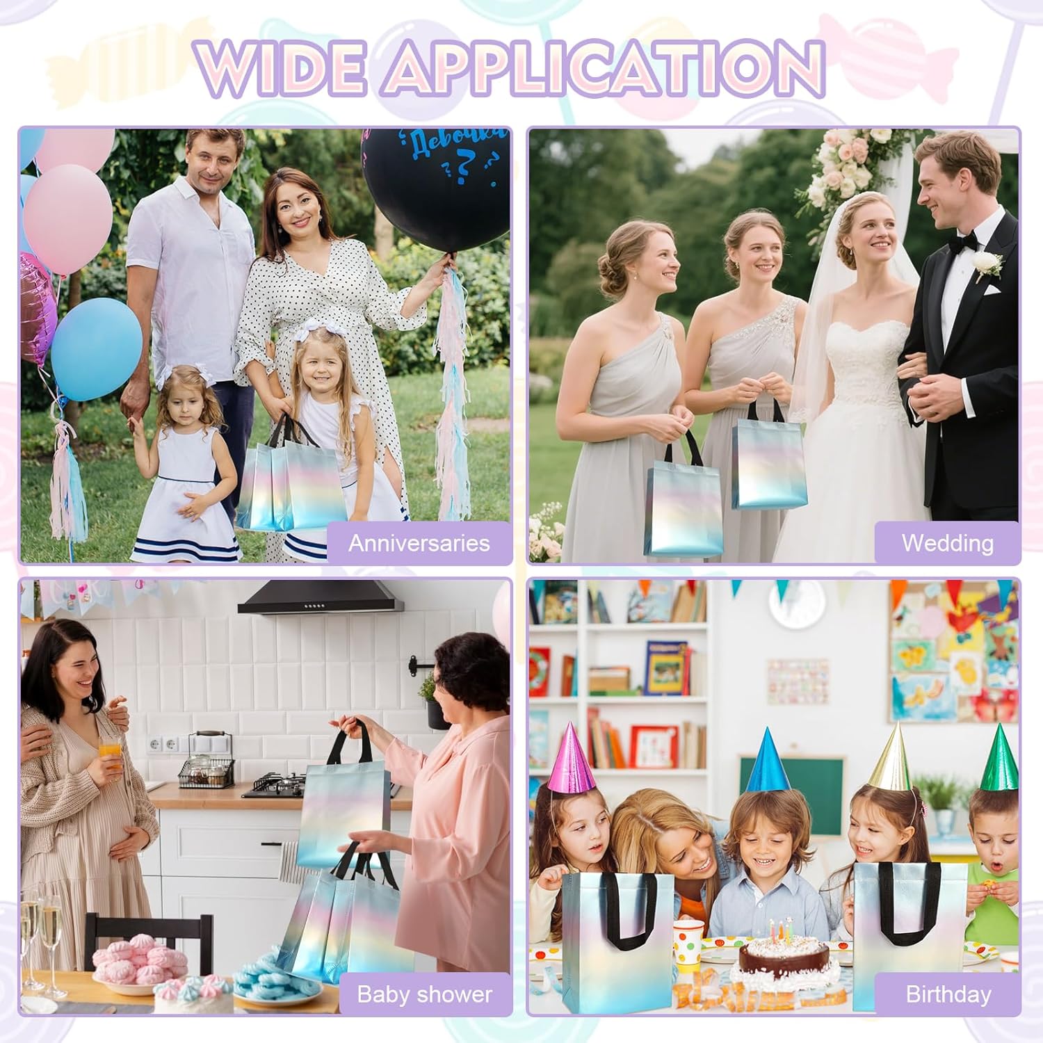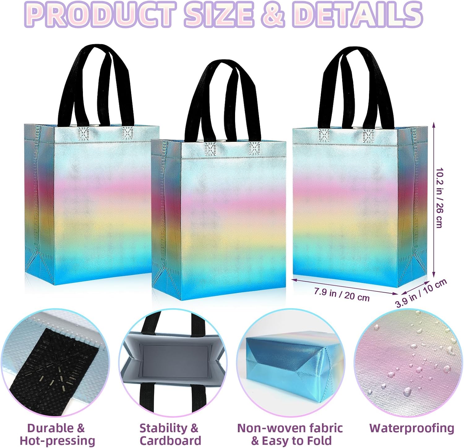 Materiali di alta qualità: realizzati in tessuto non tessuto di polipropilene con pellicola rivestita in metallo. Questi sacchetti regalo con manici sono robusti e durevoli e sono dotati di una scatola di cartone bianca che puoi inserire nella parte inferiore della borsa per tenere il regalo in posizione verticale. Dimensioni perfette: i nostri sacchetti regalo misurano circa 20 x 26 x 10 cm / 7,9 x 10,2 x 3,9 pollici, il che li rende ideali per l'uso quotidiano e per confezionare regali di compleanno, bomboniere, regali di nozze, regali per baby shower, ecc. Design pratico e da regalo: questi sacchetti regalo hanno design sfumati che creano uno straordinario effetto arcobaleno, la loro superficie liscia può essere utilizzata impermeabile meglio dei sacchetti di carta, sono facili da lavare e riutilizzabili. Cuciture rinforzate: i bordi del sacchetto regalo sono cuciti con filo, che garantisce cuciture pulite e precise. Le borse con manici bianchi sono eleganti e abbastanza robuste da trasportare oggetti più pesanti. Applicazioni versatili: i sacchetti regalo possono essere utilizzati come sacchetti regalo per feste, sacchetti regalo di compleanno per bambini, sacchetti regalo per damigelle d'onore, sacchetti regalo per matrimoni o sacchetti per addii al nubilato, sacchetti regalo di ringraziamento, sacchetti regalo, sacchetti per tutti i giorni, ecc.