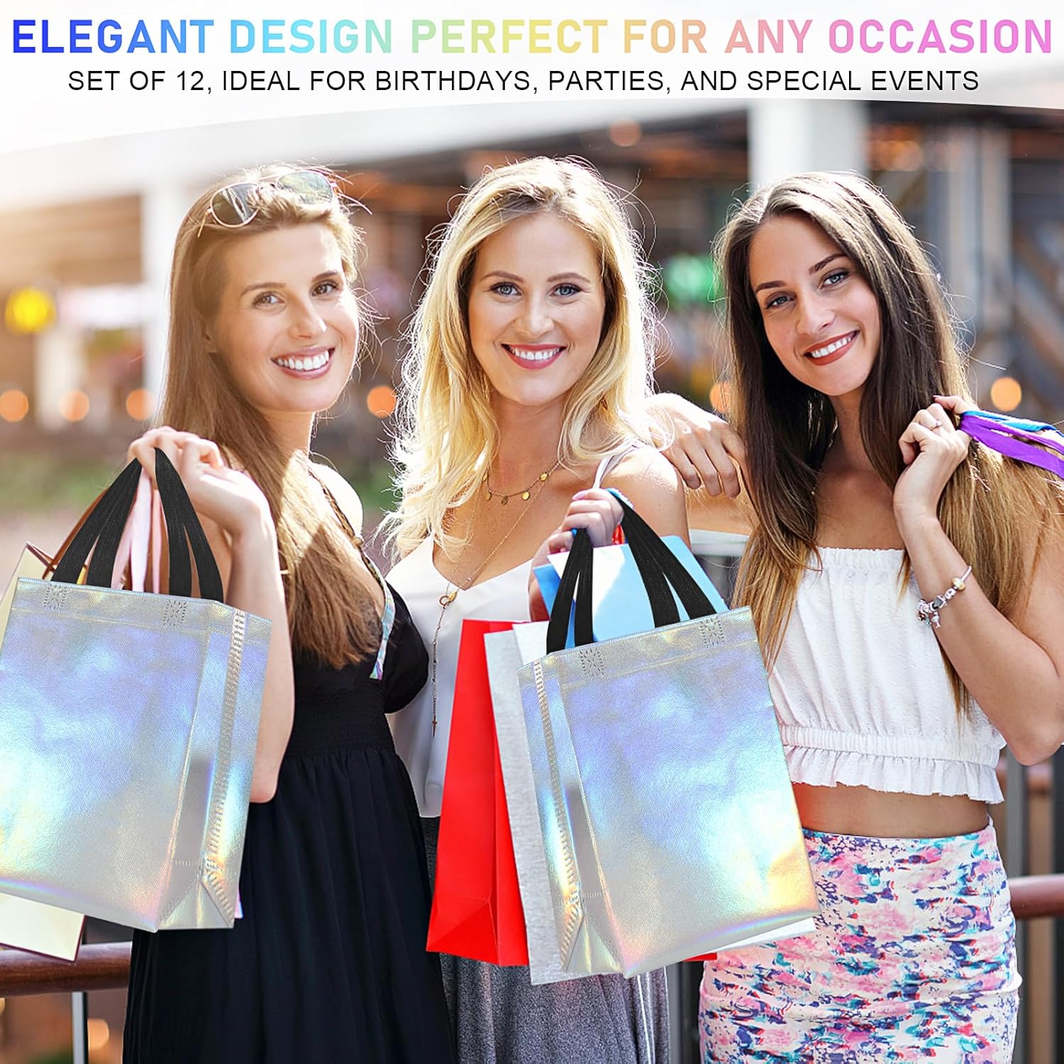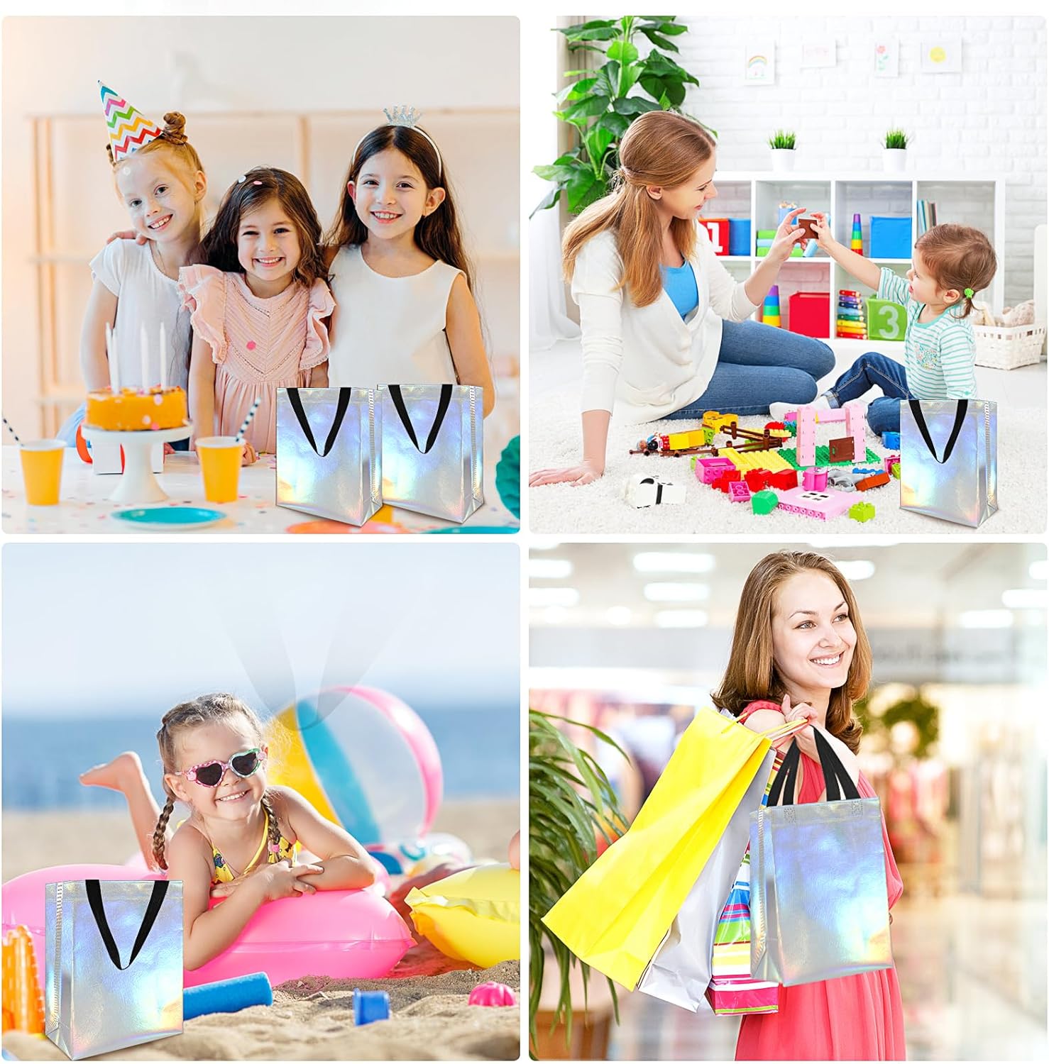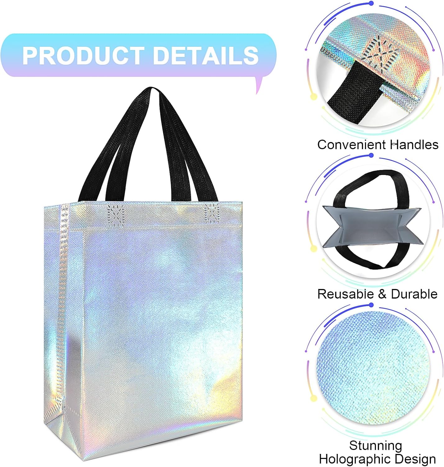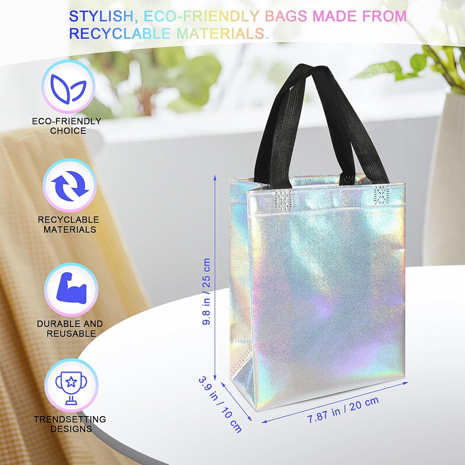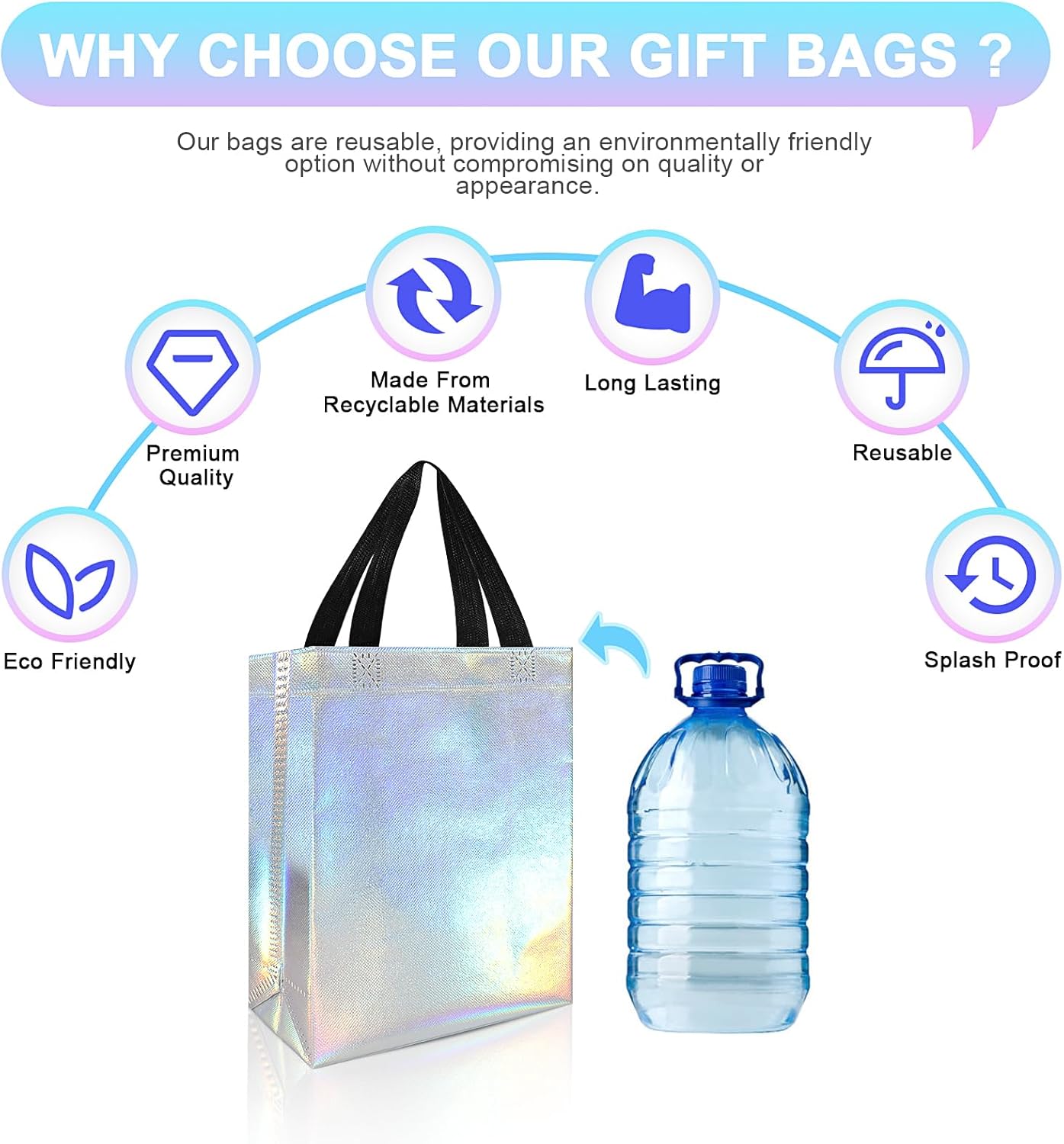 MAGIC Superficie iridescente: trasforma qualsiasi regalo in un'esperienza affascinante con i nostri sacchetti regalo olografici. La loro superficie olografica unica aggiunge un tocco di magia a qualsiasi regalo e lo fa sembrare un tesoro. Che si tratti di un compleanno, di un matrimonio, di un baby shower o anche di sacchetti regalo di Natale, queste confezioni regalo di compleanno di medie dimensioni faranno brillare la tua celebrazione. SPAZIOSE E VERSATILI: Con dimensioni di 11Lx5Wx13H pollici, le nostre borse da festa riutilizzabili offrono spazio sufficiente per regali, bomboniere, dolcetti e gadget. Perfette per varie occasioni, dalle riunioni intime alle grandi feste, queste borse regalo sono una scelta versatile per qualsiasi evento, compreso l'uso come borse da festa riutilizzabili, borse regalo per baby shower, borse per bomboniere o borse per addio al nubilato COMODE MANIGLIE PER UN FACILE TRASPORTO: Progettate con robuste maniglie, le nostre borse regalo di compleanno garantiscono un facile trasporto, consentendo agli ospiti di trasportare facilmente regali e dolcetti. Dì addio al fastidio di destreggiarsi tra più oggetti: i nostri sacchetti regalo multipack rendono il trasporto un gioco da ragazzi. DISTINGUITI CON STILE: fai una dichiarazione con le nostre abbaglianti borse da festa che brillano e brillano con qualsiasi luce. Che tu stia regalando agli amici o facendo scorta per eventi futuri, queste borse lasceranno sicuramente un'impressione duratura. Unisciti a noi e diffondi gioia e magia con ogni regalo che fai. ECOLOGICI E RIUTILIZZABILI: Realizzati in tessuto non tessuto di alta qualità, i nostri sacchetti regalo non sono solo durevoli ma anche ecologici. Riduci gli sprechi riutilizzando questo sacchetto regalo di compleanno per eventi futuri o riciclandolo in modo responsabile quando non è più necessario. Unisciti a noi e dai un contributo positivo all'ambiente festeggiando con stile con le nostre grandi borse regalo