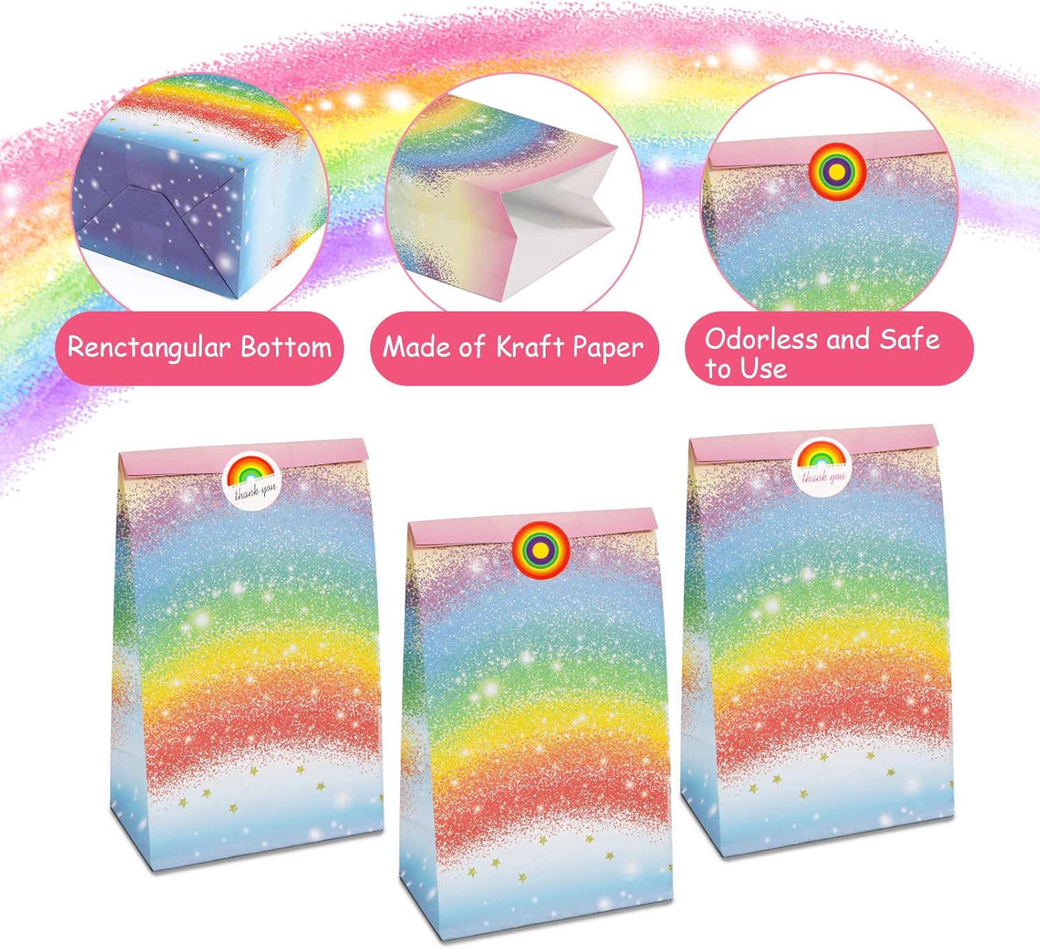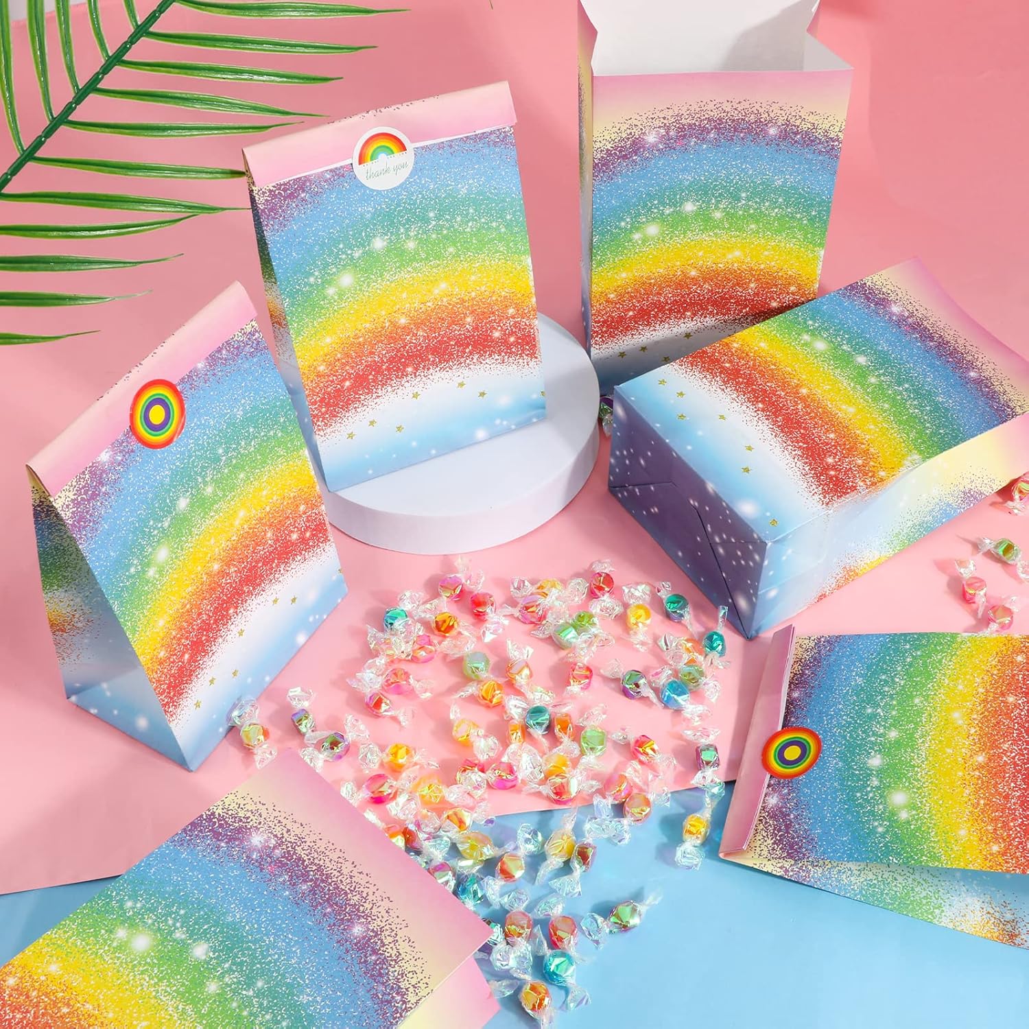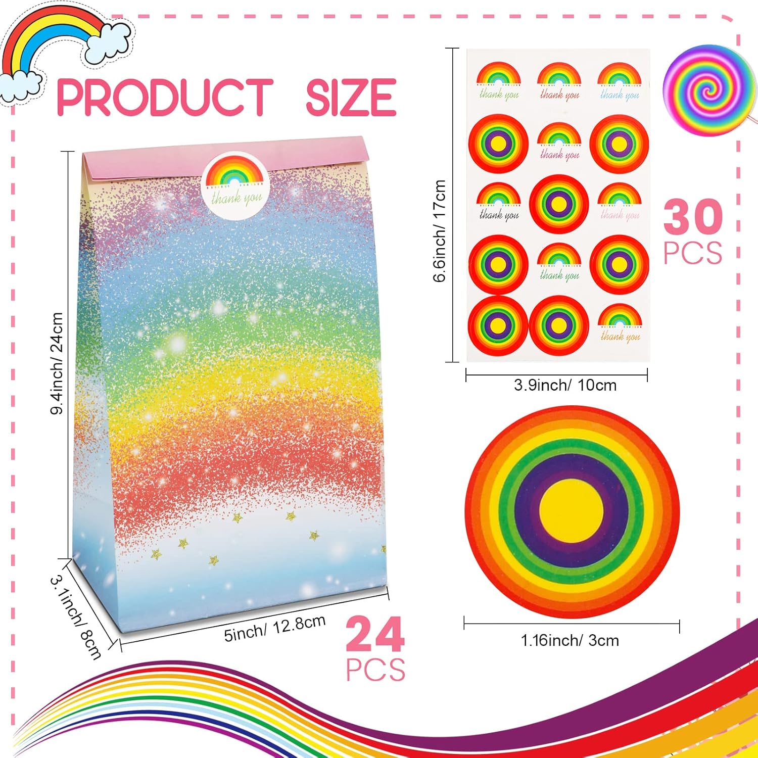 NOTA: questi sacchetti per caramelle arcobaleno sono ideali se stai pianificando una festa di compleanno, un baby shower o un altro evento o celebrazione. Porteranno sicuramente sorrisi alla tua famiglia e ai tuoi ospiti. La confezione include: 24 sacchetti regalo arcobaleno per feste e 30 adesivi arcobaleno con disegni arcobaleno molto carini e belli. Borse da festa arcobaleno: 12,8 * 8 * 24 cm per borsa. Questi sacchetti per dolcetti arcobaleno sono realizzati in carta kraft riciclabile di alta qualità, il fondo rinforzato lo rende molto resistente e non facile da rompere, inoltre non tossico. Adesivi arcobaleno: 30 pezzi, stampati su carta adesiva premium con graziosi disegni arcobaleno in un cerchio da 1,16 pollici. Per sigillare inviti a feste, bottiglie d'acqua, buste, sacchetti arcobaleno, sacchetti festivi, sacchetti di bottino, sacchetti di caramelle e altro ancora!!!