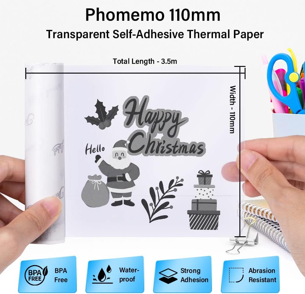 Contenuto della confezione: 3 rotoli di carta adesiva adesiva termotrasparente Phomemo. Dimensioni del prodotto: 110 mm x 3,5 m Compatibile con - Phomemo Mini stampante M04S/M04AS. Forte adesione: aderisce saldamente a diverse superfici come buste, metallo, PVC, plastica, vetro e legno, ecc. Non cade naturalmente. Facile da rimuovere e non lascia residui – non lascia colla. Facile da rimuovere. Ampiamente utilizzato: adatto per album, note di studio, foto in bianco e nero di Bullet Journals e lavori artigianali. Guarda le tue prestazioni di studio e il tuo meraviglioso momento nella vita quotidiana.