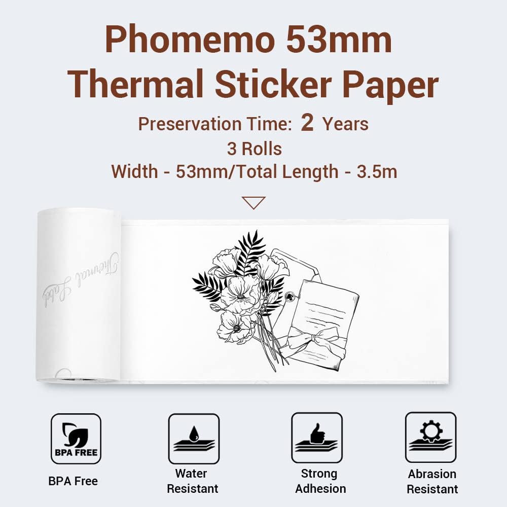 Contenuto della confezione - 3 rotoli di carta adesiva termica autoadesiva Phomemo, dimensioni del prodotto: 53 mm x 3,5 m (3,15" x 137,8"); Compatibile con la mini stampante Phomemo M02/M02S/M02 Pro/M03/M03AS/M04S/M04AS. 2 anni di conservazione - Lo strato di rivestimento sulla superficie protegge il contenuto dallo sbiadimento o dalla distruzione. Le carte per stampanti termiche Phomemo M02/M02S/M02 Pro/M03/M03AS sono prive di BPA, impermeabili, antiolio, antistrappo e antigraffio. Forte adesione: aderisce saldamente a diverse superfici come buste, metallo, PVC, plastica, vetro e legno, ecc. Non cadrà naturalmente. Facile da rimuovere e nessun residuo lasciato - La carta autoadesiva Phomemo M03/M03AS non lascia colla dopo essere stata strappata. Facile da rimuovere. Ampio utilizzo - adatto per album, appunti di studio, foto in bianco e nero di diario di proiettili e artigianato fai-da-te. Testimonia i tuoi risultati nello studio e il tempo meraviglioso nella vita quotidiana.