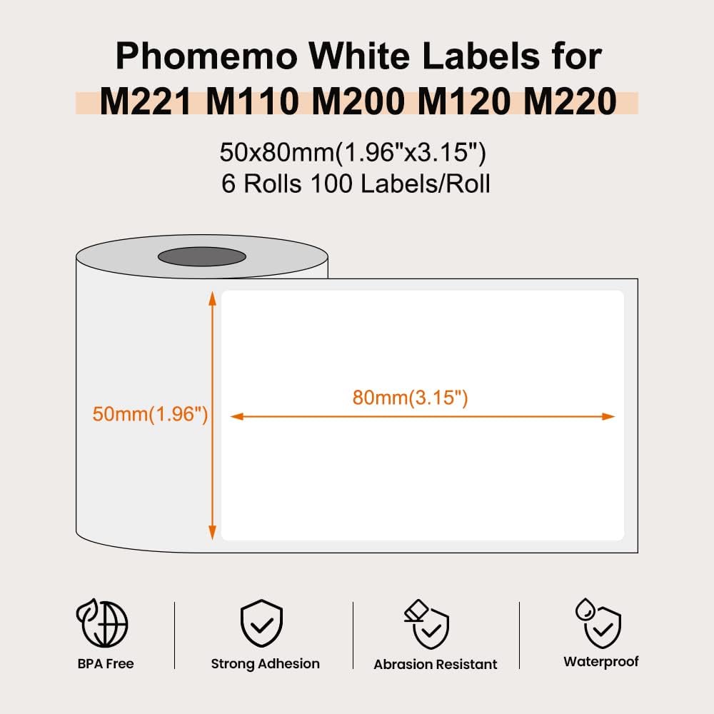 Contenuto della confezione: 3 rotoli di etichette termiche autoadesive Phomemo. Dimensioni del prodotto: 50 mm x 80 mm (1,97 pollici x 3,15 pollici), compatibile con la stampante per etichette Phomemo M110/M220/M221/M200/M120/M100/M108/M150/M250/M260. 100 etichette per rotolo 10 anni di durata: un rivestimento sulla superficie protegge il contenuto dallo sbiadimento o dalla distruzione. Privo di BPA, impermeabile, resistente all'olio, resistente agli strappi e ai graffi Forte aderenza: si attacca saldamente a diverse superfici come buste, metallo, PVC, plastica, vetro e legno, ecc. Non cade da solo Facile da rimuovere e senza lasciare residui: la carta autoadesiva Phomemo M110/M220/M221/M200/M120/M100/M108/M150/M250/M260 non lascerà colla dopo la rimozione. Facile da rimuovere Ampia applicazione: adatto per etichette commerciali, espresse, indirizzi, codici a barre, codice QR, deposito a casa, etichette di abbigliamento e cartellini dei prezzi. Costo-efficace ed efficiente