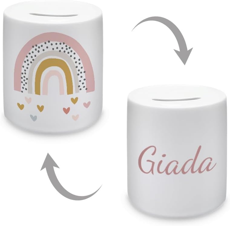 Regalo personalizzato: questo esclusivo salvadanaio in ceramica può essere personalizzato con il nome di tuo figlio. Versatile: il salvadanaio personalizzato è un regalo ideale per l'inizio della scuola, battesimi, compleanni o Natale. Materiale di alta qualità: il salvadanaio è realizzato in ceramica resistente ed è adatto sia a ragazzi che a ragazze. Pratica confezione regalo per soldi: il salvadanaio non serve solo come salvadanaio decorativo, ma anche come pratica confezione per regali in denaro. Design unico: con il suo aspetto carino, questo salvadanaio personalizzato attirerà l'attenzione in ogni cameretta.