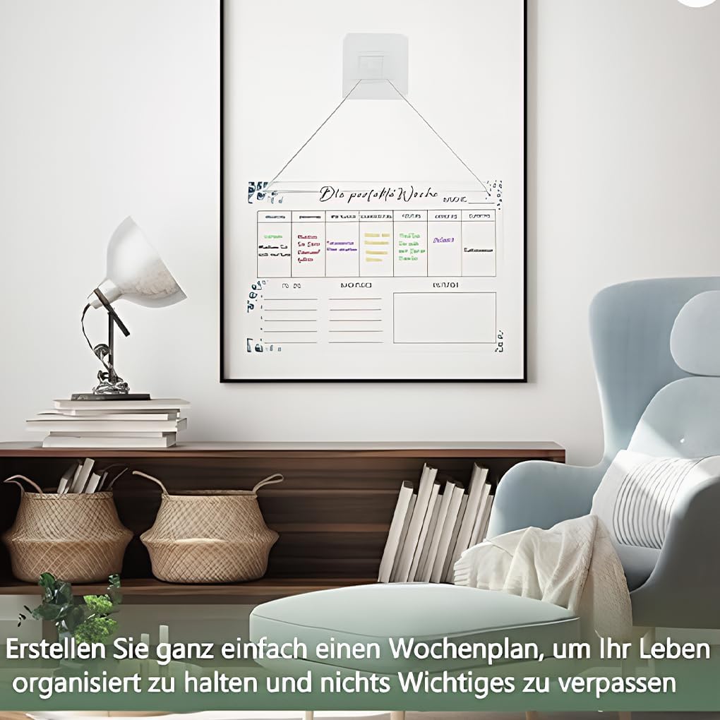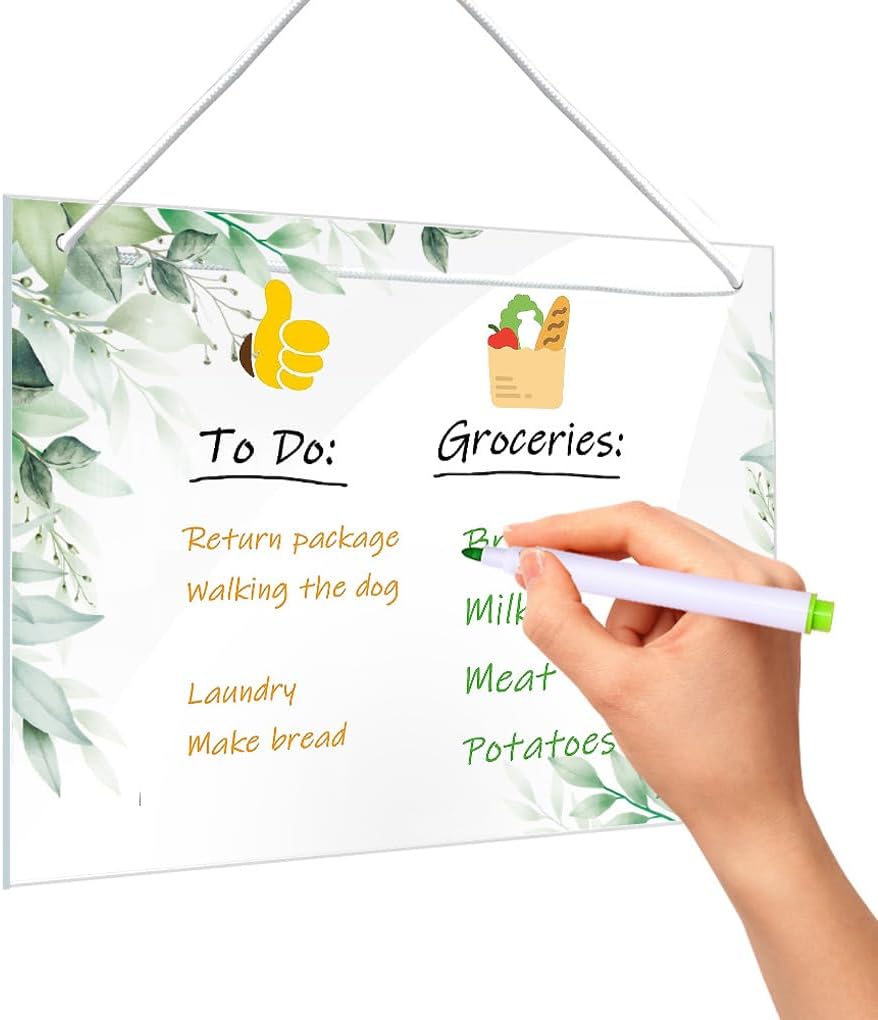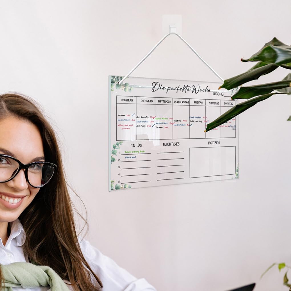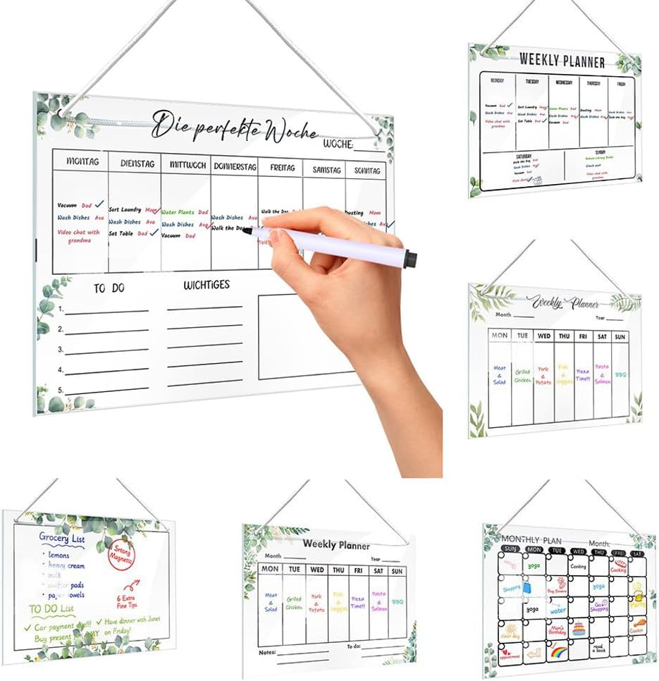 Set agenda settimanale: questa lavagna settimanale in acrilico è ideale per l'organizzazione quotidiana. Il suo design a compartimenti ti consente di descrivere più contenuti, per una pianificazione e pianificazione precisa della tua vita quotidiana; un ottimo strumento per migliorare le tue capacità organizzative. Materiale premium: realizzata in acrilico di alta qualità, questa agenda settimanale trasparente e cancellabile è durevole e scrivibile. L'installazione non richiede fori e la pulizia è semplice: è sufficiente passarla con una gomma e un panno umido per ripristinarla. Design sospeso: questa agenda settimanale cancellabile ha due fori per l'installazione senza perforazione. Il cavo di sospensione incluso consente un facile montaggio a parete sul frigorifero. I pennarelli aderiscono saldamente ai frigoriferi e ad altre superfici metalliche, impedendo di scivolare. Elegante essenziale: questa agenda familiare trasparente da appendere dona un tocco di eleganza moderna a qualsiasi spazio. Il suo design minimalista si adatta perfettamente a vari stili di decorazione d'interni. Il layout settimanale ti assicura di non dimenticare mai le attività importanti. Utilizzo versatile: questa agenda settimanale ti consente di gestire facilmente le tue attività importanti, come riunioni, appuntamenti, liste della spesa, menu, obiettivi settimanali, faccende domestiche, compleanni di famiglia e altri eventi importanti. Ideale per la cucina, la camera da letto, la scuola domestica e l'ufficio