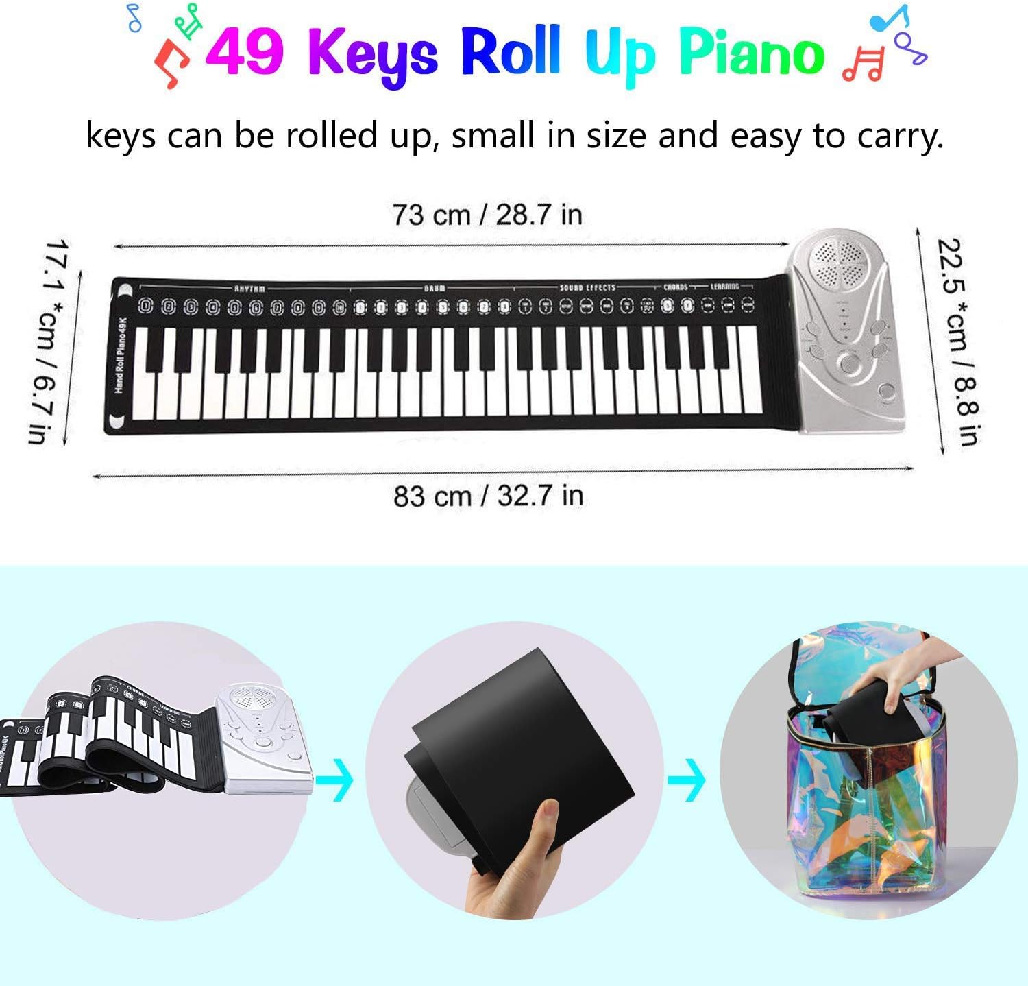 Giocattolo musicale arrotolabile: realizzato in gomma siliconica altamente resistente e flessibile, si arrotola facilmente per riporlo e trasportarlo ovunque. 【Ottimo pianoforte per principianti】 È un'ottima attrezzatura musicale per consentire ai bambini di sviluppare interessi. 29 tasti bianchi e 10 tasti neri, tastiera divisa in quattro aree, inclusi 10 tasti ritmici, 8 tasti batteria, 7 tasti effetti sonori, 2 tasti accordi e 3 tasti di apprendimento Altoparlante e pannello di controllo integrati, alimentato da DC 6 V (presa a muro per interni) o 3 batterie AA (per uso esterno). Funzioni di registrazione e riproduzione Ideale come regalo di compleanno o di Natale per i bambini. 6 brani demo incorporati per tutorial