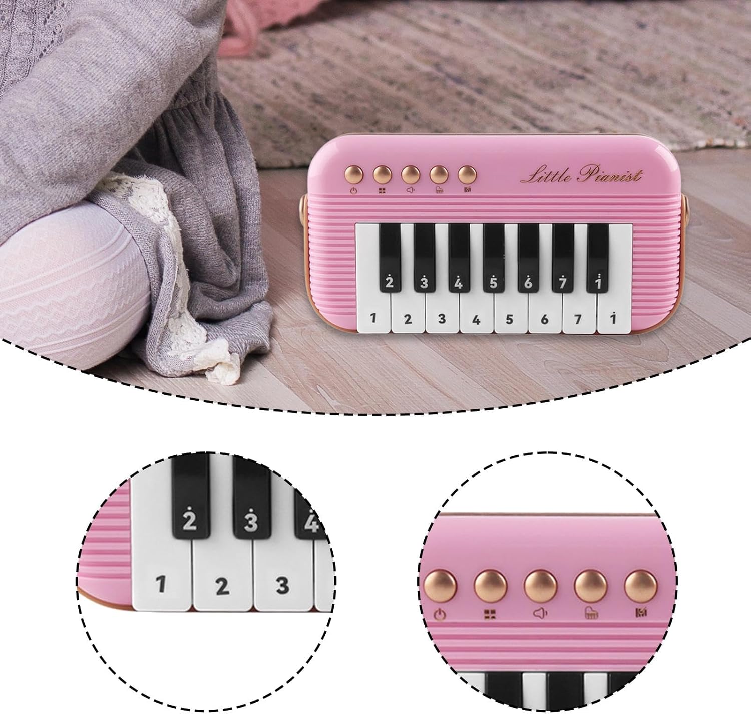 【Facile da imparare】: il pianoforte elettronico da dito è dotato di spartiti facili da seguire e filastrocche orecchiabili, questo giocattolo è facile da suonare anche per le persone inesperte, rendendo l'apprendimento divertente e accessibile a tutti i bambini 【Design portatile】: il giocattolo per pianoforte per bambini ha dimensioni compatte (7 cm x 9 cm x 4 cm / 2,76 pollici x 3,54 pollici x 1,57 pollici) che sono comode da trasportare per le manine dei più piccoli, consentendo al tuo bambino di imparare e godersi la musica sempre e ovunque 【Struttura robusta】: il pianoforte tascabile musicale è realizzato in PP per resistere all'entusiasmo dei bambini che giocano garantendo al contempo il loro 【Molteplici opzioni sonore】: il mini pianoforte elettronico offre una varietà di suoni strumentali, consentendo al bambino di passare da stile all'altro senza sforzo. Con il semplice tocco di un pulsante, può passare dai suoni del pianoforte a quelli dello xilofono, soddisfacendo una varietà di preferenze e mantenendolo impegnato. 【Sviluppa le abilità musicali】: la tastiera elettrica per bambini è progettata per migliorare la destrezza delle dita del tuo bambino, coltivando il suo musicale e il suo . Con il suo design a 15 tasti, è adatta ai principianti per iniziare il loro viaggio musicale e diventare piccoli.