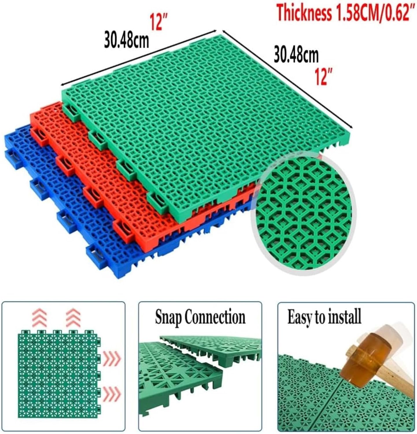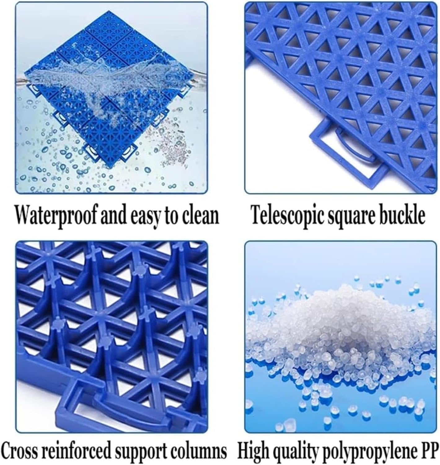 Queste piastrelle per pavimenti in plastica ad incastro da 30,48 cm / 12 pollici sono realizzate con una miscela premium di polipropilene (PP), che garantisce che siano atossiche, inodori ed eccezionalmente resistenti. Con uno spessore di 1,58 cm / 0,62 pollici, forniscono una soluzione di pavimentazione sicura e duratura. Progettate per drenare rapidamente le pozzanghere, queste piastrelle sono perfette per l'uso all'aperto in qualsiasi condizione atmosferica, pioggia o sole Ogni piastrella presenta un design modulare a cuscino con fibbie quadrate e spesse che scattano saldamente in posizione Ideali per campi sportivi, scuole e parchi giochi, sono perfetti anche per ponti marini, garage sotterranei, piscine, spogliatoi, spa, saune e qualsiasi area che richieda una sicurezza antiscivolo. Che tu stia coprendo una vasta area o un piccolo spazio, queste piastrelle offrono un sistema di pavimentazione flessibile ed espandibile che si adatta alle tue esigenze