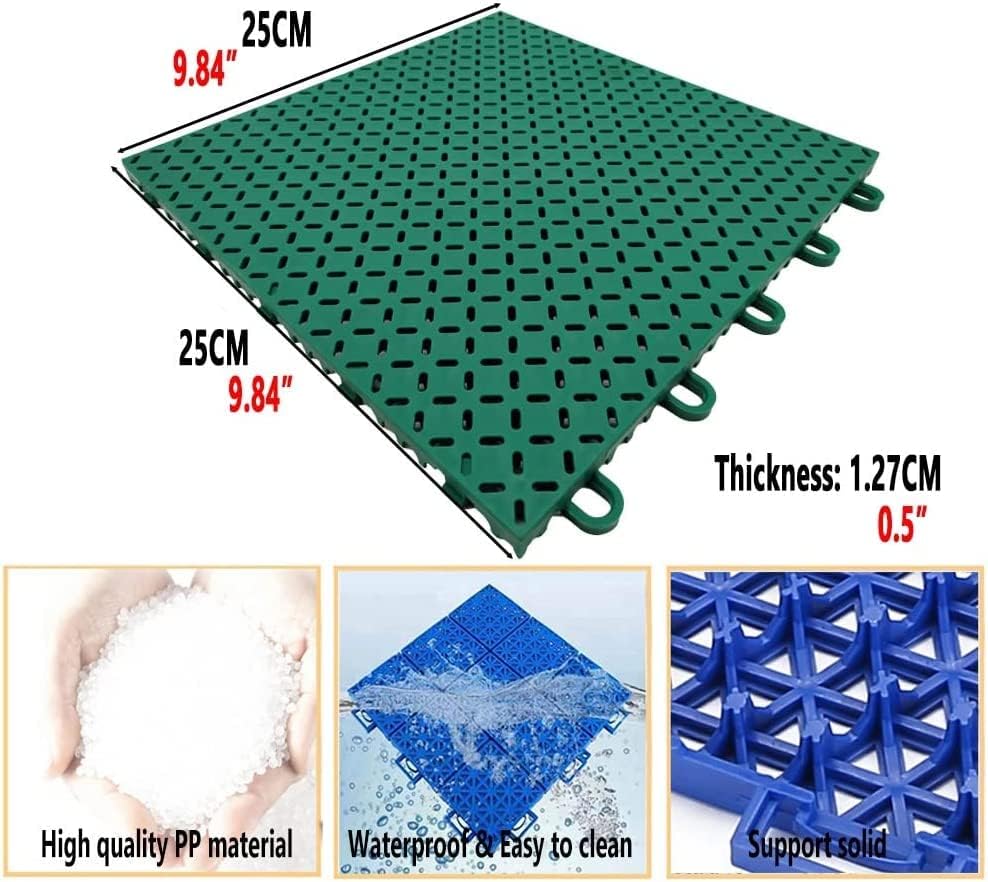 DESIGN RESISTENTE ALLE INTEMPERIE: Progettate per dissipare all'istante le pozzanghere durante le partite, con la pioggia o con il sole, queste piastrelle ad incastro per esterni offrono una superficie antiscivolo resistente alle intemperie che non sbiadisce e non ostacola il rimbalzo delle palle o i crossover micidiali. Tappetino multiuso e confortevole: i nostri tappetini drenanti sono ampiamente utilizzati in ambito commerciale e residenziale. Ideali per bar, cucine, ristoranti, piscine, bagni, esterni, barche, lavanderie e ovunque siano necessarie piastrelle antiscivolo. CONNESSIONE SICURA: Piastrelle modulari ad incastro, design con fibbia quadrata e spessa, non facili da spostare e deformare anche sotto forti impatti di forze esterne. MATERIALE SICURO E DUREVOLE: le piastrelle per pavimenti in plastica ad incastro sono realizzate con una miscela di PP di alta qualità, durevole e sicura. PIASTRELLE PER PAVIMENTI: Campi da tennis, dodgeball, squash e basket più resistenti per gli sport all'aria aperta; colori multipli e infinite possibilità di espansione consentono di personalizzare il design e le linee di demarcazione in base alle proprie esigenze.