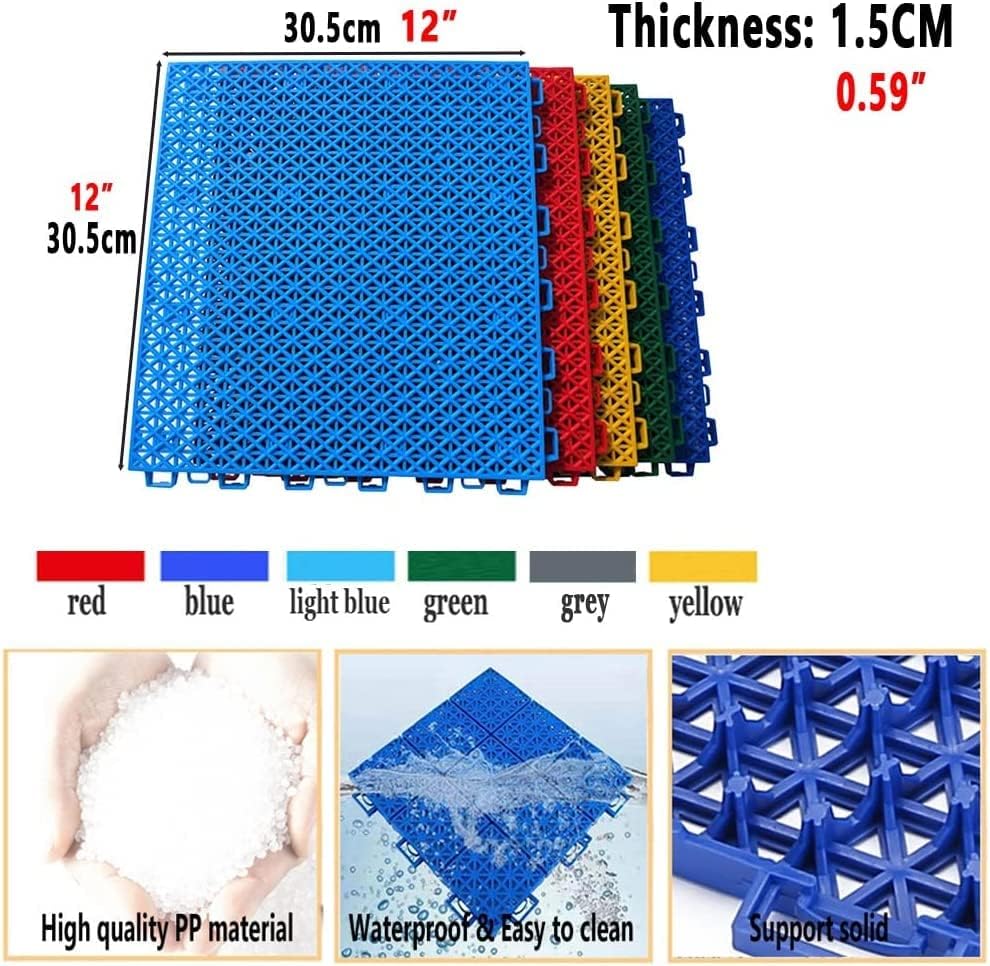 Design resistente alle intemperie: progettate per drenare rapidamente l'acqua, queste piastrelle ad incastro per esterni forniscono una superficie sicura e antiscivolo che mantiene la presa, garantendo prestazioni ottimali durante i giochi indipendentemente dalle condizioni atmosferiche. Uso versatile: i nostri tappetini di drenaggio sono perfetti sia per ambienti commerciali che residenziali. Sono ideali per bar, cucine, ristoranti, piscine, bagni, aree esterne, barche, lavanderie e qualsiasi luogo in cui sono necessarie piastrelle antiscivolo. Fissaggio sicuro: caratterizzate da un design modulare con spesse fibbie quadrate, queste piastrelle sono saldamente collegate e resistenti allo spostamento o alla deformazione anche se sottoposte a impatti significativi. Sicure e durevoli: realizzate con una miscela di polipropilene di alta qualità, queste piastrelle in plastica ad incastro offrono una durata eccezionale garantendo al contempo la sicurezza per tutti gli utenti. Piastrelle per pavimenti personalizzabili: perfette per creare campi robusti per tennis, dodgeball, squash e basket, queste piastrelle sono disponibili in diversi colori e consentono un'espansione infinita, consentendo di personalizzare il design e i confini alle tue esigenze specifiche.