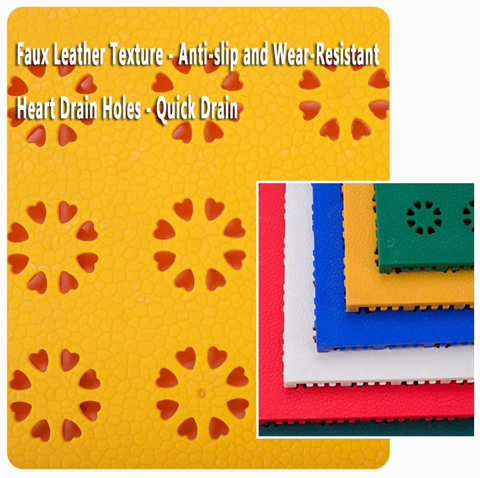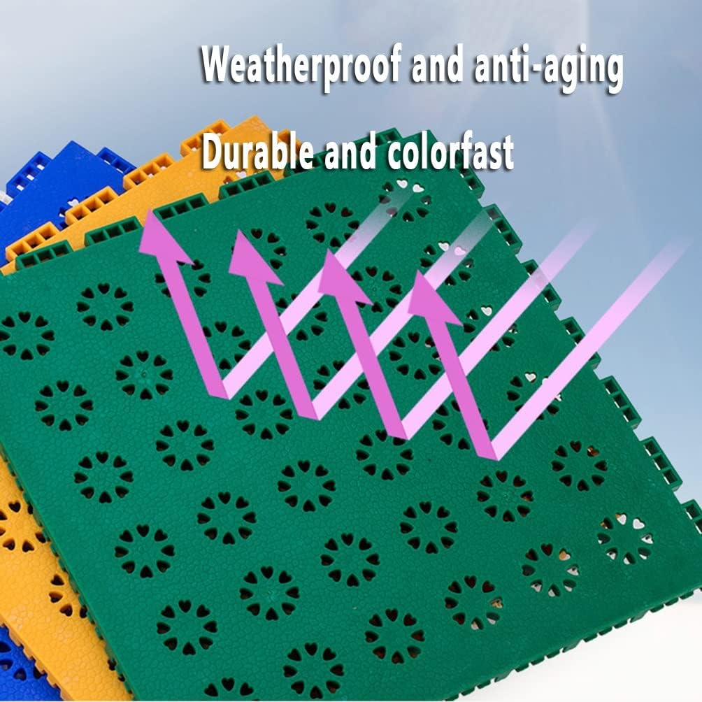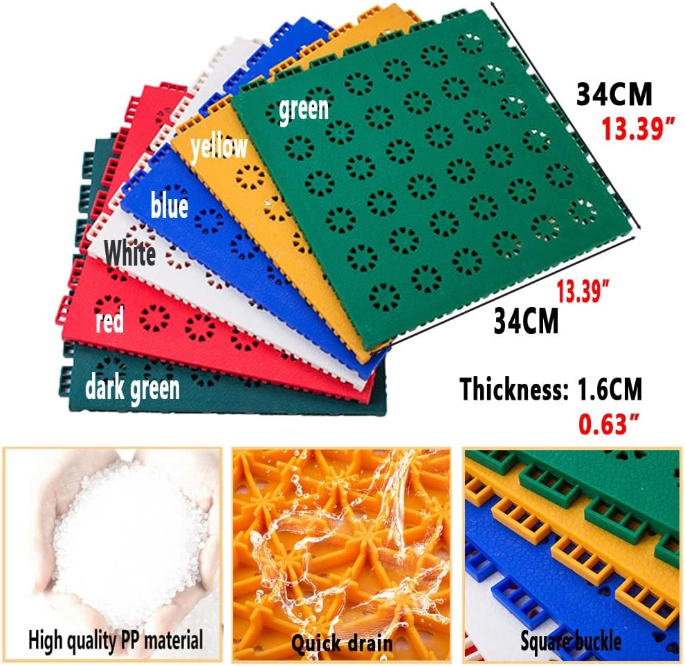Materiale sicuro e durevole: le piastrelle per pavimenti in plastica ad incastro da 25 cm/9,84 pollici sono realizzate con una miscela di PP di alta qualità, atossiche e inodori, resistenti e sicure. (lo spessore è di 0,63 pollici/1,6 cm) Costruisci un campo da campionato in pochi minuti! Campi da tennis, dodgeball, squash e basket più resistenti per gli sport all'aria aperta; diversi colori e un'espandibilità infinita ti consentono di personalizzare il design e le linee di confine in base alle tue esigenze. Design resistente alle intemperie: progettate per dissipare all'istante le pozzanghere durante le partite, con qualsiasi tempo, queste piastrelle ad incastro per esterni offrono una superficie antiscivolo resistente alle intemperie che non sbiadisce a causa dei raggi UV e non ostacola il rimbalzo delle palle o i crossover micidiali. Collegamento sicuro: piastrelle modulari ad incastro, design con fibbia quadrata e spessa, non facili da spostare e deformare anche in caso di forti impatti di forze esterne. Multiuso: i nostri tappeti drenanti autobloccanti sono ampiamente utilizzati in ambito commerciale e residenziale. Possono essere installati in stadi, scuole, parchi giochi e possono essere utilizzati anche su pavimenti di navi, garage sotterranei, piscine, spogliatoi, vasche idromassaggio, saune/SPA e ovunque siano necessarie piastrelle antiscivolo.