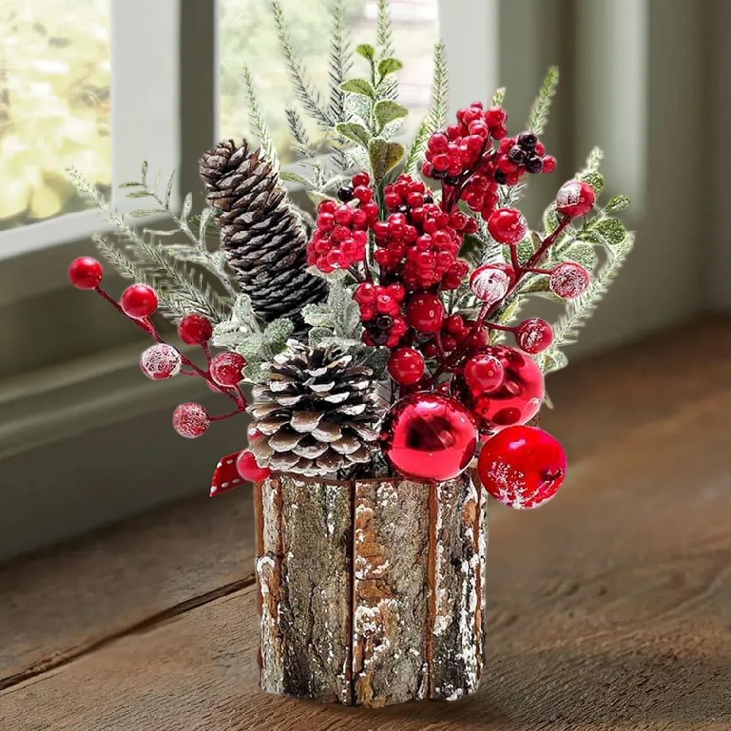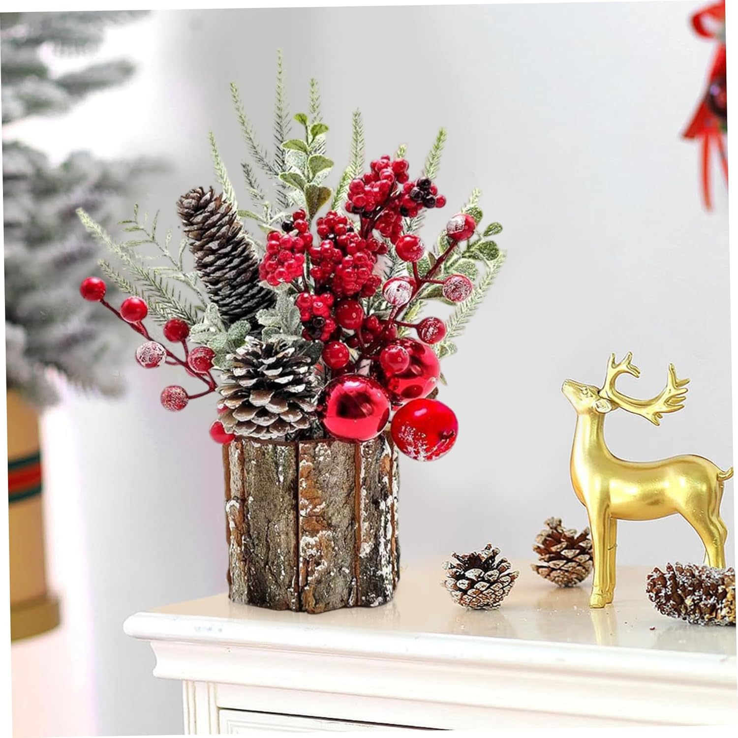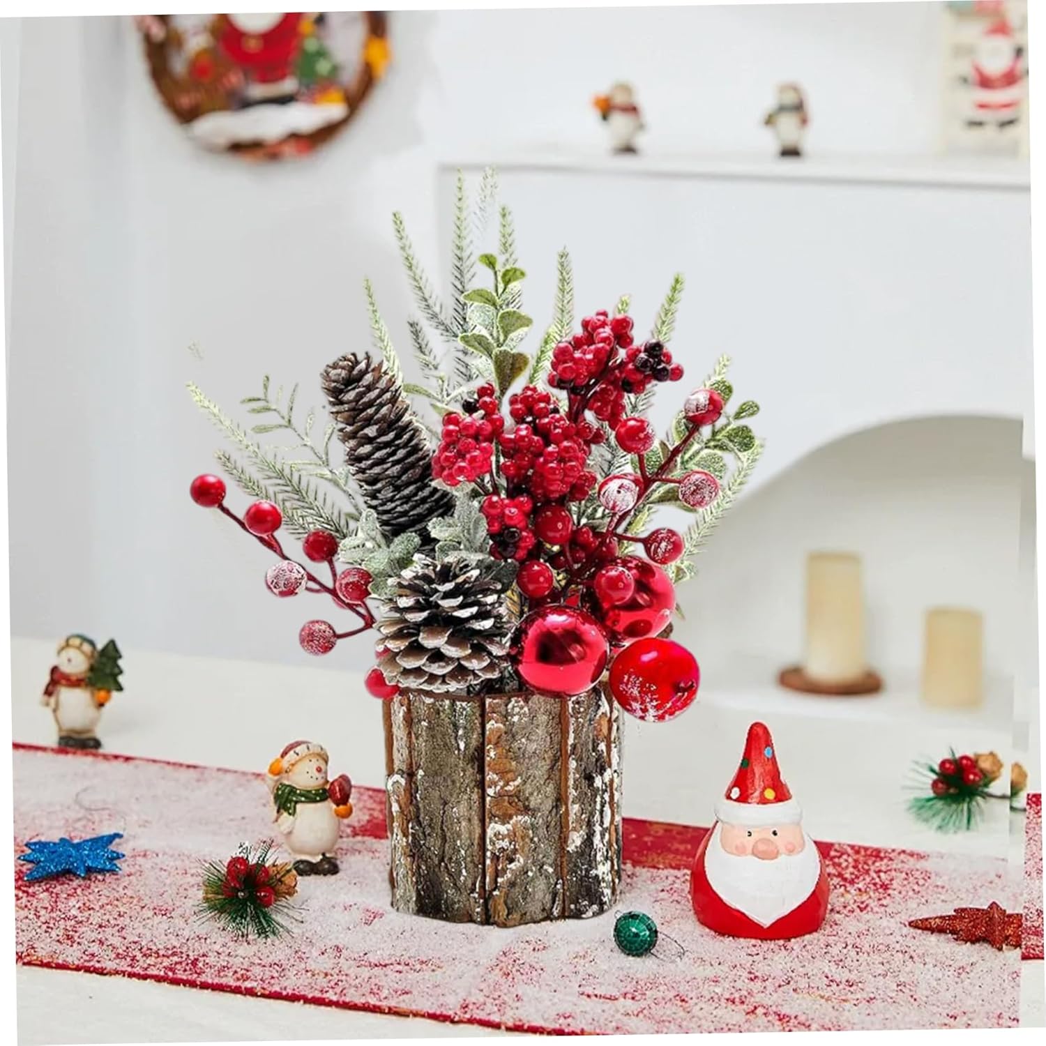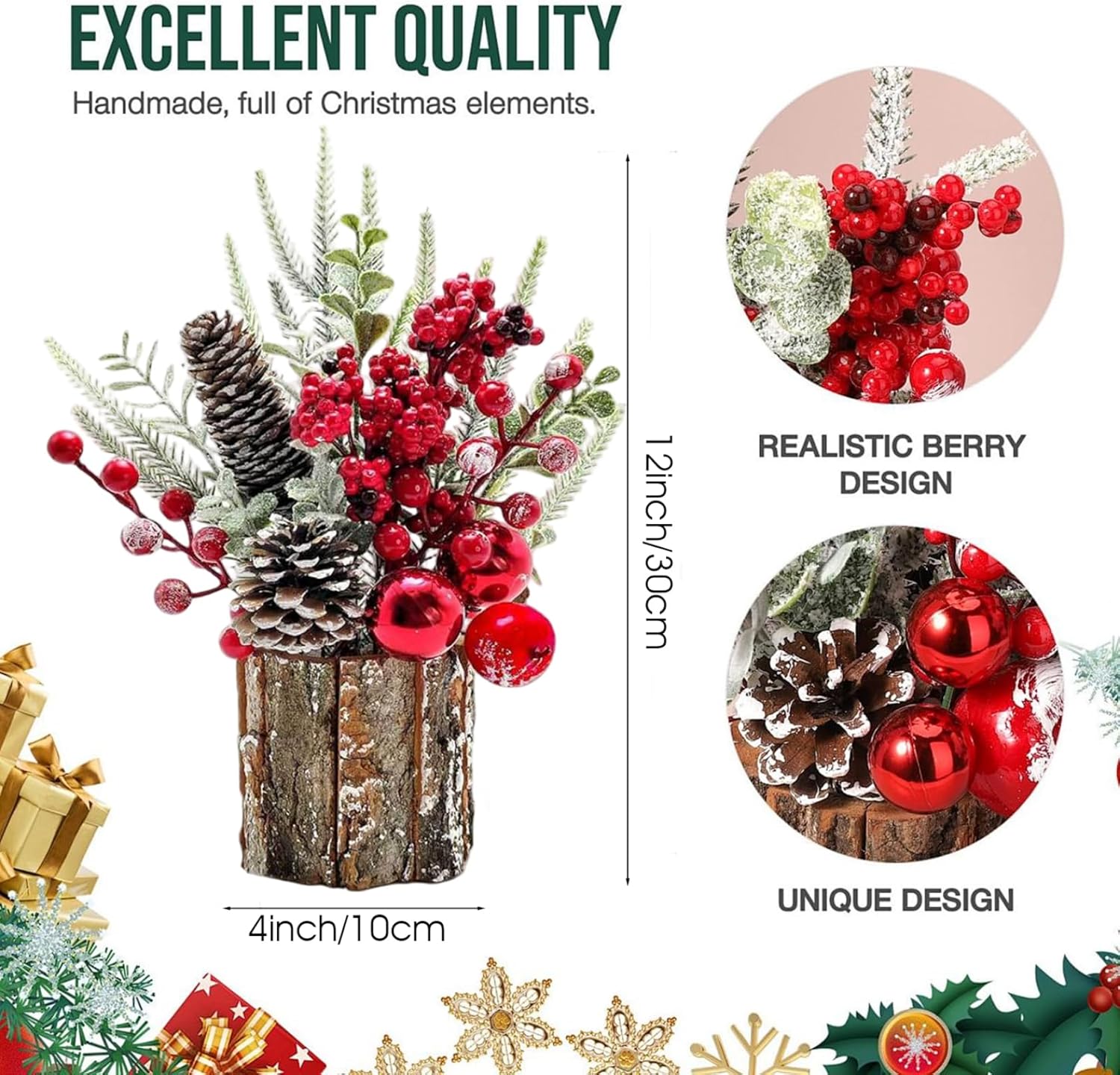 Decorazione natalizia versatile: perfettamente dimensionato per caminetti, mensole e tavoli festivi, questo centrotavola natalizio si fonde perfettamente con altre decorazioni pur essendo un affascinante accento stagionale Materiali di alta qualità: realizzato in materiali PE, questo mini albero di Natale resiste all'uso stagionale con fogliame duraturo e dettagli dettagliati che prevengono sbiadimenti o danni nel tempo Facile posizionamento e manutenzione: leggero e compatto, non richiede assemblaggio e manutenzione minima, ideale per gli utenti impegnati che desiderano decorazioni per la tavola natalizie senza problemi ma eleganti Migliora l'atmosfera festiva: questo centrotavola natalizio è progettato per evocare calore e allegria festosa, creando un'atmosfera accogliente che arricchirà sia le riunioni informali che le celebrazioni formali delle festività. Ciondolo festivo in miniatura: questo piccolo albero di Natale (10 x 30 cm) presenta rami verdi decorati con bacche rosso vivo e pigne realistiche sono accentuati e portano un'accogliente atmosfera vacanziera in ogni stanza, sia a casa, in ufficio o sul tavolo