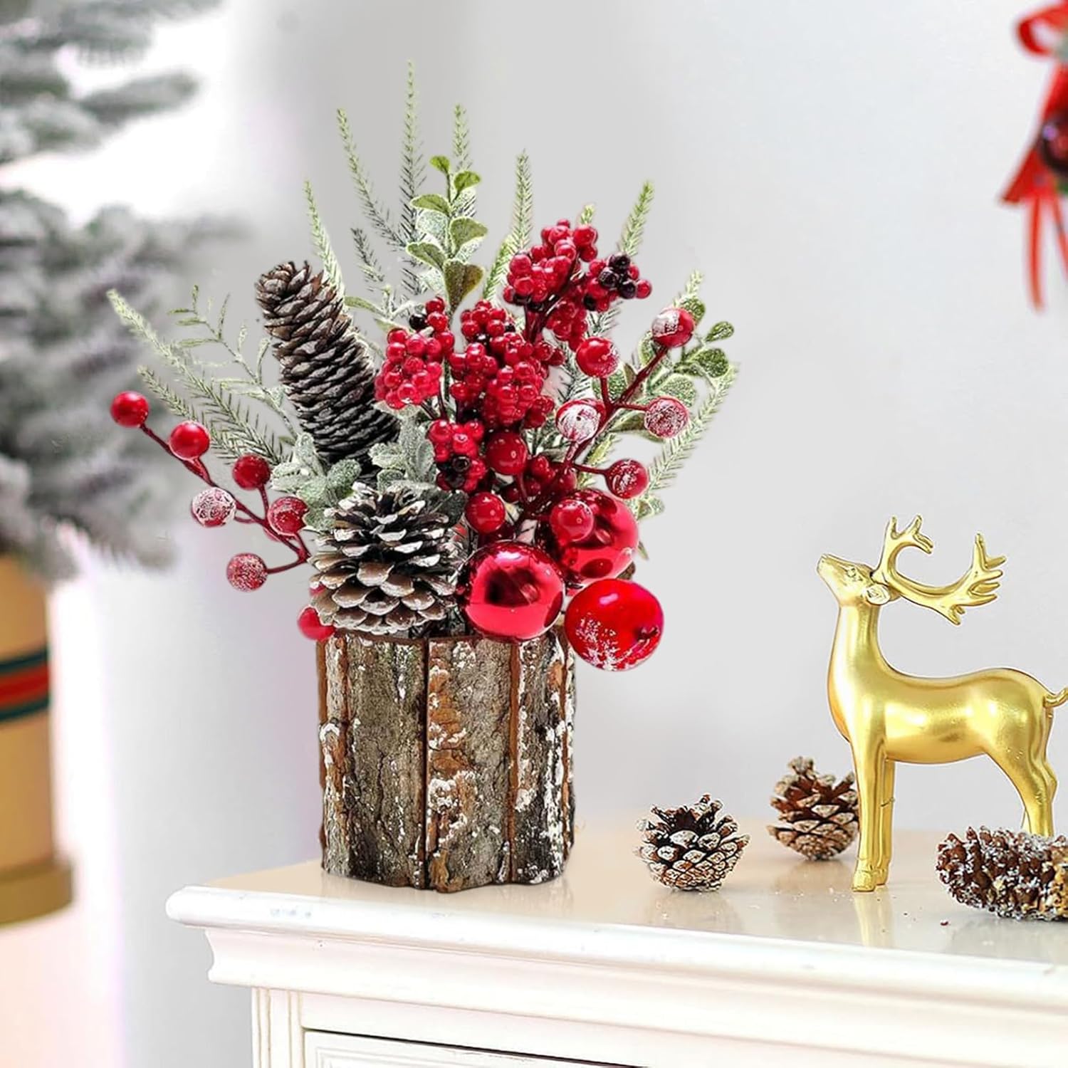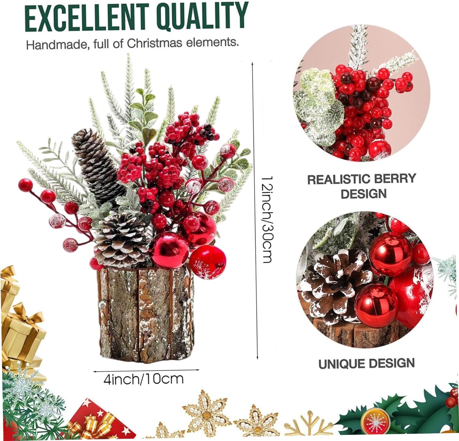 Decorazione natalizia versatile: perfettamente dimensionato per caminetti, mensole e tavoli festivi, questo centrotavola natalizio si fonde perfettamente con altre decorazioni pur essendo un affascinante accento stagionale Materiali di alta qualità: realizzato in materiali PE, questo mini albero di Natale resiste all'uso stagionale con fogliame duraturo e dettagli dettagliati che prevengono sbiadimenti o danni nel tempo Facile posizionamento e manutenzione: leggero e compatto, non richiede assemblaggio e manutenzione minima, ideale per gli utenti impegnati che desiderano decorazioni per la tavola natalizie senza problemi ma eleganti Migliora l'atmosfera festiva: questo centrotavola natalizio è progettato per evocare calore e allegria festosa, creando un'atmosfera accogliente che arricchirà sia le riunioni informali che le celebrazioni formali delle festività. Ciondolo festivo in miniatura: questo piccolo albero di Natale (10 x 30 cm) presenta rami verdi decorati con bacche rosso vivo e pigne realistiche sono accentuati e portano un'accogliente atmosfera vacanziera in ogni stanza, sia a casa, in ufficio o sul tavolo