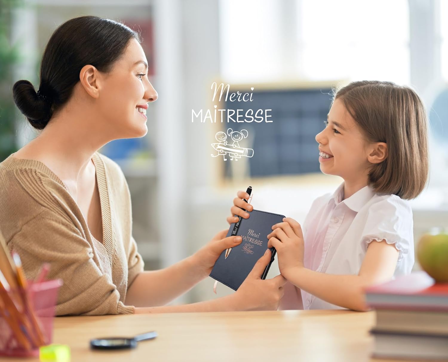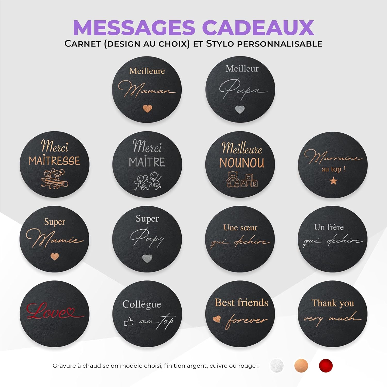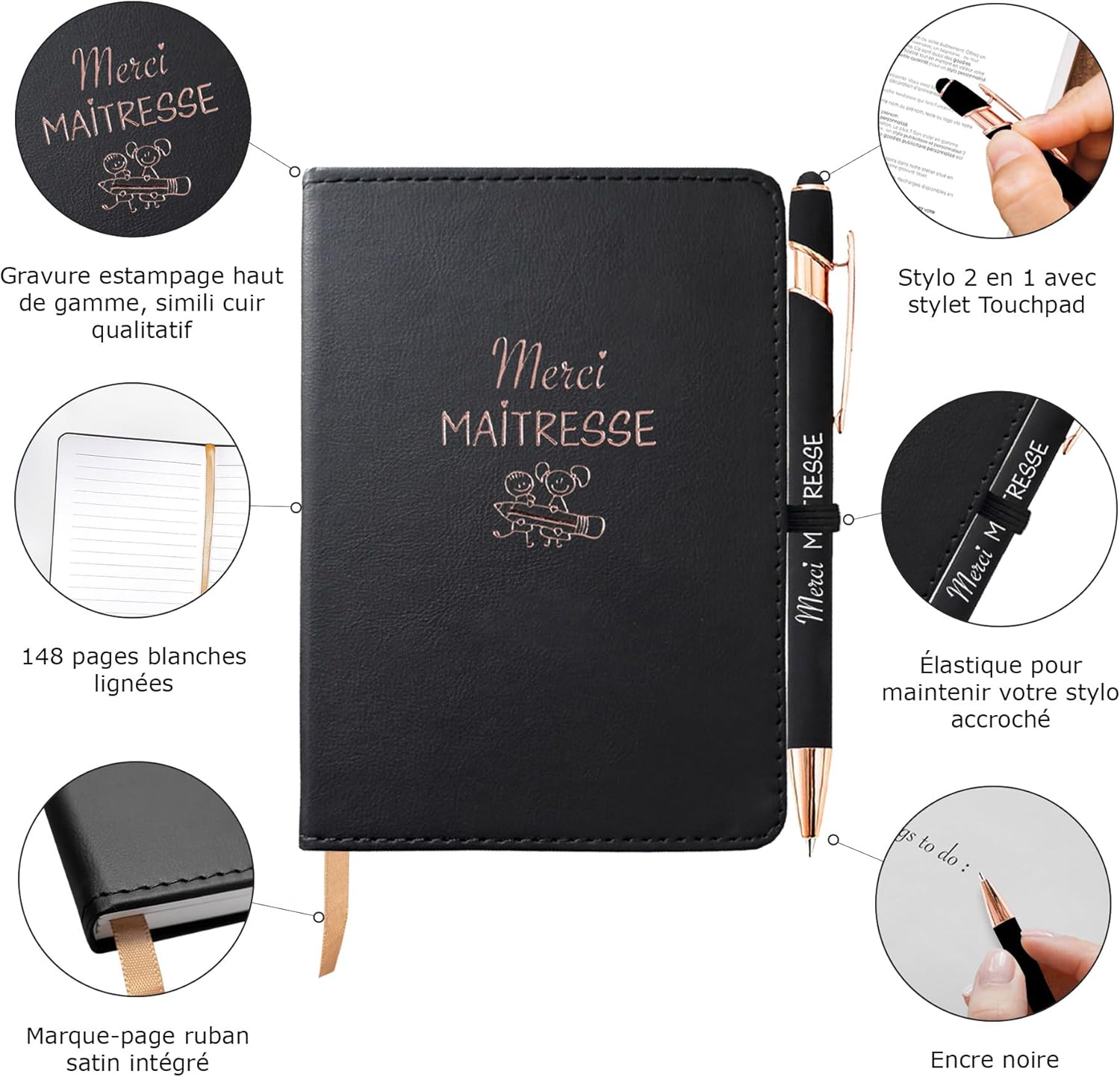 Regalo ideale per ringraziare l'insegnante, il maestro o l'atsem di tuo figlio Dimensioni: 11 x 15 cm Un regalo personalizzato per prendere appunti che seguiranno l'insegnante per l'anno successivo Personalizzazione del taccuino in finitura Rame per un look esclusivo Penna Copper Edition abbinata con incisione laser bianca Segnalibro integrato Nastro in rame effetto satinato Copertina in ecopelle con angoli arrotondati ed elastico per tenere appesa la penna 184 Pagine a righe bianche