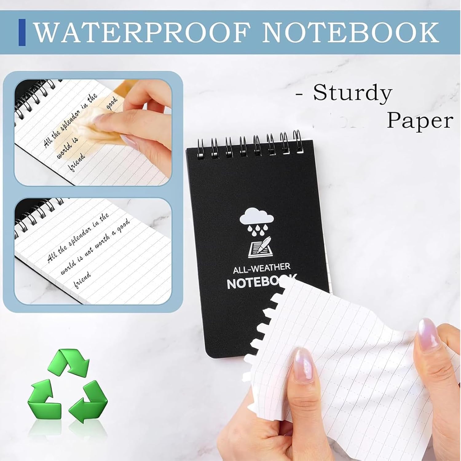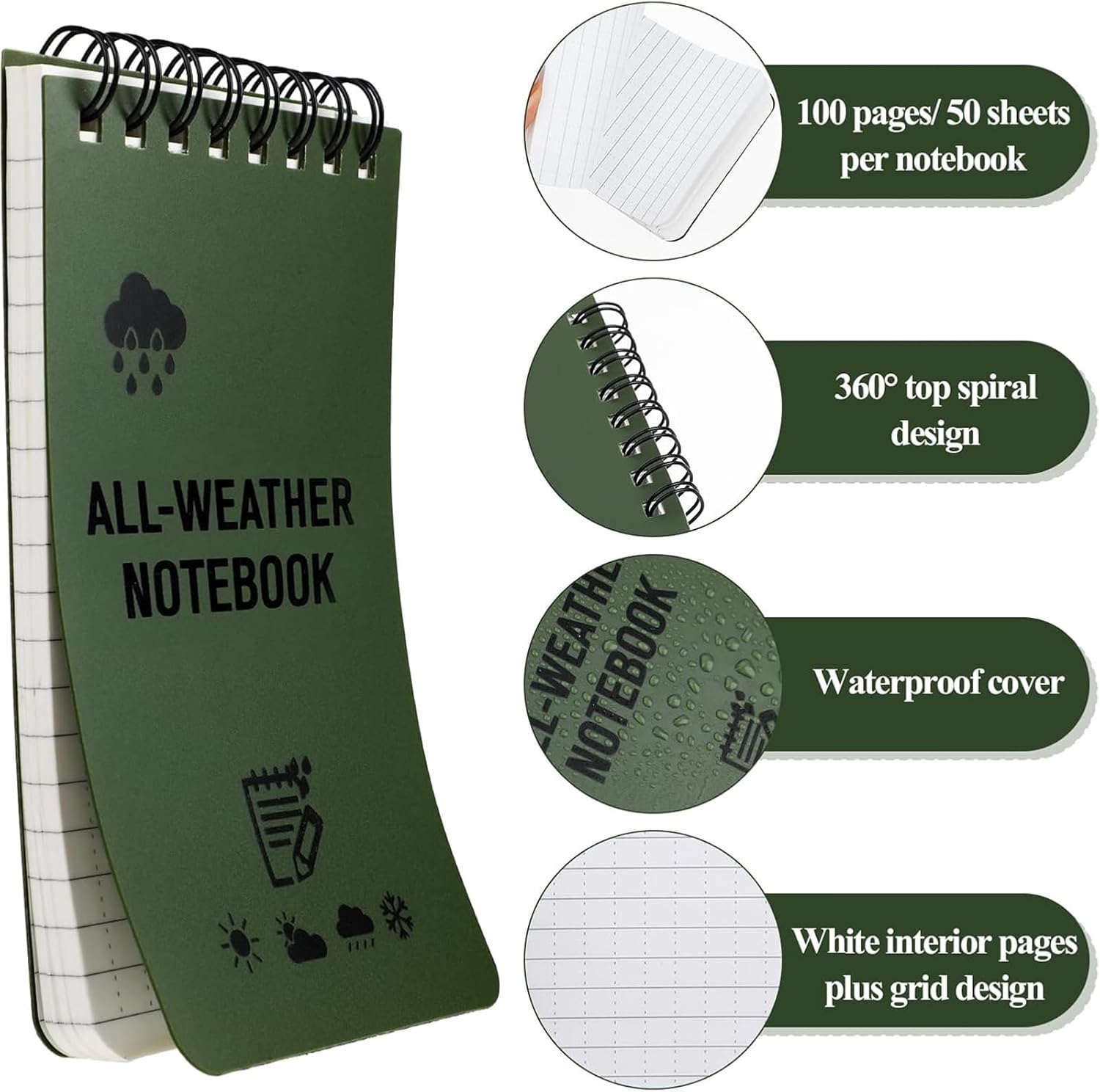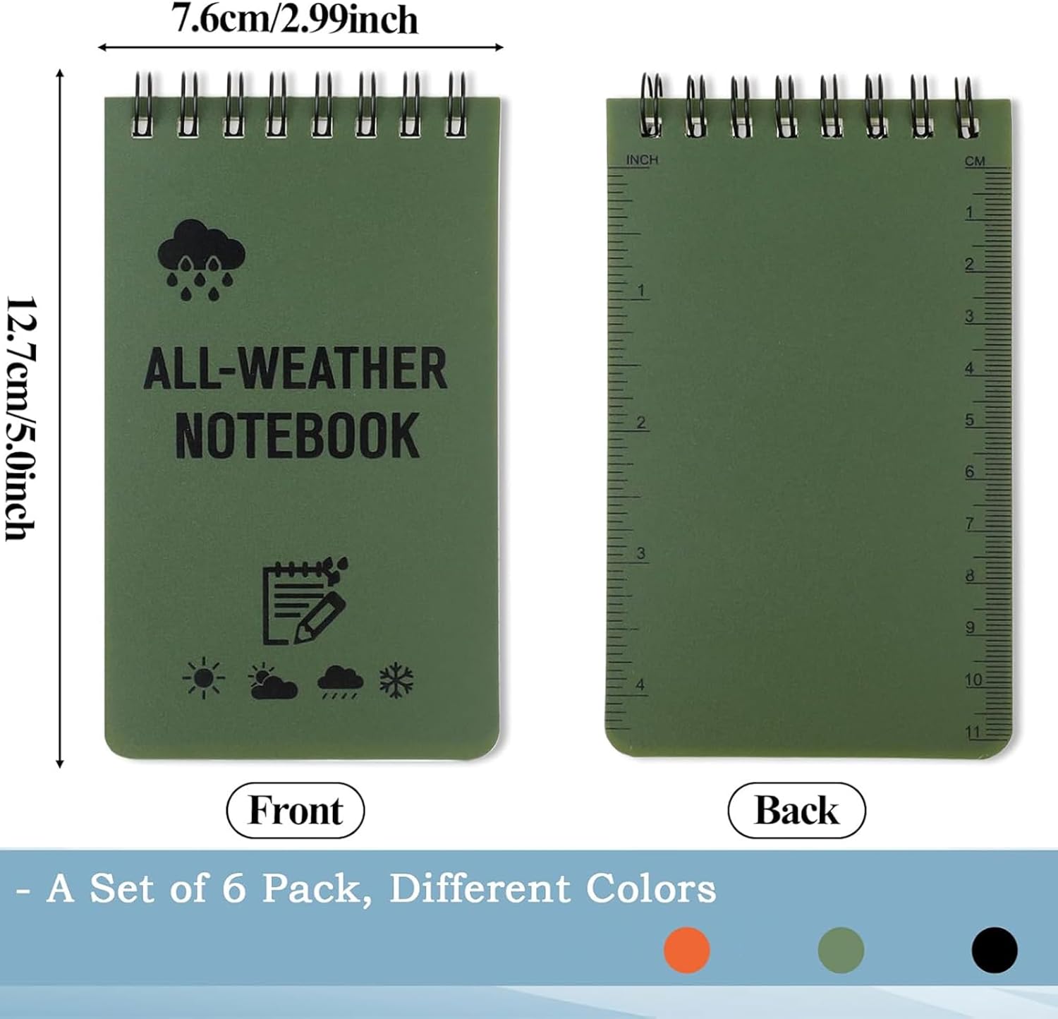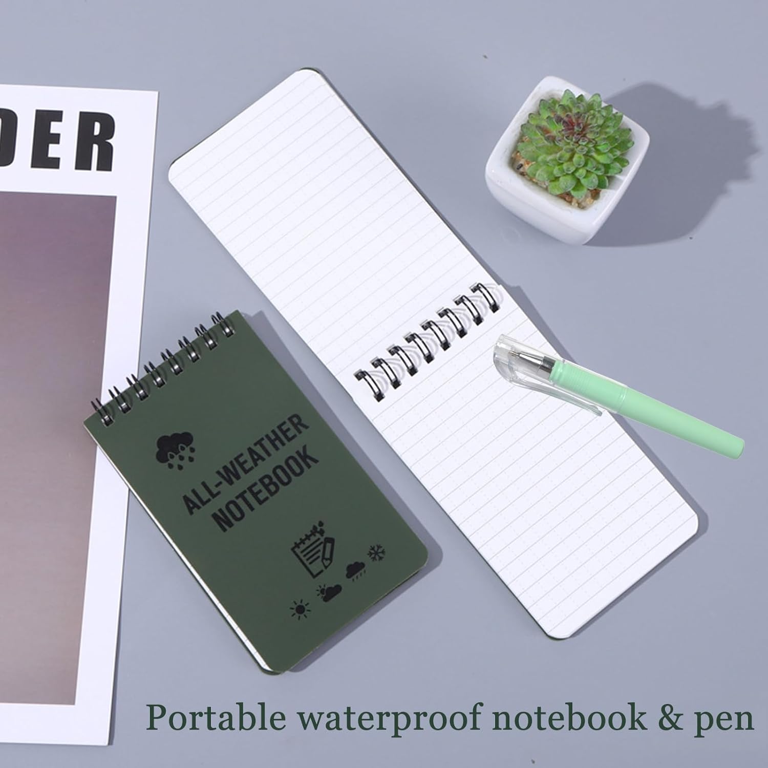 La confezione include: 6 quaderni a spirale impermeabili A7 e 2 penne Colore: verde x2+giallo x2+arancione x2 Il quaderno a spirale impermeabile A7 combina compattezza e portabilità, resistenza all'acqua con flessibilità e praticità. È adatto per file quotidiani, studio o lavoro. 1.Compatto e portatile, puoi portarlo ovunque, si adatta facilmente alla tasca, alla borsa o all'astuccio della penna e ti consente di scrivere la tua ispirazione, l'elenco delle cose da fare o gli appunti di studio in qualsiasi momento. 2. Design a spirale: la rilegatura a spirale consente di piegare il taccuino di 180° o 360°, la carta è piatta e non pizzica la mano durante la scrittura, il che è adatto per la scrittura a lungo termine. 3.La carta di pietra impermeabile, anche in acqua, può proteggere le pagine interne dal bagnarsi, adatta per ambienti esterni, viaggi o umidi. 4. Resistente all'usura e anti-costruzione: il materiale della copertura è generalmente resistente all'usura e allo strappo, non è facile da danneggiare nell'uso quotidiano, prolungandone la durata.