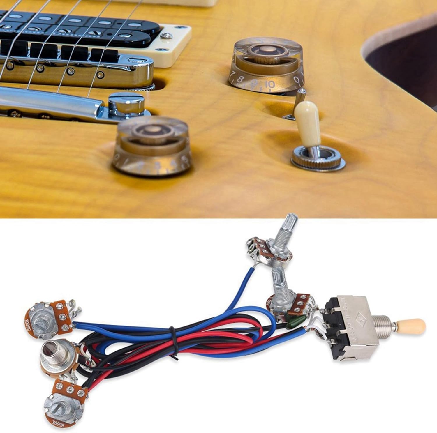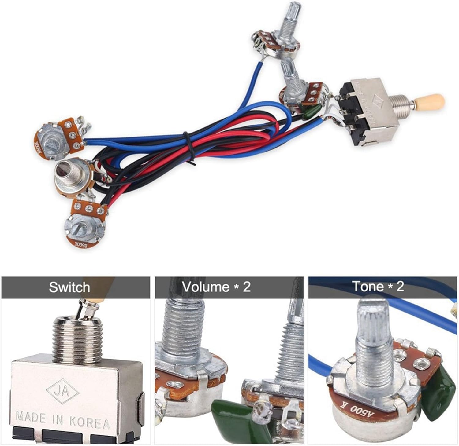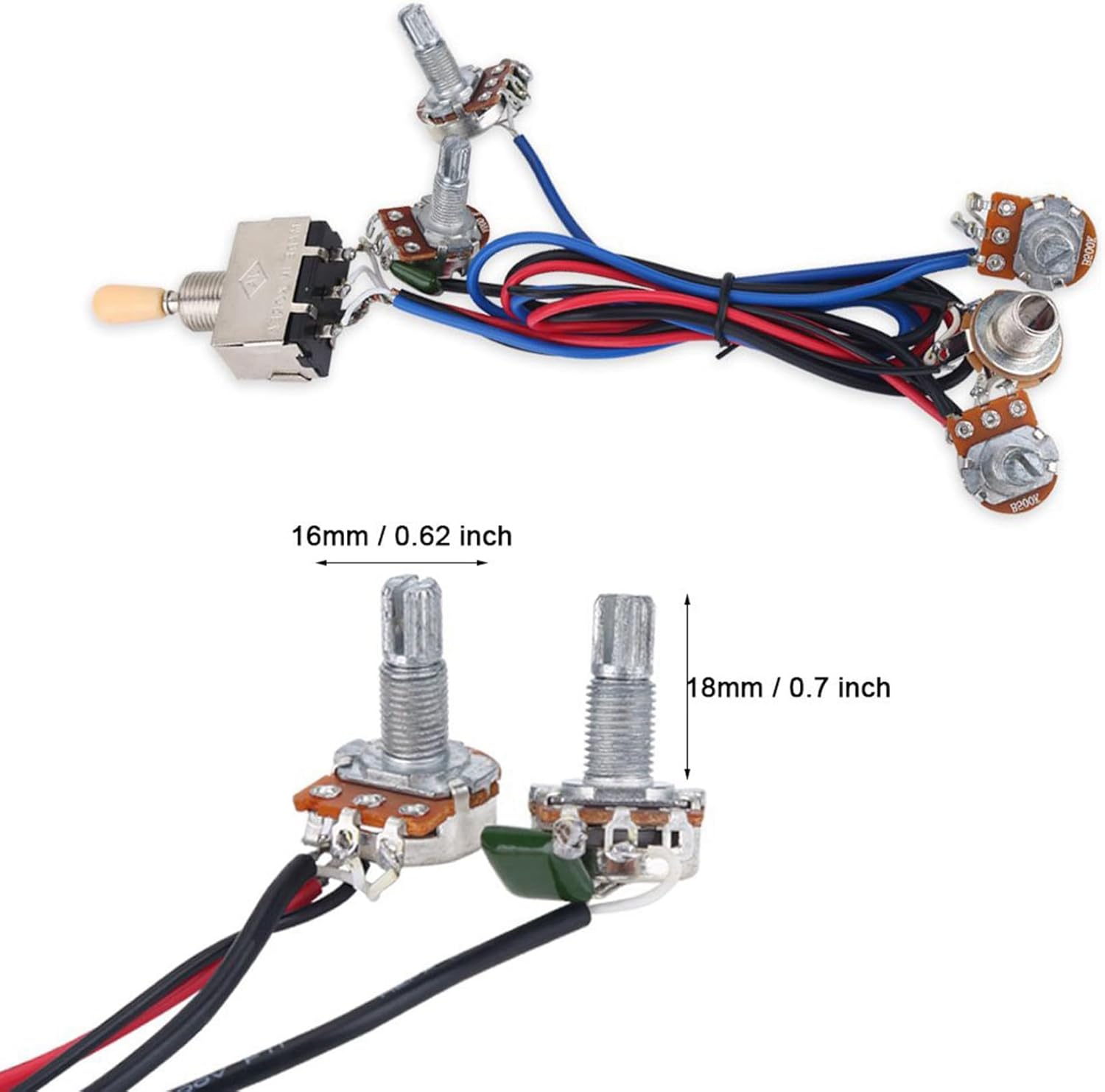 Cablaggio: due volumi / due toni / interruttore a tre vie, due condensatori, una presa jack di ingresso Set di circuiti elettrici per chitarra elettrica LP Style, Materiale: metallo e filo, 2 potenziometri volume e 2 toni: due potenziometri A500k, due potenziometri B500k Lunghezza 'albero: ca. 18 mm / 0,71 pollici, diametro base: ca. 16mm / 0,63 pollici, interruttore: ca. 18 x 28 x 49 mm / 0,71 x 1,1 x 1,9 pollici Cappuccio interruttore: color crema