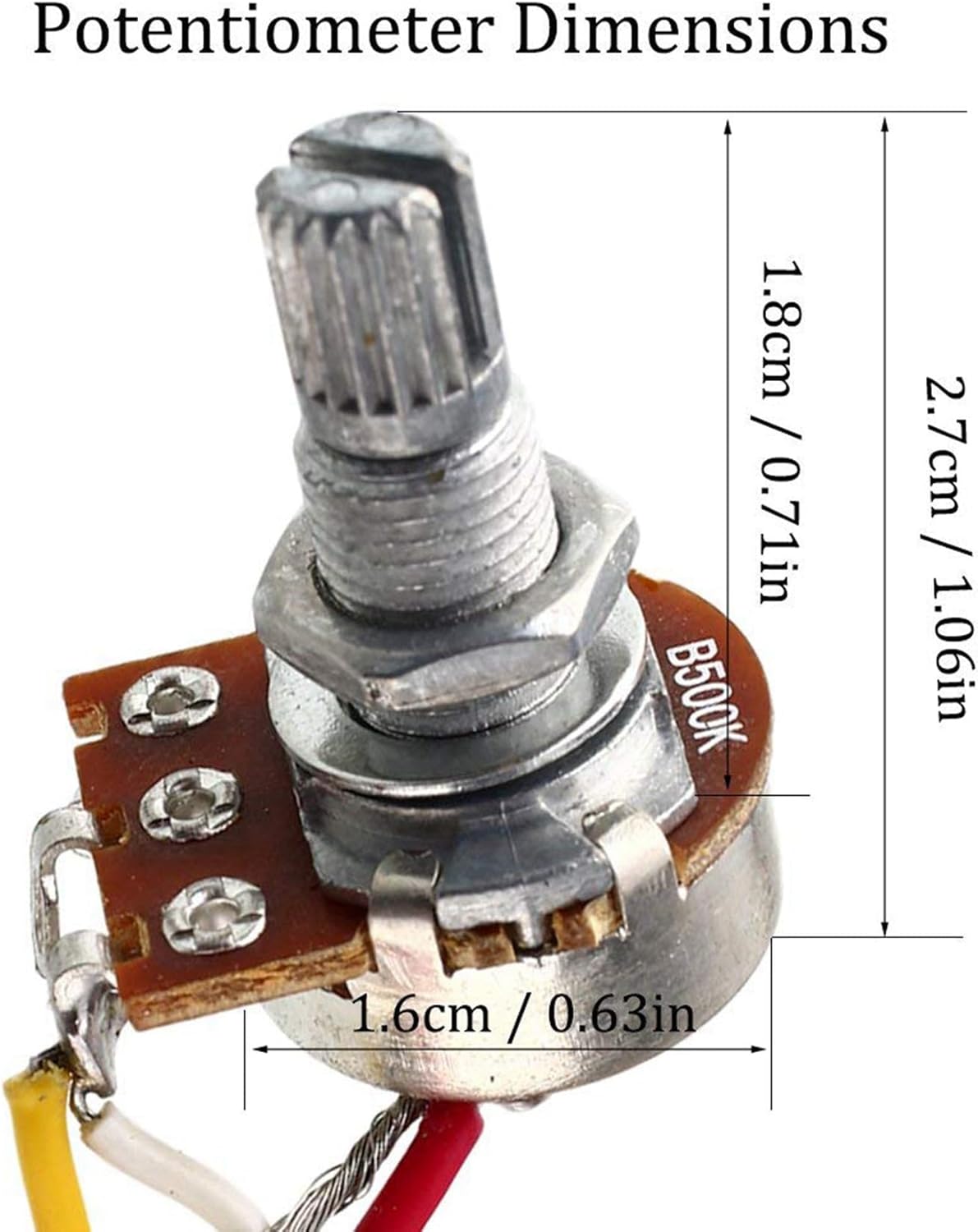 Lunghezza 'albero: ca. 18 mm / 0,71 pollici, diametro base: ca. 16mm / 0,63 pollici, interruttore: ca. 18 x 28 x 49 mm / 0,71 x 1,1 x 1,9 pollici 2 potenziometri con volume e 2 toni: due potenziometri A500k, due potenziometri B500k Cablaggio: due volumi / due toni / interruttore a tre vie, due condensatori, una presa jack di ingresso Set di circuiti elettrici per chitarra elettrica LP Style, Materiale: metallo e filo, Cappuccio interruttore: cappuccio Bianca
