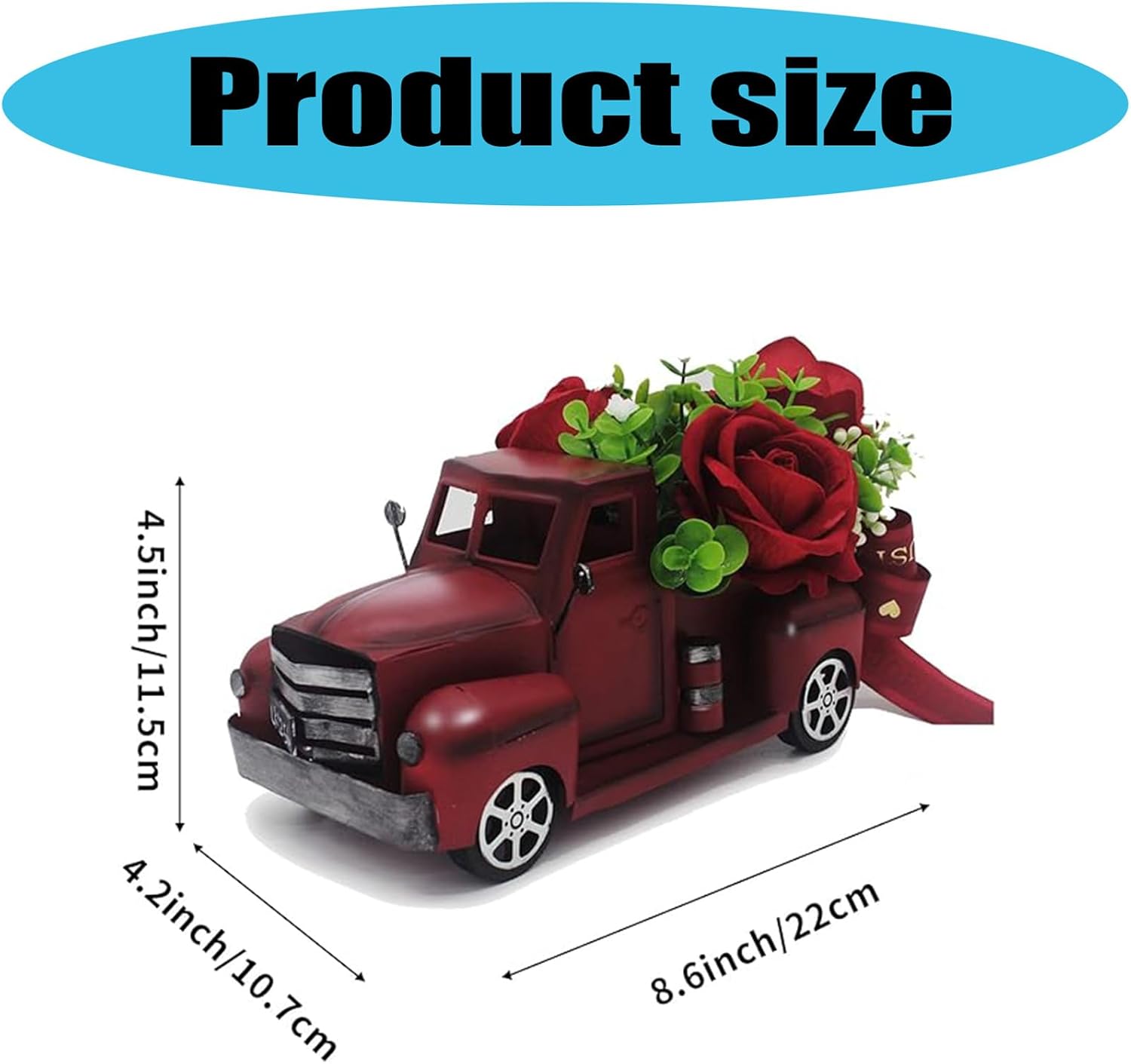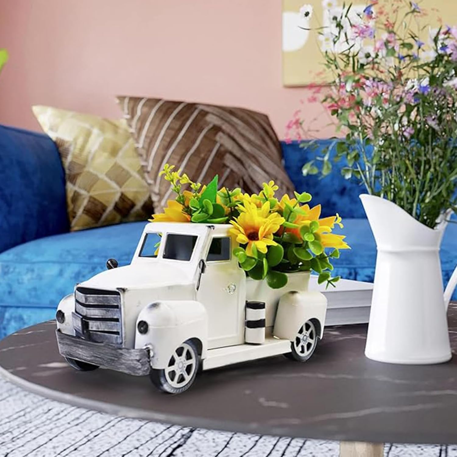 Decorazioni vintage per camion Questo è un pezzo decorato, non un giocattolo per bambini Centrotavola: la confezione include 1 camion, 1 bouquet di girasoli artificiali e luce a LED. Camion pick-up classico disegni creativi e LED casali stili colore caldo aspetto molto caldo Decorazioni per la casa: questo è un camioncino che tocca il sogno di tutti e porta il significato di un viaggio. decora perfettamente il tuo interspazio, dà vita alla nostalgia, simboleggia il raccolto e ti porta significati caldi e belli Regalo Questo meraviglioso camion sarà una meravigliosa aggiunta alle decorazioni dei girasoli delle tue fattorie. accento classico country per decorazioni domestiche Il per collezionisti, amanti dell'auto e amici inaugurazione della casa Camion: Il camion fa dai materiali. Con una calda stringa di luce a LED, gli interruttori della luce sono regolati, i mazzi di girasoli sono rimovibili e rappresentano piccoli oggetti scambiati nel bagagliaio del camion per altre stagioni