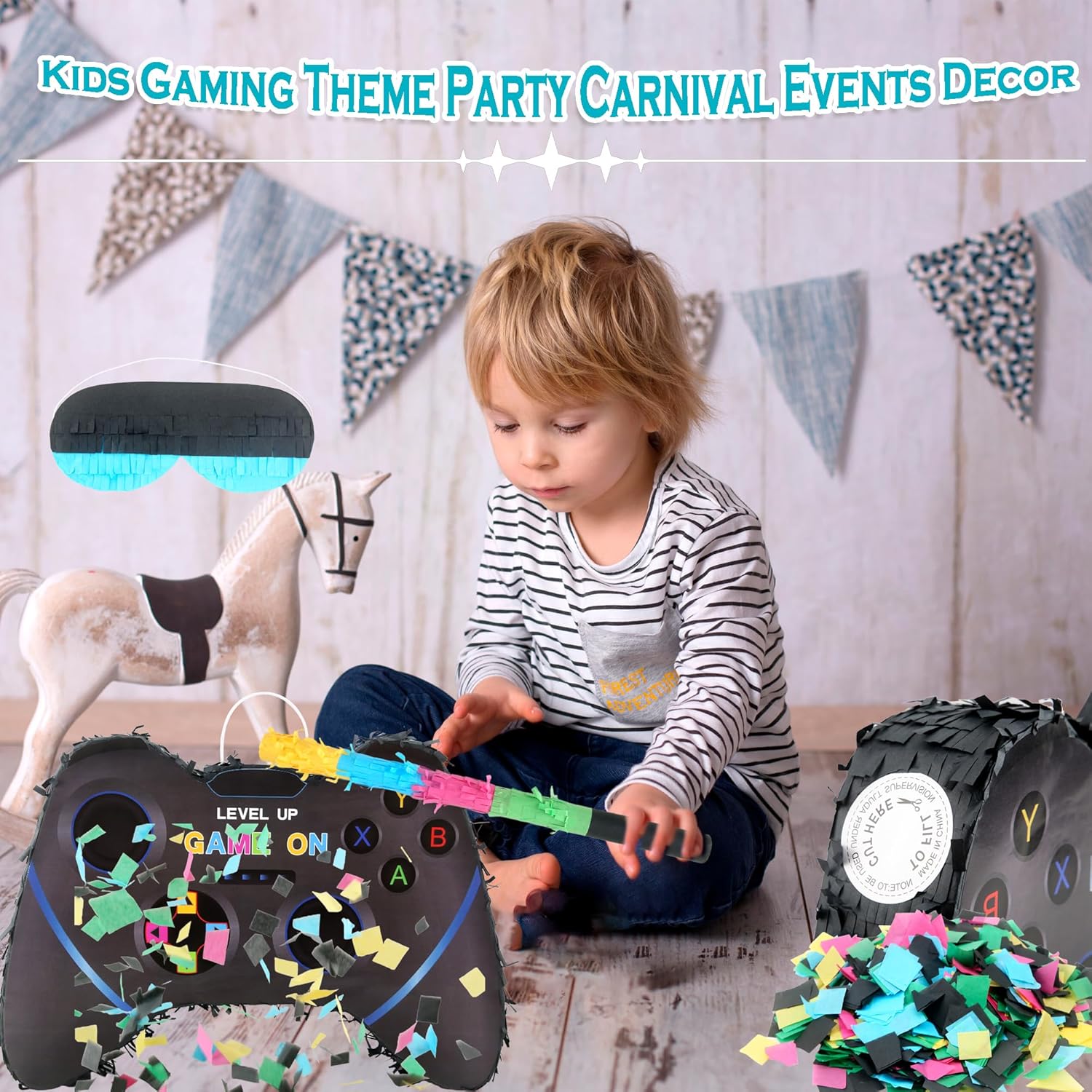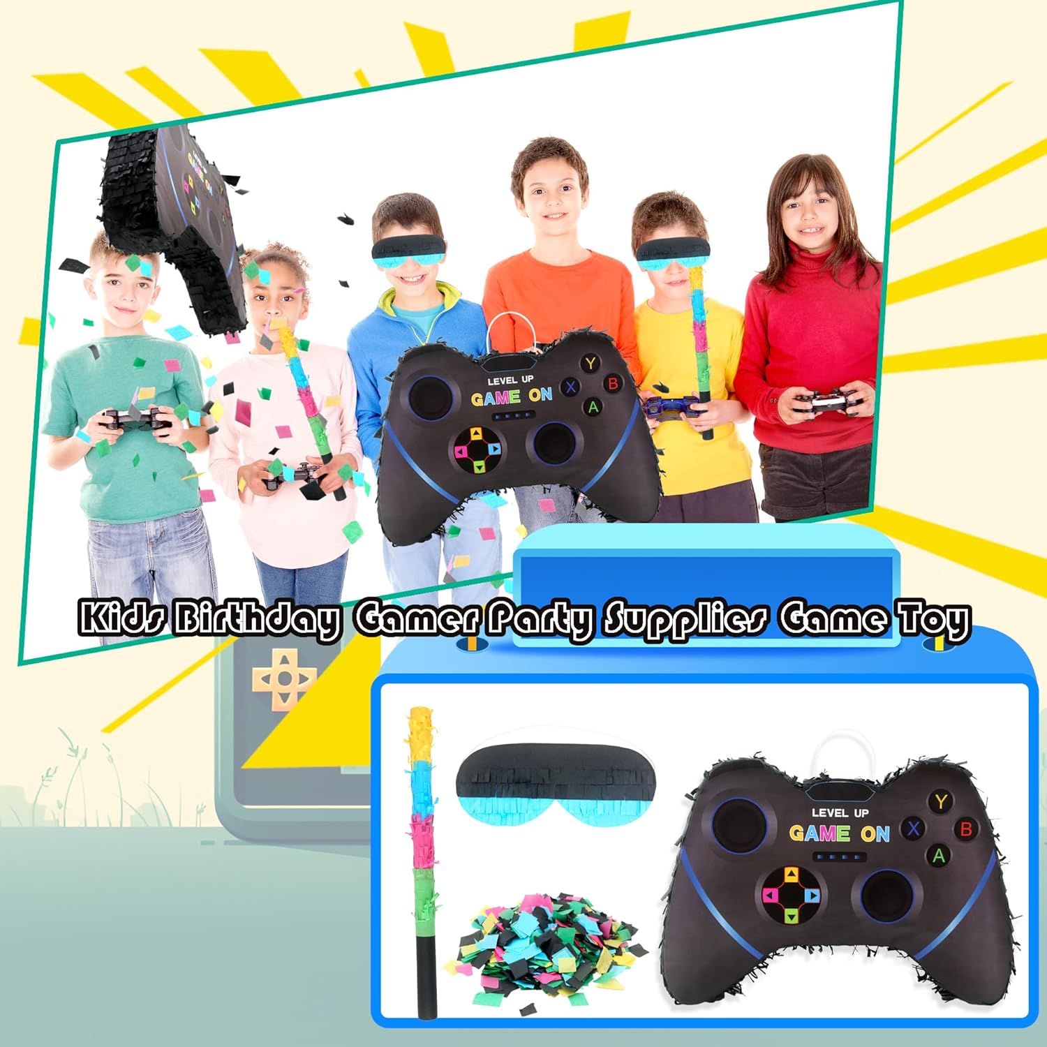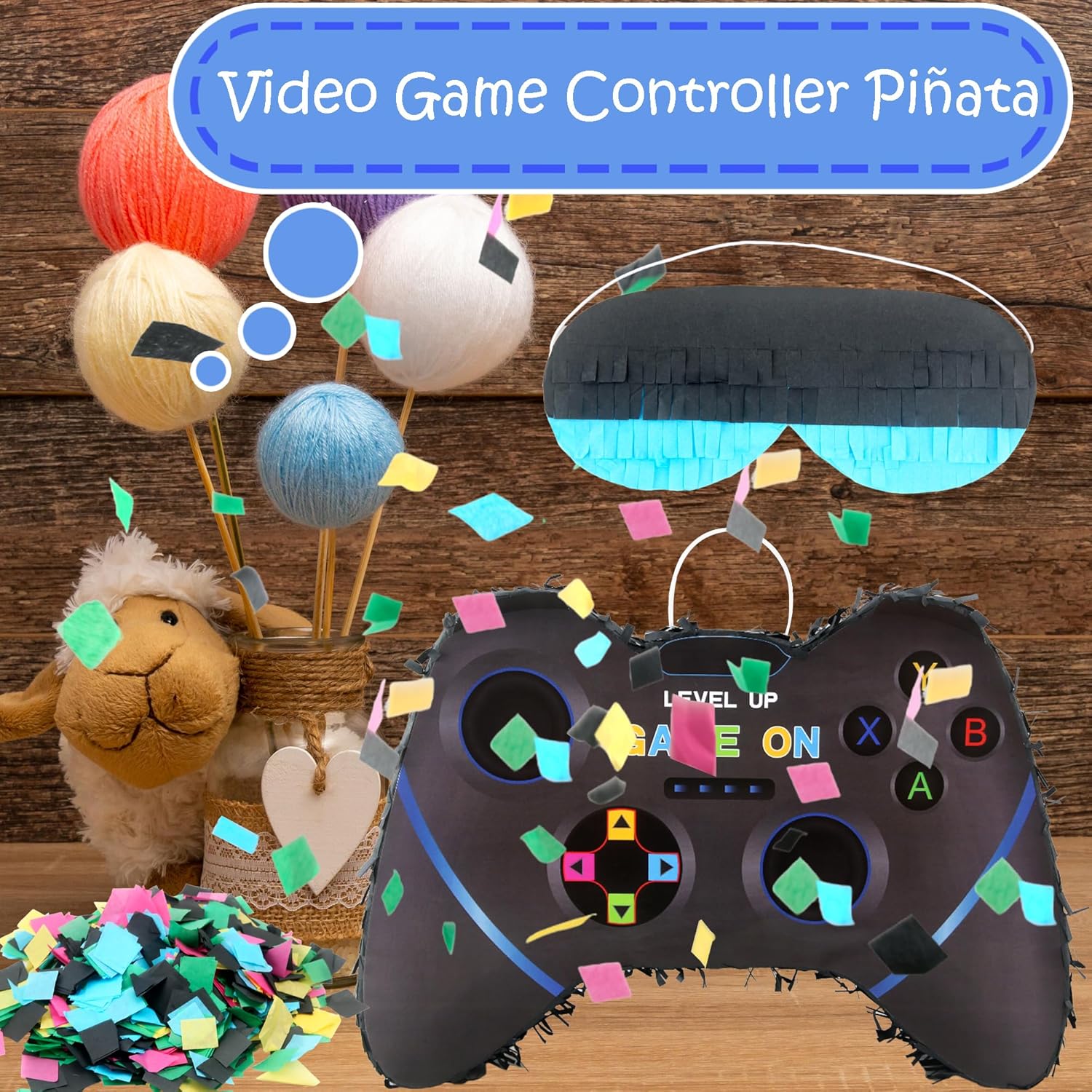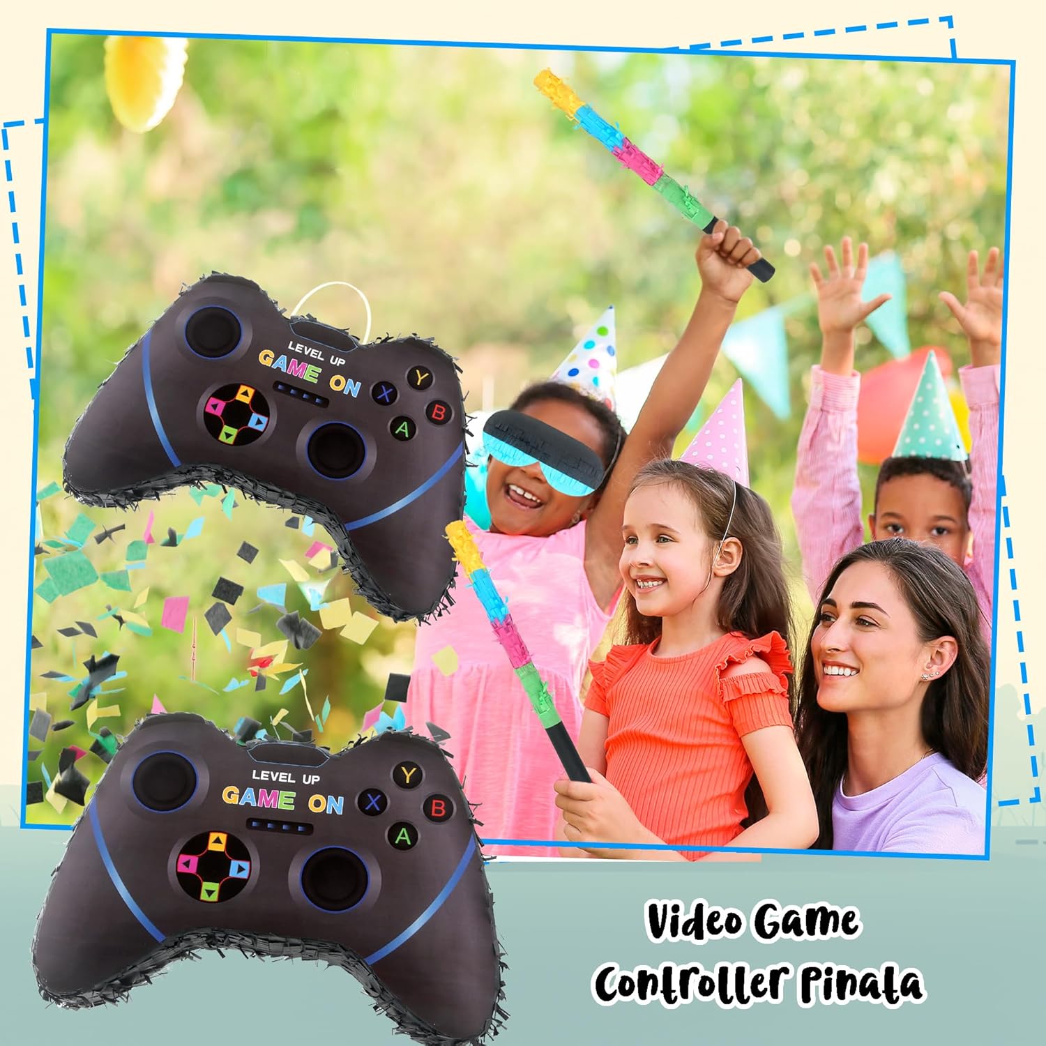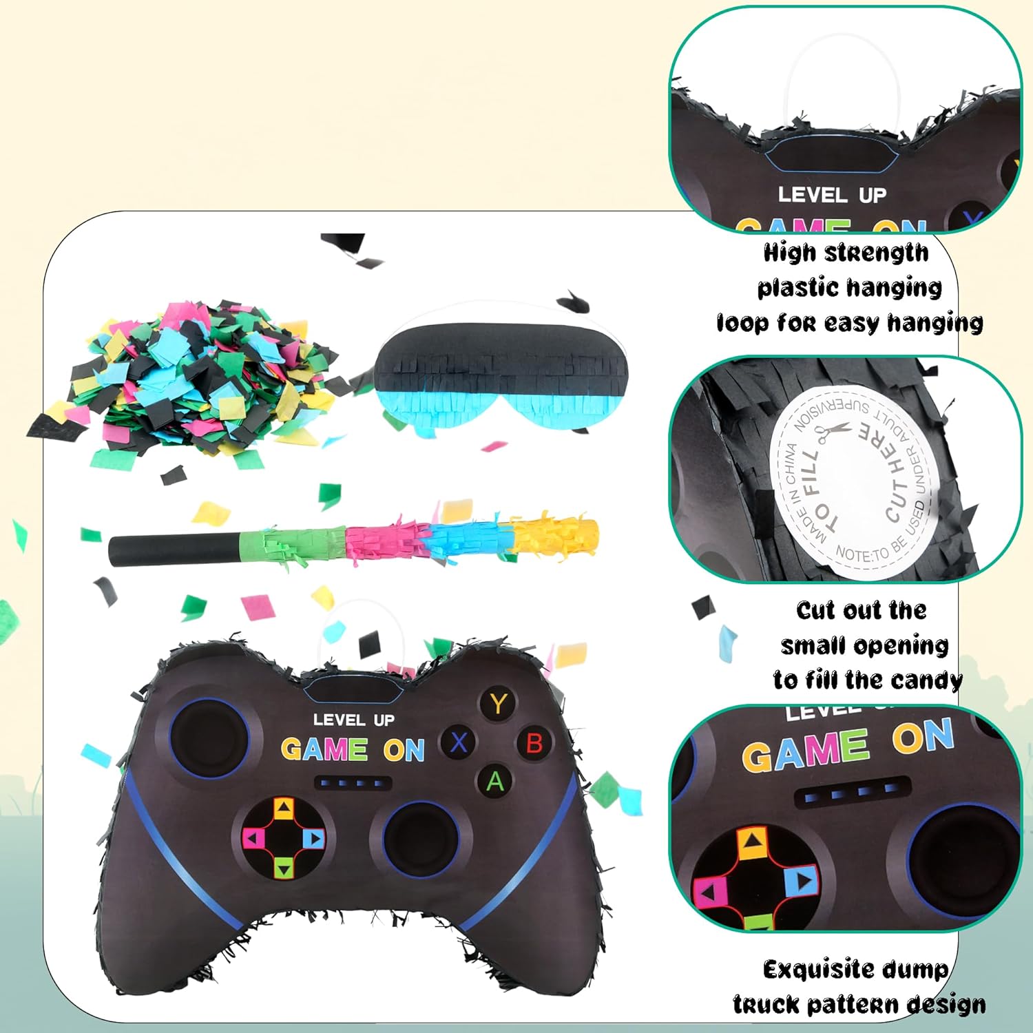 Dettagli sulle dimensioni: la pinata per controller per videogiochi misura circa 40 x 28 x 7 cm, e il bastone è di circa 40 cm, la piñata è di buone dimensioni da appendere su un albero, ringhiera o scala, e la maschera per gli occhi e il pipistrello sono anche adatti ai bambini e comodi da usare Design fresco: La pinata del controller del videogioco adotta la forma del controller di gioco, con elementi di gioco e colori vivaci, non è solo una decorazione, ma un puntello di gioco che può essere interagito e giocato, possiamo mettere caramelle e regali nella pinata del gioco, rompere la pinata della decorazione del gioco appesa, ottenere le caramelle e i regali all'interno Ampiamente applicabile: la decorazione per videogiochi è adatta per molti luoghi, come feste per videogiochi, feste Fortnite piñata, feste roblox piñata, feste di amici, feste di compleanno, feste di rivelazione di genere, compleanni per bambini, ecc. La confezione include: Le decorazioni per feste per videogiochi includono 1 pinata per controller di gioco, 1 benda, 1 bastoncino per pinata e coriandoli da 50 g, i colori vivaci attirano rapidamente l'attenzione delle persone, stimolano la curiosità e il desiderio di esplorare