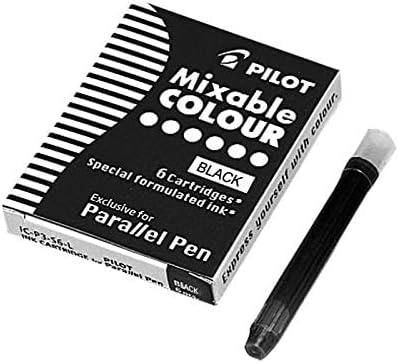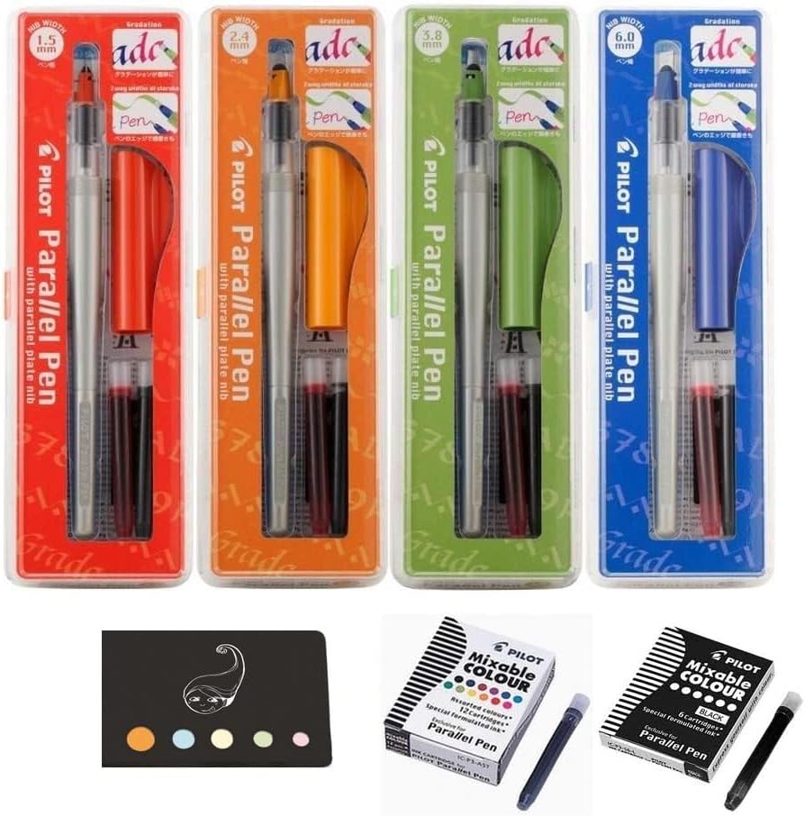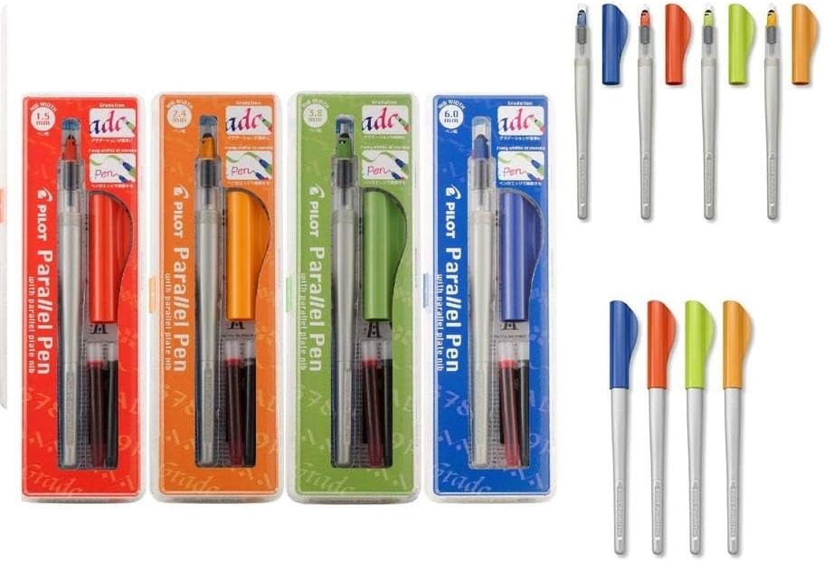 Il set comprende: - Penna stilografica Pilot “Parallel Pen” per calligrafia: Pennino per calligrafia in acciaio inox tagliato al laser. Ricaricabile con cartucce IC P3. Con regolatore di inchiostro. Pennino con doppia lama. Livello d’inchiostro visibile. Spessore scrittura: 1,5 mm. Con 2 cartucce (nera/rossa), detergente per pennino e cleaning converter. - Pennino per calligrafia in acciaio inox tagliato al laser. Ricaricabile con cartucce IC P3. Con regolatore di inchiostro. Pennino con doppia lama. Livello d’inchiostro visibile. Spessore scrittura: 2,4 mm. Con 2 cartucce (nera/rossa), detergente per pennino e cleaning converter. - Penna stilografica Pilot “Parallel Pen” per calligrafia: Pennino per calligrafia in acciaio inox tagliato al laser. Ricaricabile con cartucce IC P3. Con regolatore di inchiostro. Pennino con doppia lama. Livello d’inchiostro visibile. Spessore scrittura: 3,8 mm. Con 2 cartucce (nera/rossa), detergente per pennino e cleaning converter. - Penna stilografica Pilot “Parallel Pen” per calligrafia: Pennino per calligrafia in acciaio inox tagliato al laser. Ricaricabile con cartucce IC ICP3. Con regolatore di inchiostro. Pennino con doppia lama. Livello d’inchiostro visibile. Spessore scrittura: 6,0 mm. Con 2 cartucce (nera/rossa), detergente per pennino e cleaning converter. Con confezione con 6 cartucce di inchiostro nero: 6 cartucce di inchiostro nero per Parallel Pen. Con confezione di 12 cartucce di inchiostro di colori assortiti per Parallel Pen. Con 1 righello segnalibro in legno a forma di gatto.