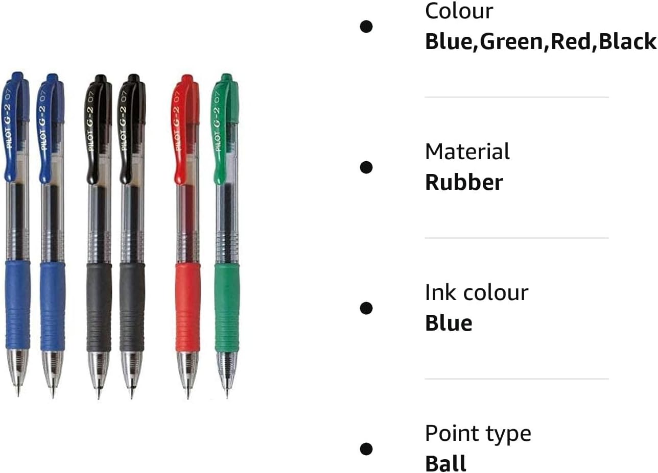 Pilot - set di 6 penne G2, 2 blu, 2 nera, 1 rossa e 1 verde. Inchiostro gel. Punta a sfera con diametro di 0,7 mm. Larghezza del tratto: 0,4 mm. Impugnatura in gomma dello stesso colore dell’inchiostro.