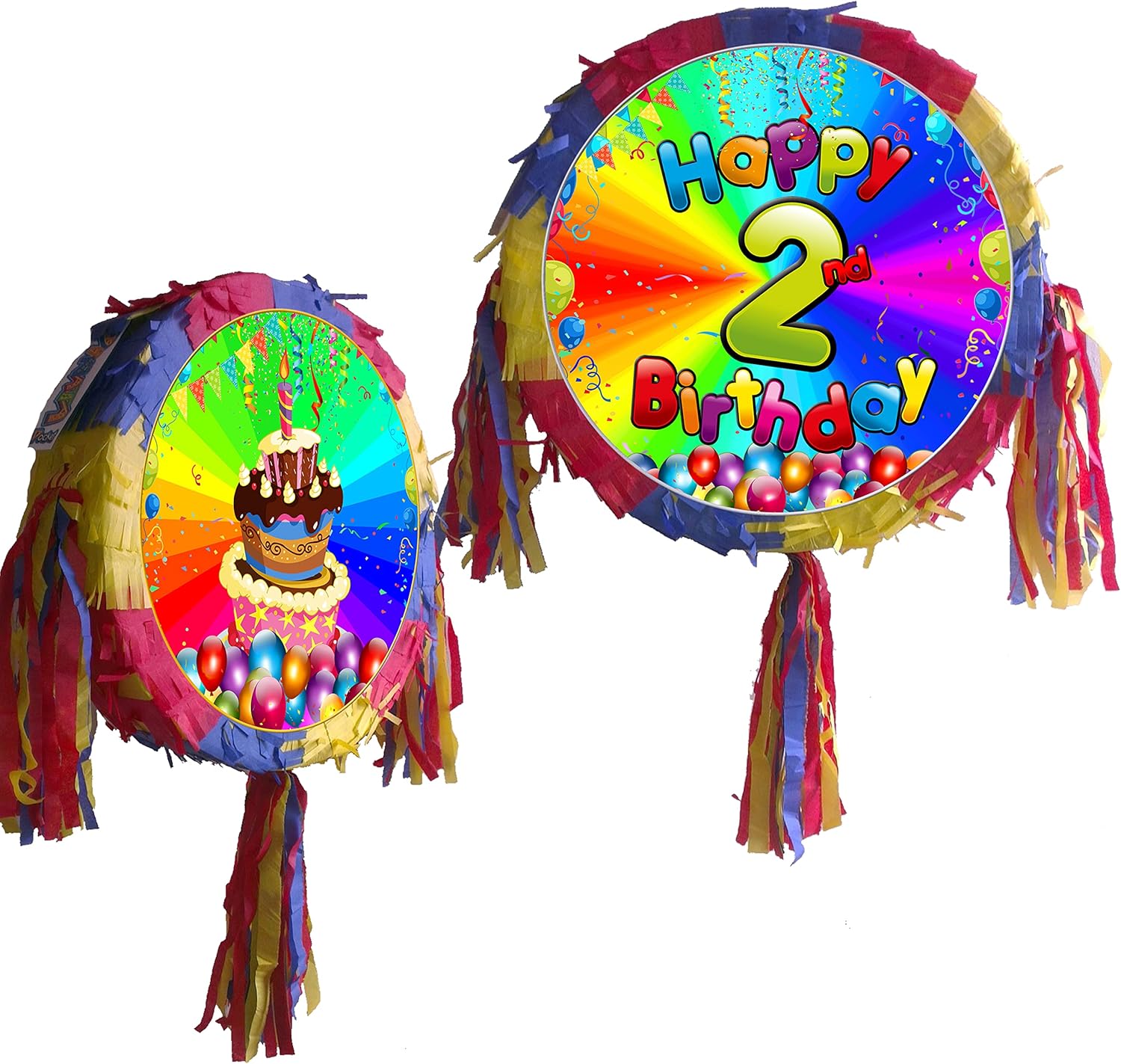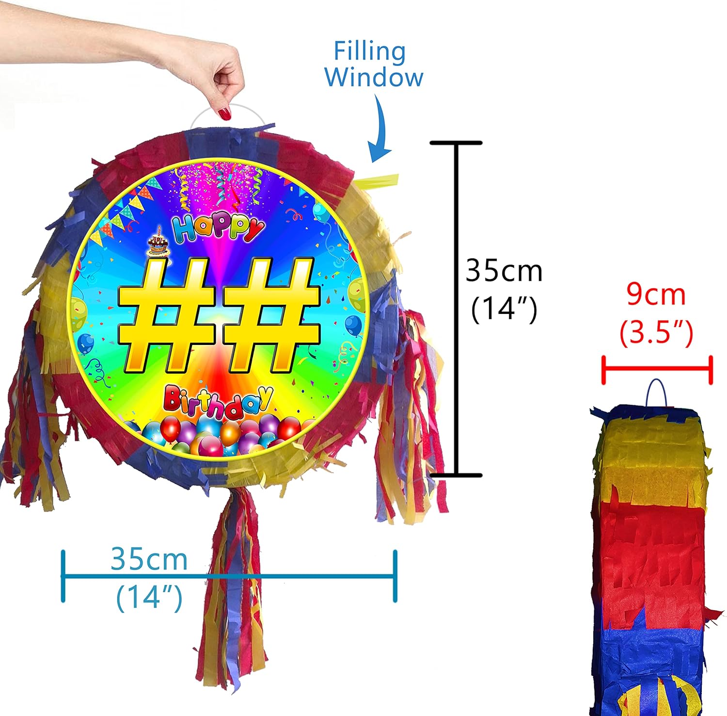 Realizzato con carta e cartone. Contiene una finestra di riempimento e una cinghia di fissaggio. Design unisex adatto a tutti. Adatto sia a bambini che ad adulti. Il bastone è lungo 50 cm e la benda è di carta. La foto mostra la parte anteriore e posteriore della piñata.