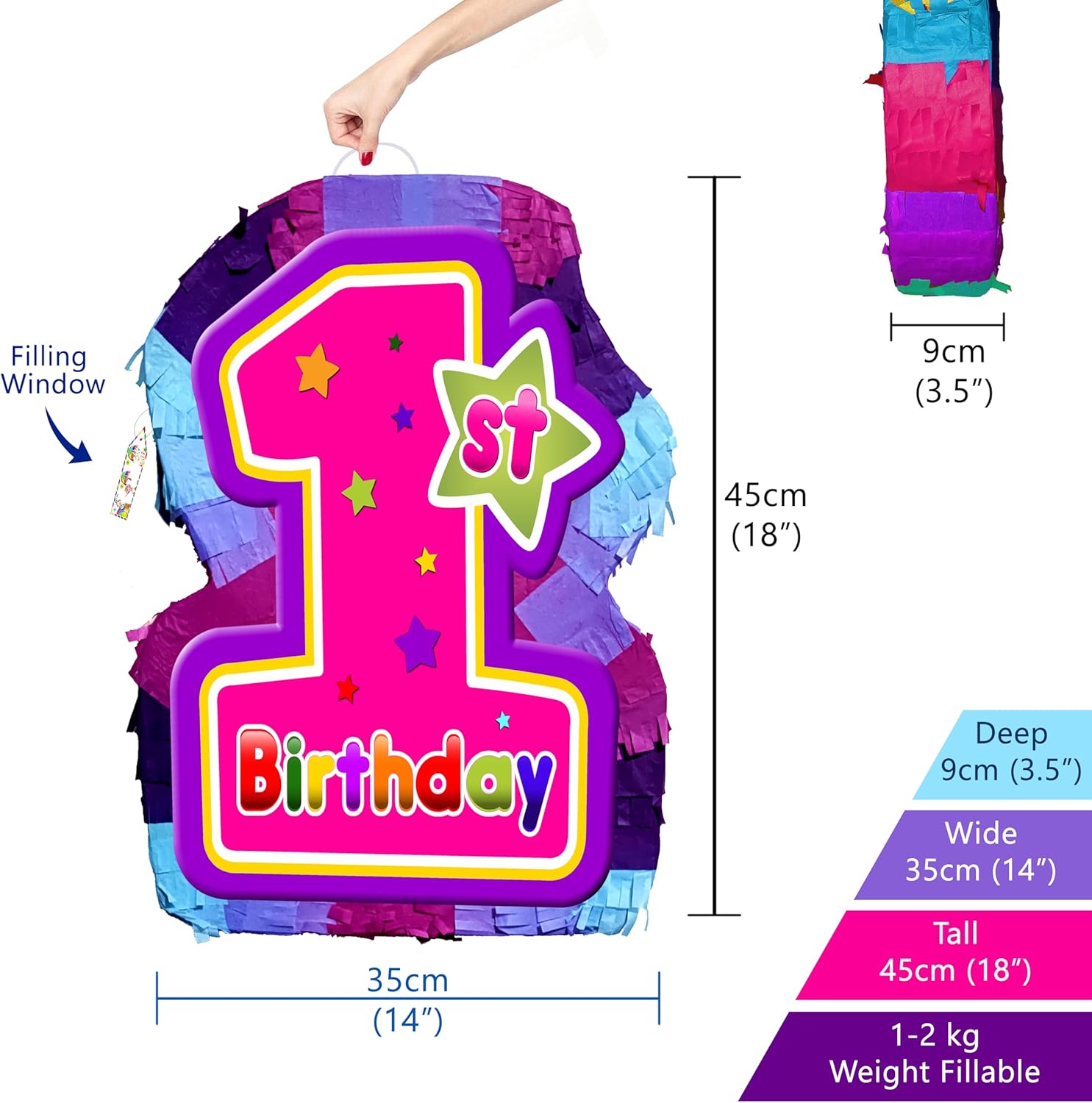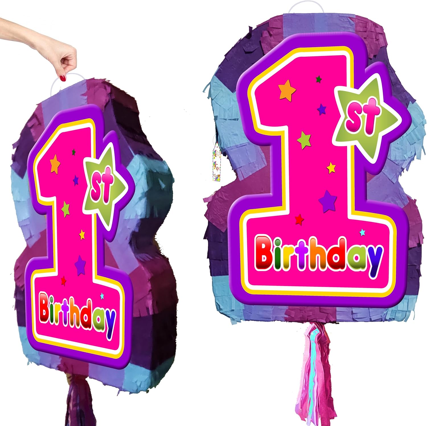 La pinata per il primo compleanno per ragazze viene fornita con bastone e benda di carta. Pinata include finestra di riempimento e cinturino. La Pinata è vuota e può essere facilmente riempita con 1-2 kg di caramelle o mini giocattoli. Adatto sia a bambini che ad adulti. Realizzato in cartone e carta. La foto mostra la parte anteriore e posteriore della pinata. Ogni lato piatto con disegno stampato. La pinata è confezionata in sacchetto di plastica e imballata in cartone.