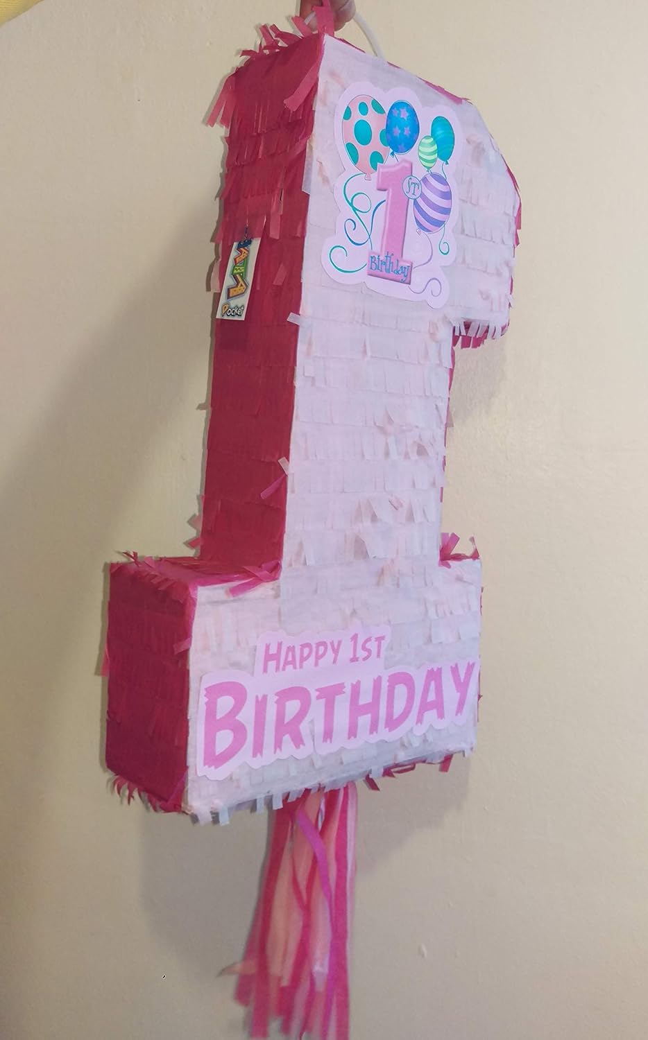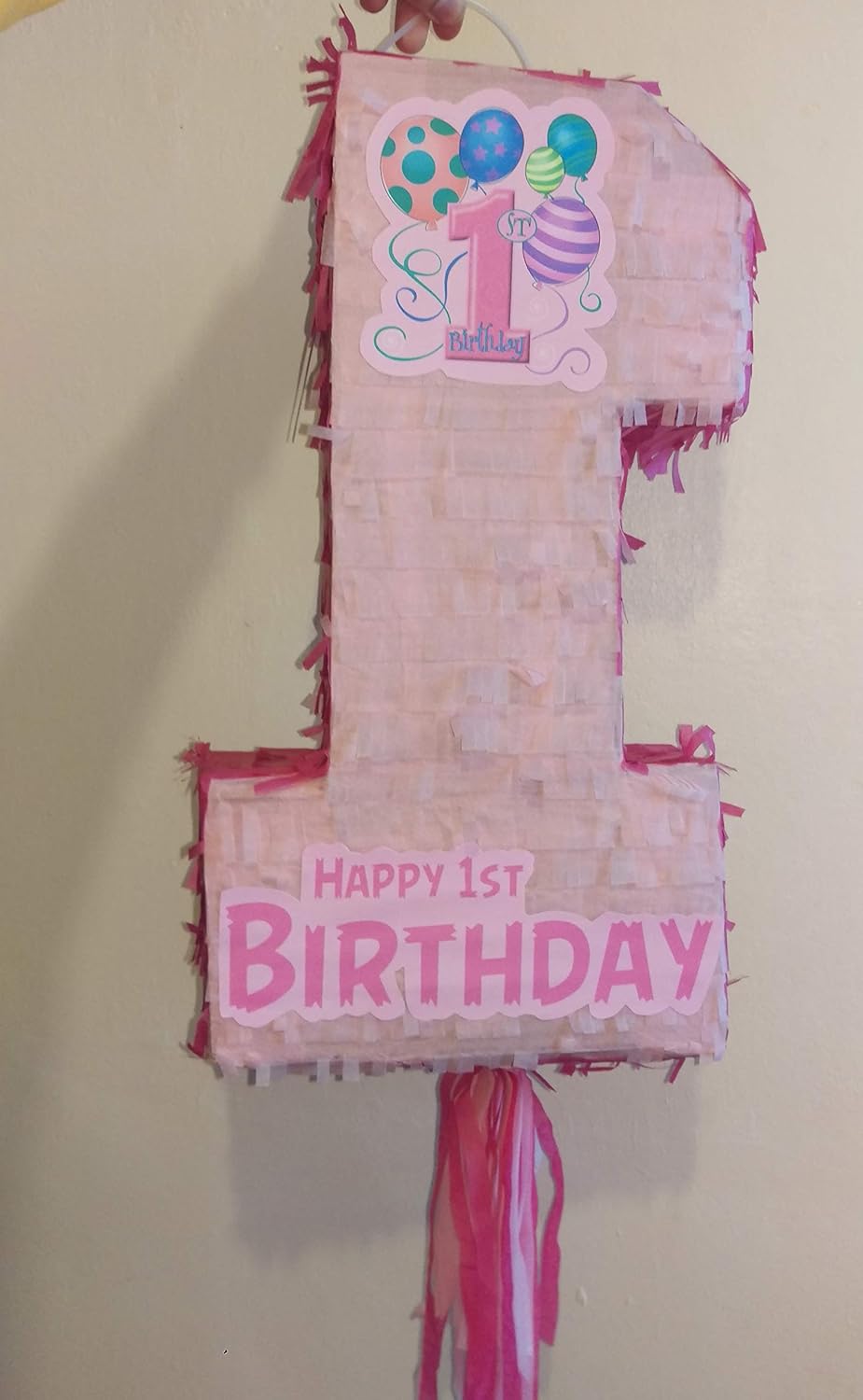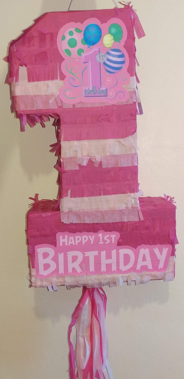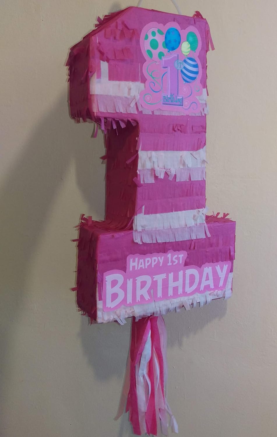 Piñata con bastone e maschera di carta. Tema rosa per il primo compleanno della bambina. Adatto sia a bambini che ad adulti.