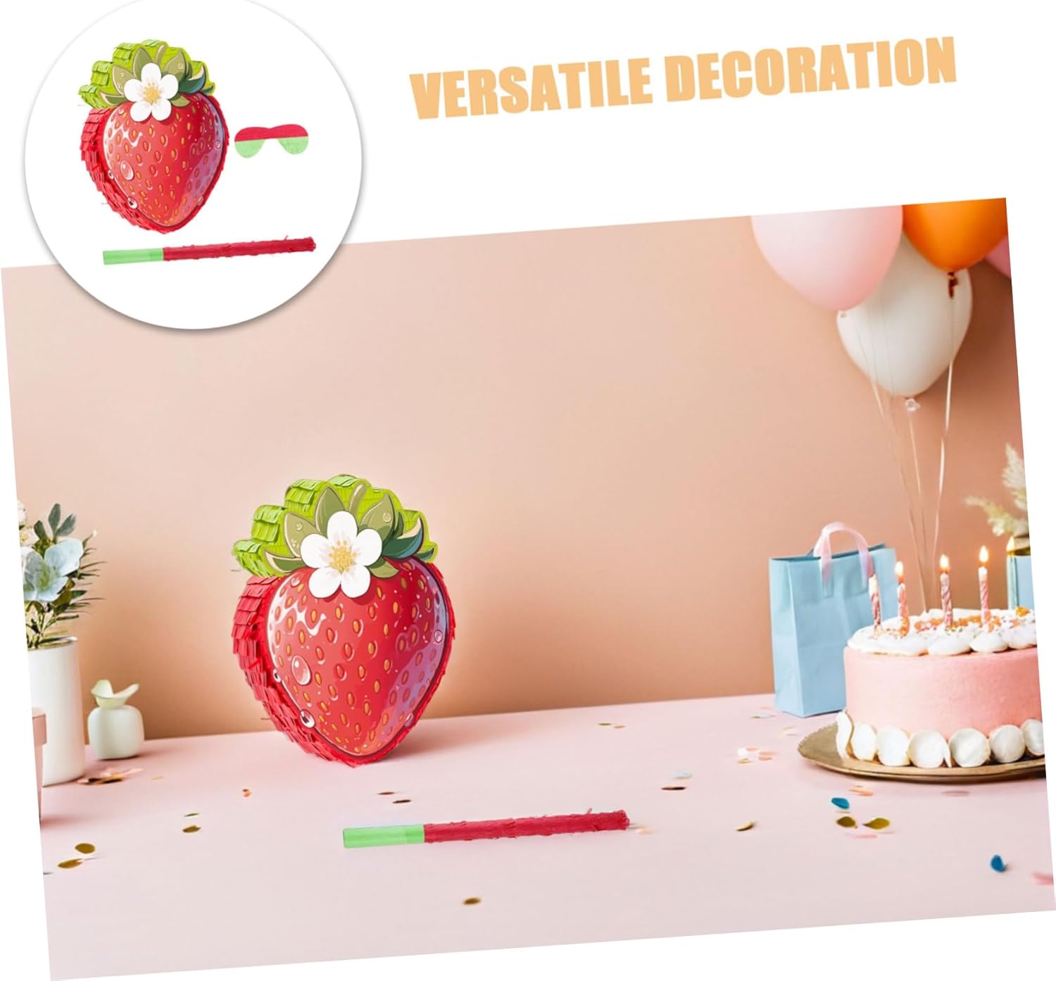 Elemento di gioco interattivo: viene fornito con una benda e un bastone per divertenti giochi di piñata con gli occhi bendati per feste di compleanno, giochi di fragole e attività di decorazione di compleanno a tema alimentare, feste di fragole, articoli per feste con fragole. Costruzione robusta e attraente: questa piñata di fragole è realizzata in cartone e decorata con carta crespa. Fornisce resistenza e un aspetto colorato e festoso per decorazioni di compleanno con fragole, giochi di cibo per feste con gli occhi bendati e divertenti piñata per feste con fragole. Versatile: serve come decorazione per feste di compleanno alla fragola o come festa alla fragola e migliora l'atmosfera delle decorazioni per feste a tema fragola, feste di compleanno alla fragola e decorazioni per feste a tema fragola. Decorazione versatile per feste: come decorazione di buon compleanno alla fragola o supporto fotografico alla fragola, migliora l'aspetto delle decorazioni per feste a tema fragola, giochi per feste a tema cibo, piñata per feste a tema cibo Facile da appendere e riempire: presenta un robusto anello per appenderlo e un comodo foro di riempimento per riempire con coriandoli, decorazioni per feste o bomboniere, piñata alle fragole, giochi alimentari Cinco de Mayo, divertenti decorazioni per feste con cibo
