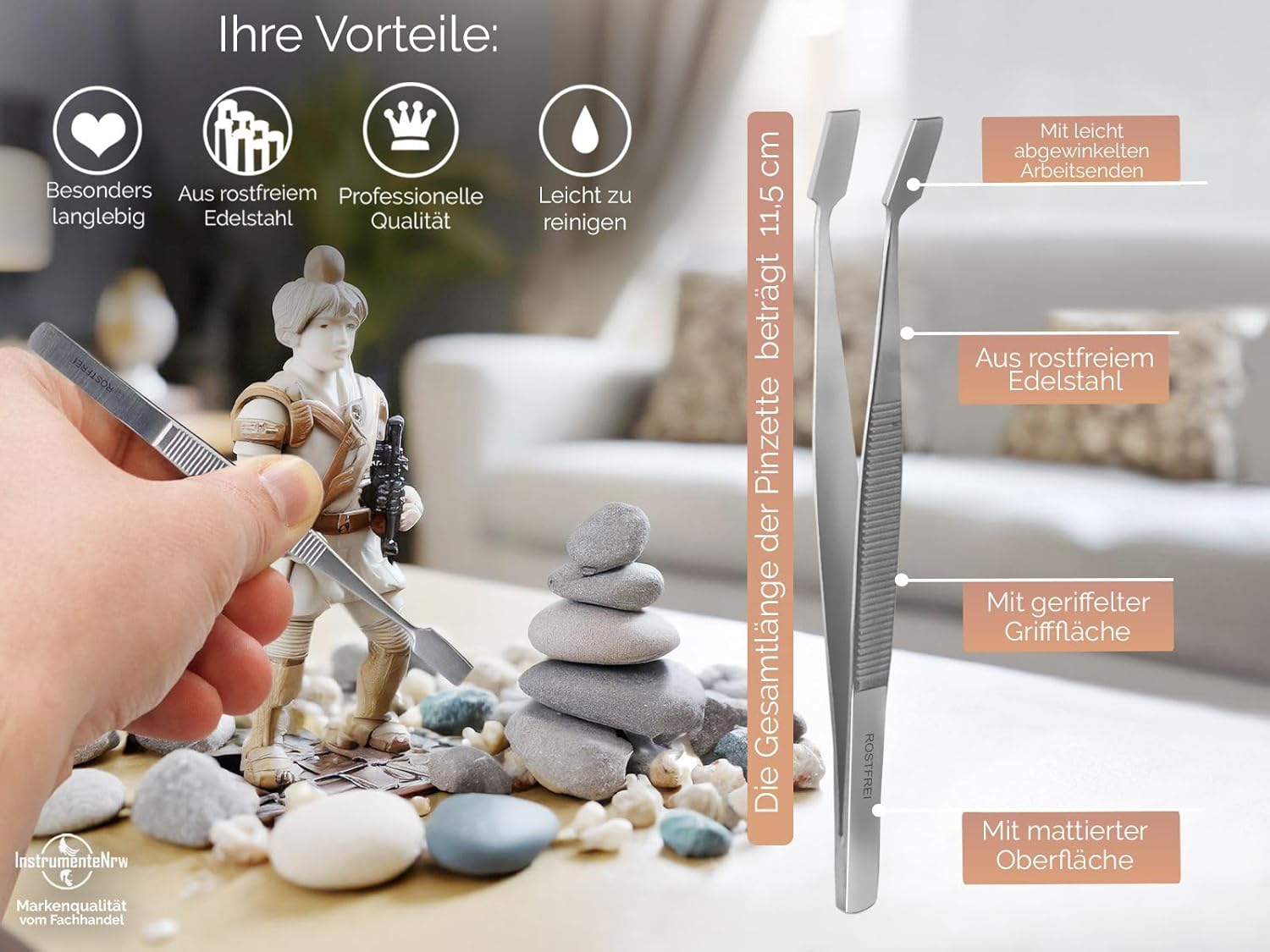 PALETTE CURVE GRANDI - Pinzetta per francobolli premium Pinzetta speciale per francobolli con pale curve anche per collezionisti di hobby o modellisti che devono fare lavori raffinati. Strumento ausiliario ideale e unico nella sua forma a cucchiaio LAVORO PRECISO - Adatto a tutti i timbri e altri materiali delicati come per la modellistica e altre aree di officina dove i dettagli precisi come strumento da collezione sono importanti PER PROFESSIONISTI O PRINCIPIANTI - Pinzetta per timbri appositamente realizzata con una grande pala curva ed estremità leggermente smussate. Ideale per oggetti da collezione sensibili. Adatto per uso professionale. Acciaio inossidabile inossidabile. Pulizia molto semplice. Le pinzette sono realizzate in acciaio per pinzette di alta qualità. Le pinzette standard per francobolli sono realizzate esclusivamente in materiale nichelato. Con noi ottieni qualità assoluta e duratura da rivenditori specializzati DETTAGLI STRUMENTO DI RACCOLTA - Lunghezza totale: 11,5 cm. Dimensioni estremità di lavoro/pala: ca. 12 mm x ca. 7 mm. Manici antiscivolo a coste per una movimentazione sicura. Lame lisce e leggermente smussate. Superficie dell'impugnatura e forma a cucchiaio per una facile maneggevolezza Qualità premium da rivenditori specializzati - Siamo un'azienda a conduzione familiare con sede nel Nord Reno Westfalia (Germania). L'artigianato tradizionale, la tecnologia all'avanguardia e i materiali di alta qualità garantiscono la qualità costante della nostra gamma di prodotti. I desideri e le richieste dei nostri clienti sono al centro della nostra filosofia aziendale