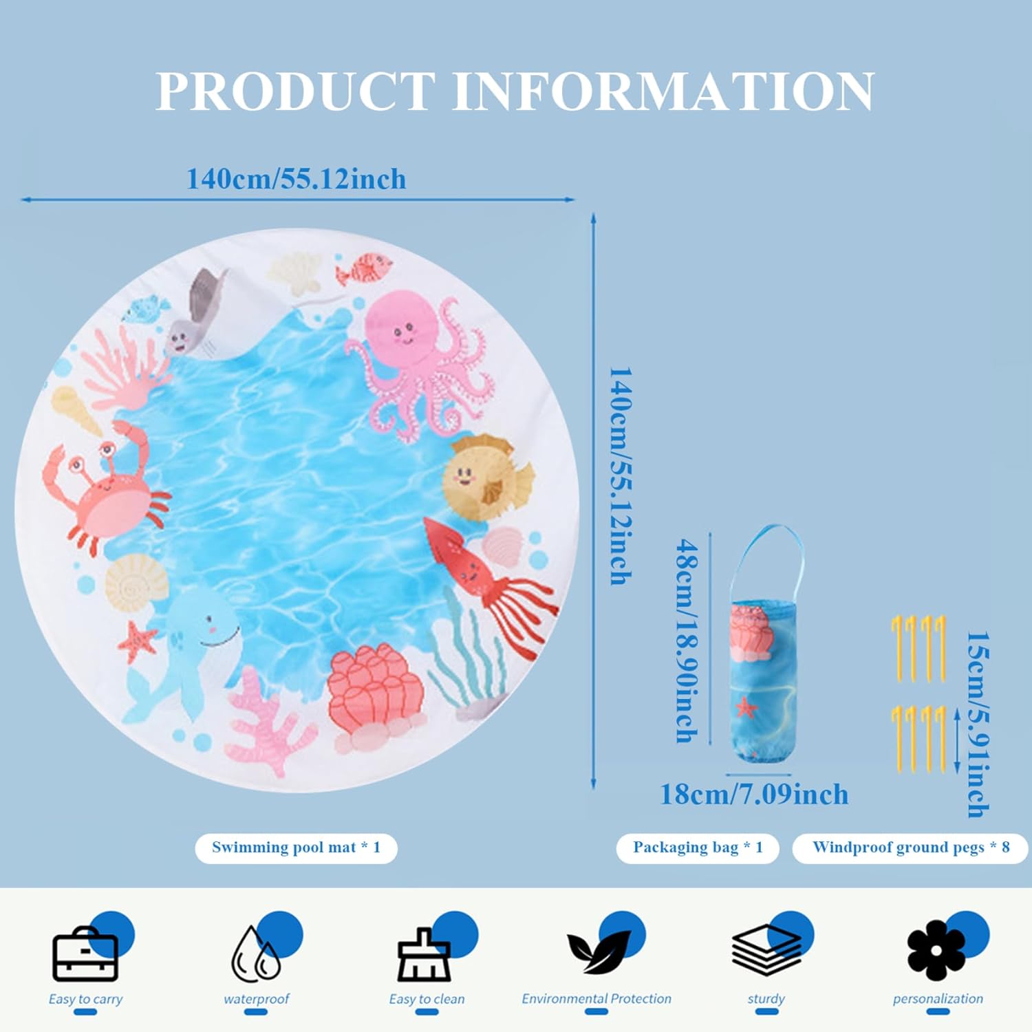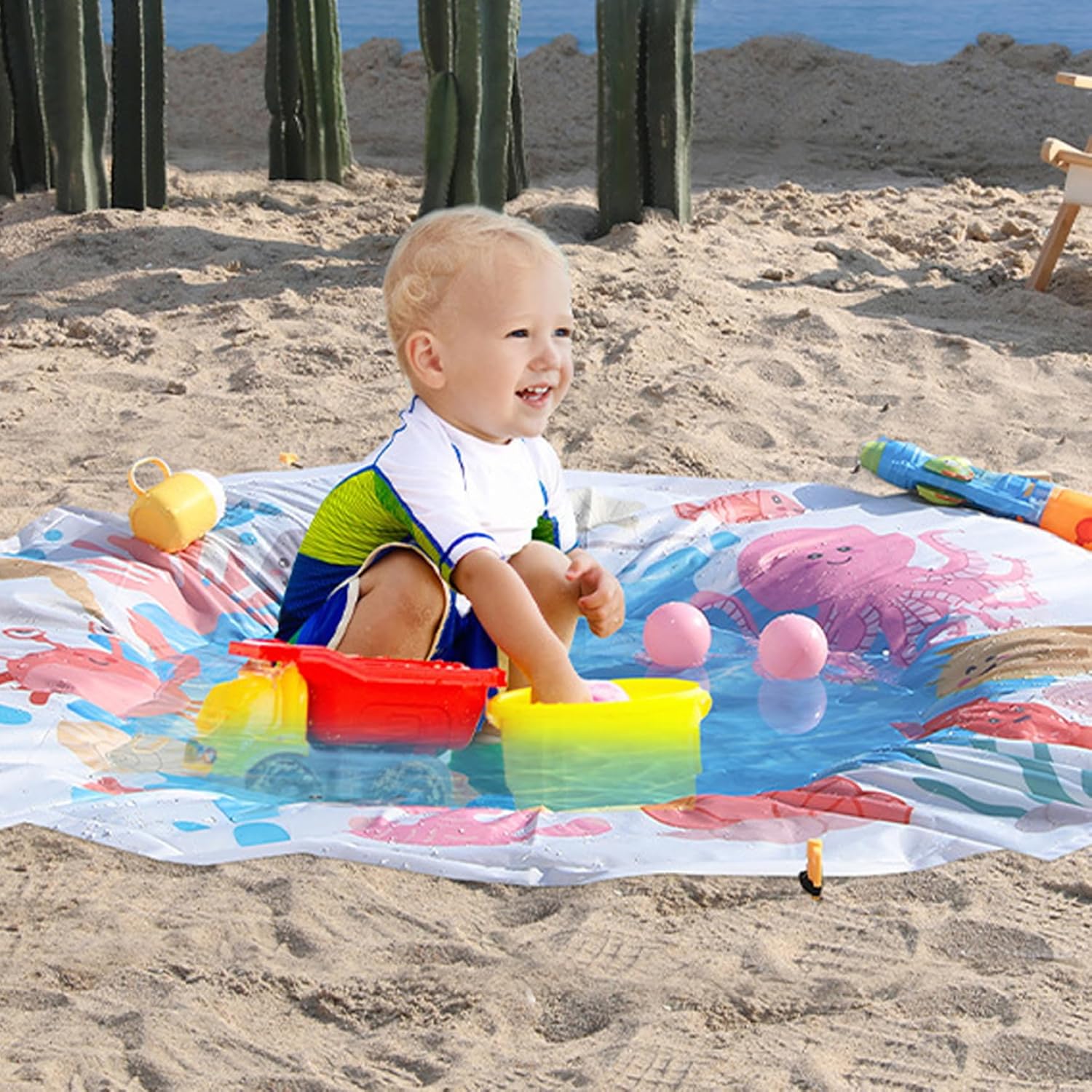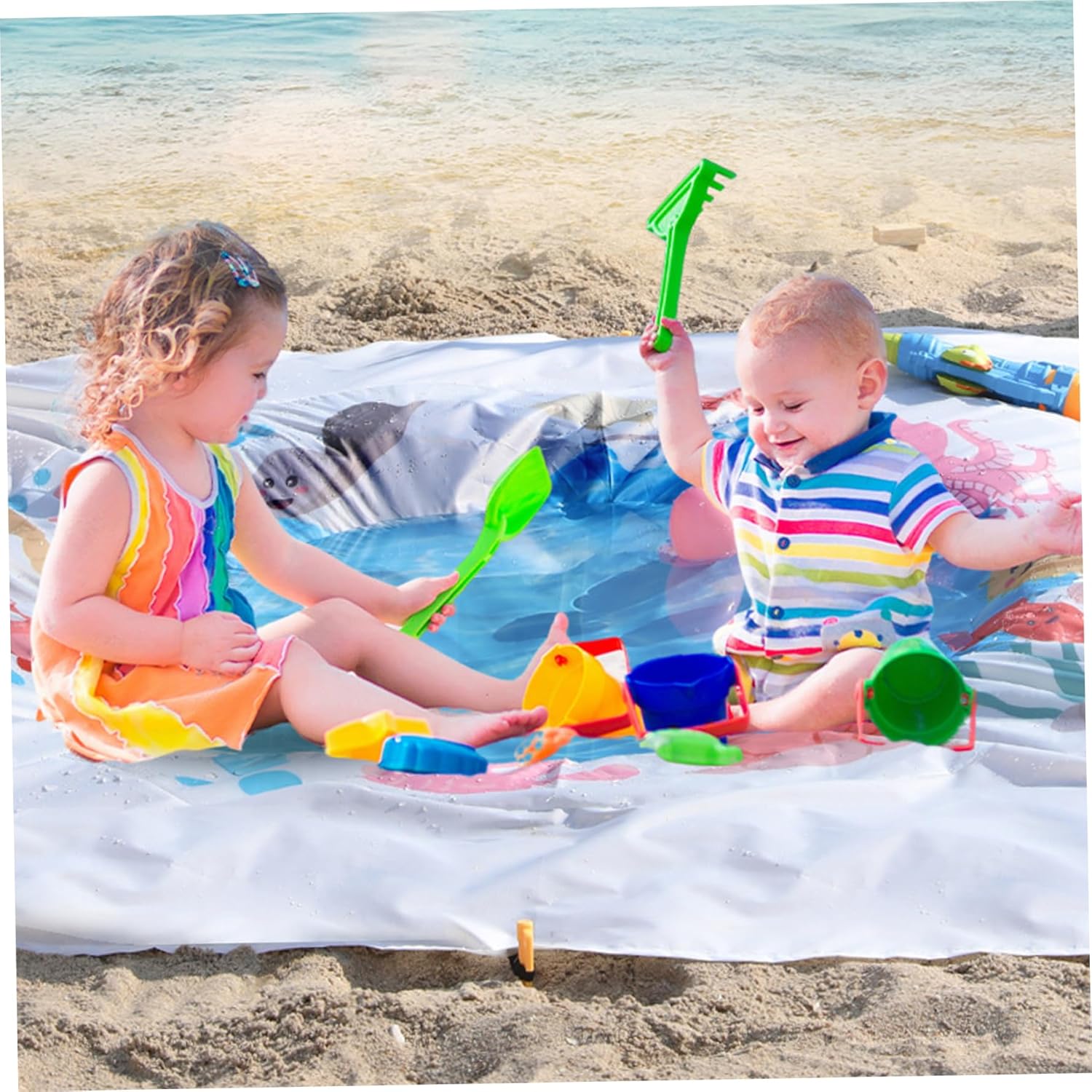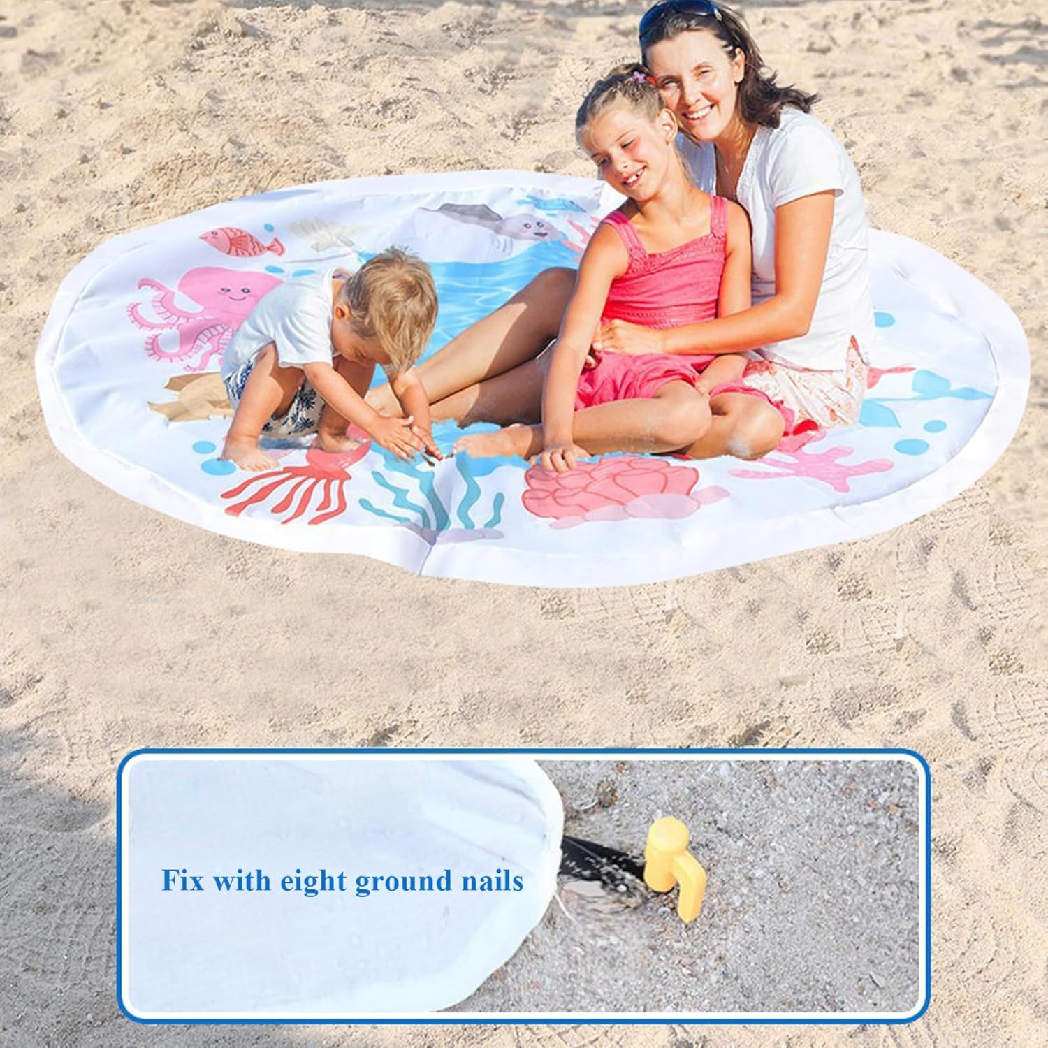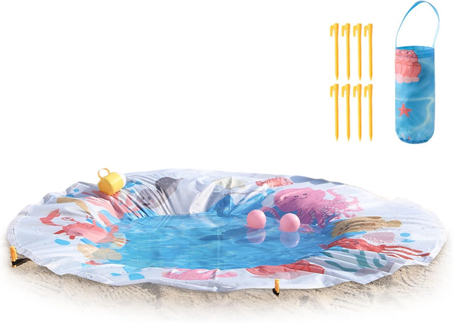 Comodo stoccaggio e stabilità: include comode borse per riporre la piscina in ordine e trasportarla quando non in uso, e chiodi a terra per fissare la piscina su superfici sabbiose o erbose, prevenendo movimenti indesiderati e ribaltamenti durante il gioco. Materiale sicuro e affidabile: realizzata con materiali resistenti all'usura e non tossici, la piscina da spiaggia indefinita garantisce la sicurezza e il divertimento duraturo del tuo bambino durante le giornate soleggiate in spiaggia o in giardino..La sua struttura robusta resiste al gioco duro e a varie condizioni esterne. Versatile accessorio da spiaggia per bambini: funge anche da paraspruzzi, da area giochi acquatica o da minipiscina sicura, adatta sia per ambienti interni che esterni..È uno dei migliori giocattoli da spiaggia per i più piccoli, offrendo ore di gioioso gioco sensoriale e rinfrescandosi nelle giornate calde. Portatile e facile da installare: leggera e con un diametro di 4,6 piedi, questa piscina rotonda da spiaggia è semplice da trasportare e veloce da gonfiare o riempire d'acqua, rendendola ideale per viaggi in famiglia, gite al parco o uso domestico..Viene fornito con pratiche borse portaoggetti e chiodi a terra per un posizionamento sicuro ovunque. Divertente design a cartoni animati: con stampe di cartoni animati colorate e accattivanti, questa piscina per bambini attira l'attenzione dei bambini e incoraggia l'interazione giocosa..Perfetto per ragazzi e ragazze da 1 a 3 anni, unisce divertimento e relax.