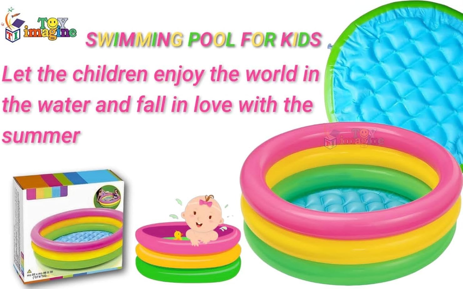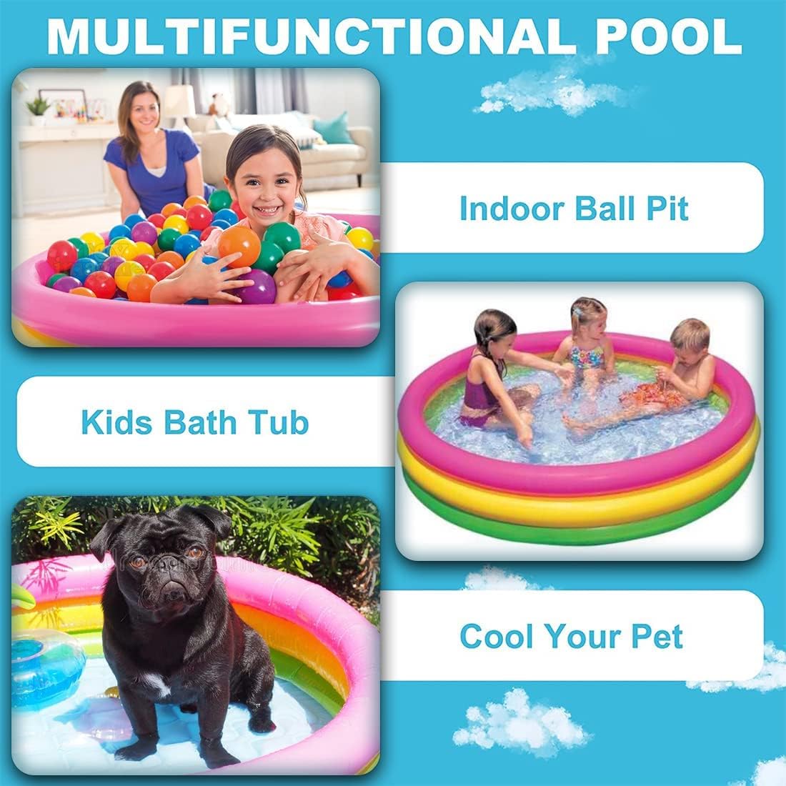 Design versatile: piscina multifunzionale adatta per nuoto, vasca da bagno, piscina per animali domestici, perfetta per intrattenimento interno ed esterno con vivaci colori arcobaleno Dimensioni: 229 x 147 x 47 cm con capacità di 500 litri, fornendo ampio spazio per più utenti per godersi le attività acquatiche Facile installazione: non è necessario gonfiare: basta stenderlo su un terreno pianeggiante e riempire con acqua per un divertimento istantaneo, rendendo il montaggio rapido e senza problemi Struttura durevole: realizzata in PVC di alta qualità con pareti robuste che mantengono la forma quando riempite per una maggiore stabilità e longevità Comodità portatile: il design completamente pieghevole consente di riporlo in modo compatto e facile da trasportare tra luoghi interni ed esterni