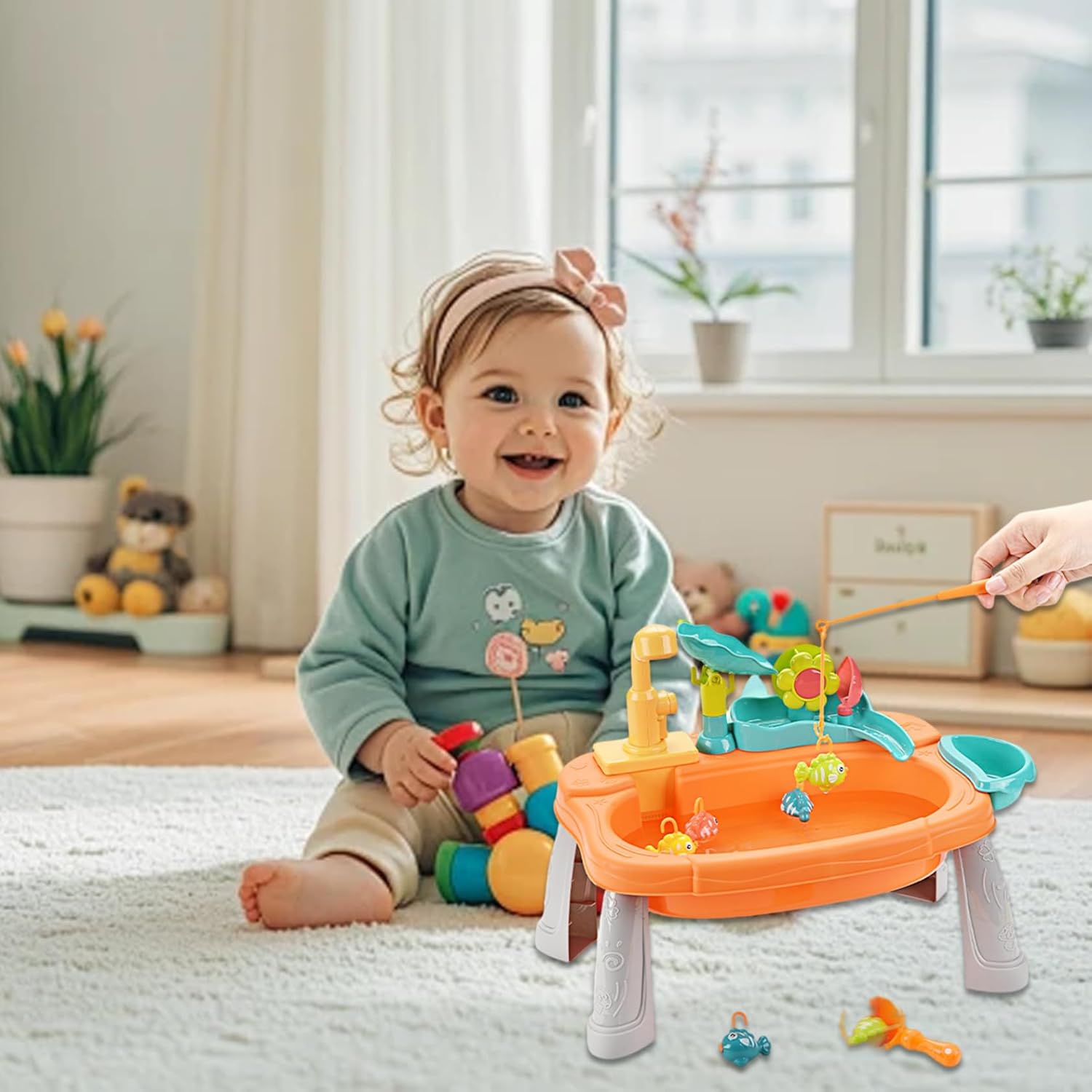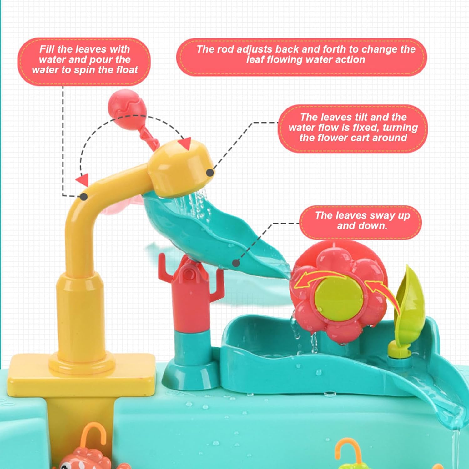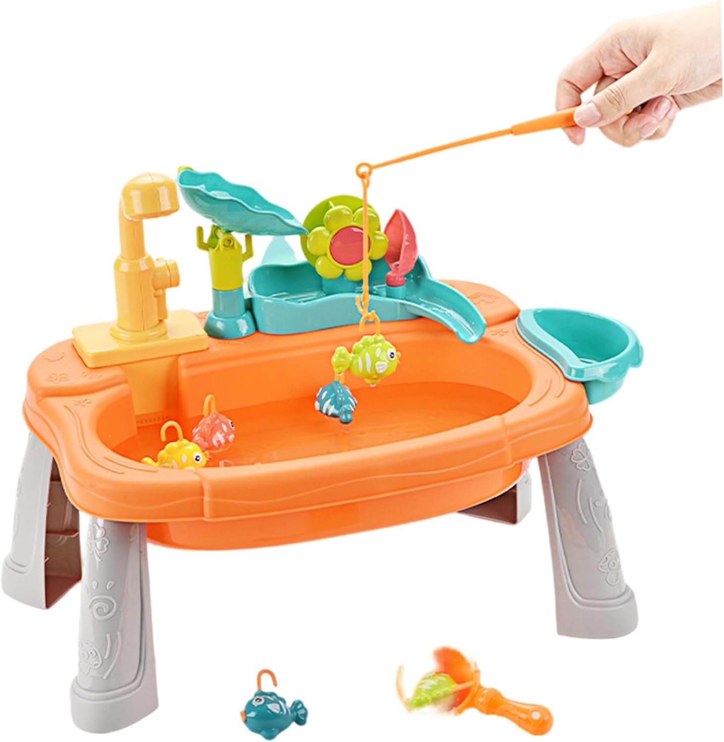 Materiali sicuri e adatti ai bambini: realizzati con plastica atossica priva di BPA, garantiscono un ambiente sicuro per i più piccoli e possono godersi i giochi d'acqua senza problemi di salute. I bordi arrotondati aggiungono ulteriore sicurezza per le mani dei più piccoli. Set lavello da gioco: include frutta, verdura, piatti e giocattoli da pesca realistici, offrendo ore di divertimento fantasioso che incoraggia l'interazione sociale e la creatività nei bambini piccoli. Giochi d'acqua interattivi: progettato con un rubinetto rotante a 180°, questo rubinetto dell'acqua offre giochi d'acqua comodi e pratici che stimolano lo sviluppo sensoriale e le capacità motorie. I bambini possono versare, schizzare e godersi l'acqua corrente in modo sicuro e creativo. Design robusto e staccabile: realizzato in plastica di alta qualità, il tavolo ad acqua è dotato di gambe staccabili per riporlo e trasportarlo facilmente, combinando stabilità durante il gioco con praticità di montaggio e pulizia. Dimensioni perfette per i bambini: l'altezza compatta ma spaziosa del tavolo è ideale per neonati e bambini piccoli, favorendo il gioco indipendente e un facile accesso a tutti i componenti del tavolo, rendendo le impostazioni esterne o interne senza problemi.