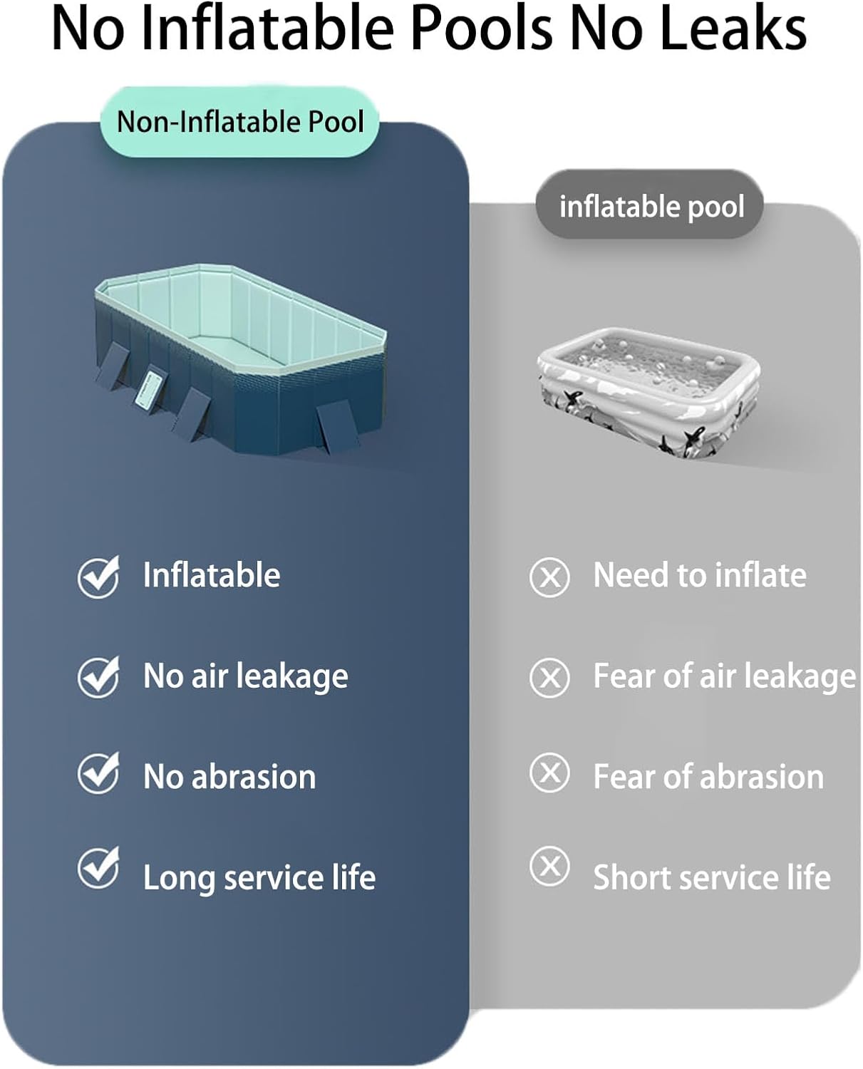 1. Realizzata con un robusto materiale a 4 strati, questa piscina rettangolare pieghevole è costruita per resistere a forature e usura, garantendo un'esperienza duratura e affidabile. La piscina è dotata di una struttura a doppia sicurezza che fornisce un forte sostegno e stabilità. 2. Nessun gonfiaggio richiesto: questa piscina pieghevole elimina il fastidio del gonfiaggio, permettendoti di goderti il tuo tempo senza preoccuparti di perdite d'aria, collassi o forature. 3. Comoda conservazione e portabilità: la piscina si ripiega comodamente in un formato compatto, rendendola facile da trasportare e riporre senza occupare molto spazio. 4. Installazione semplice: installare la piscina è un gioco da ragazzi: basta aprirla, fissare il telaio e riempirla con acqua per rilassarsi e divertirsi. Due punti di drenaggio nella parte inferiore e laterale facilitano la rimozione dell'acqua facile e veloce. 5. Multiuso: progettata per il divertimento della famiglia, questa piscina pieghevole portatile è adatta anche per animali domestici. Può essere posizionato ovunque, sia nel tuo cortile, giardino o spazi interni.