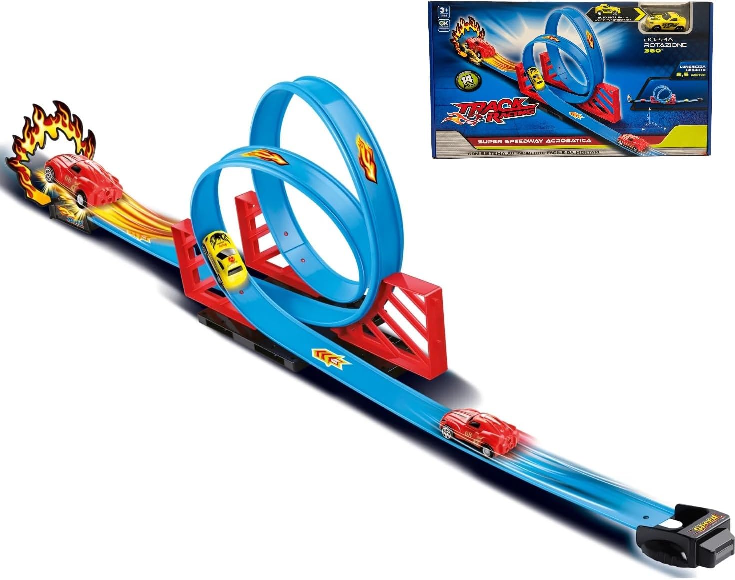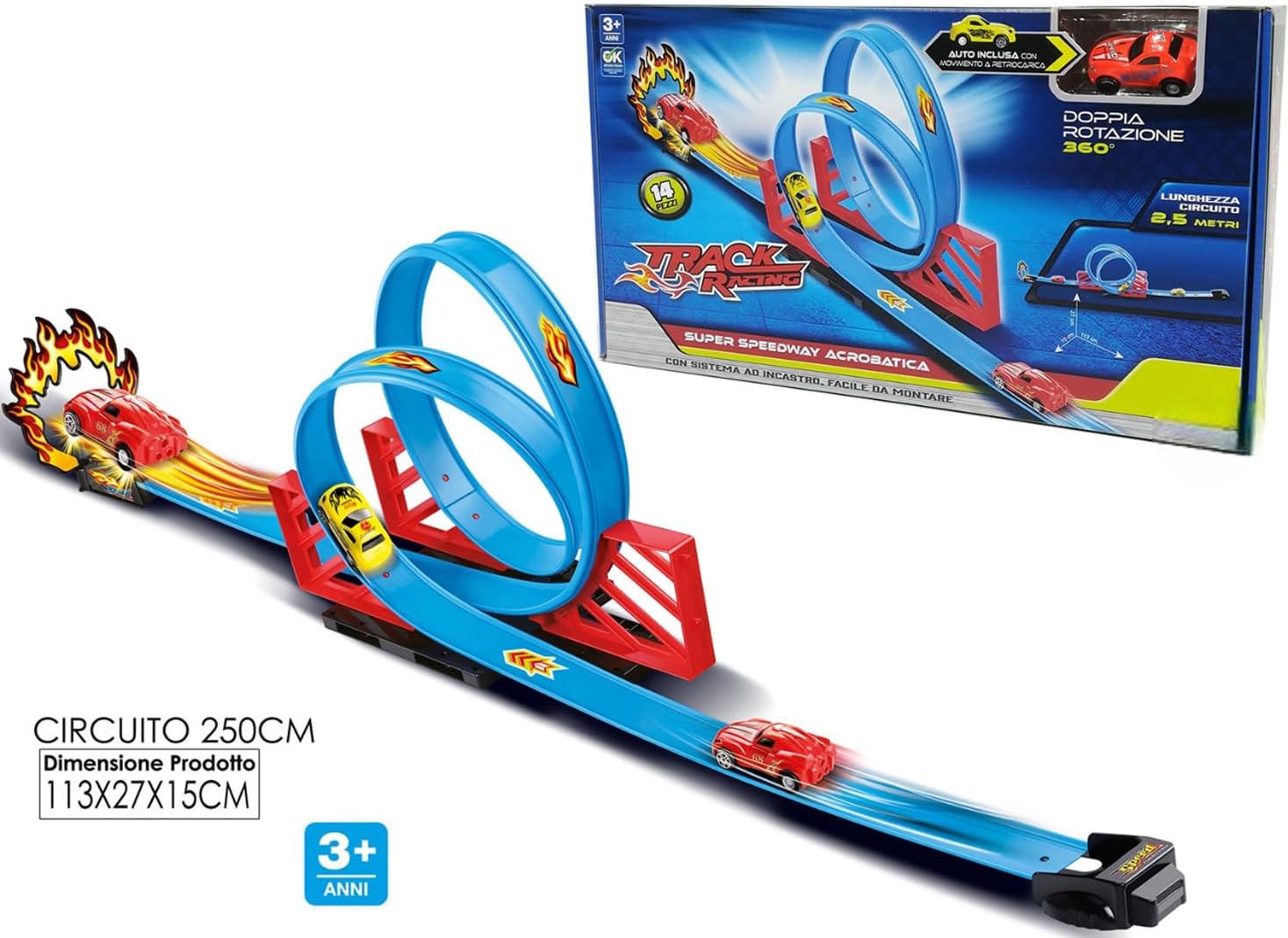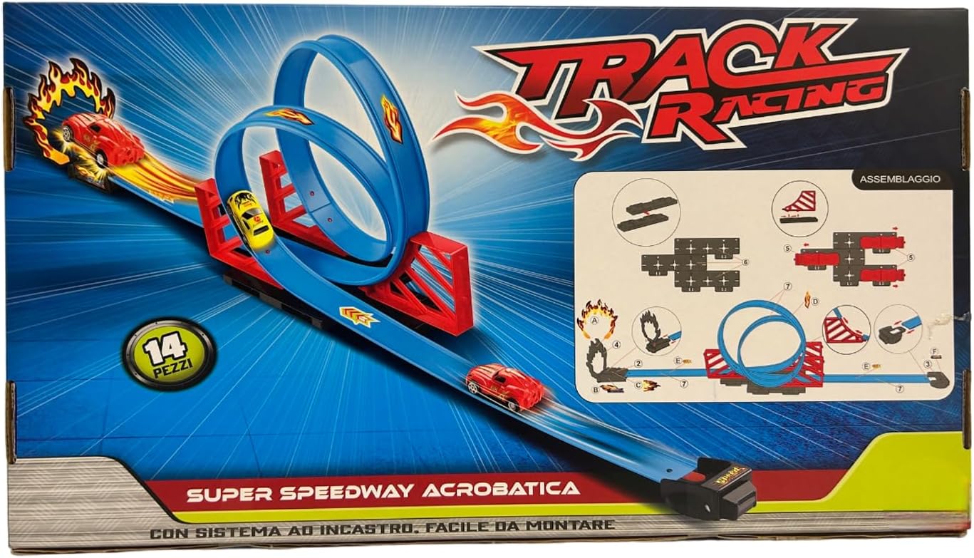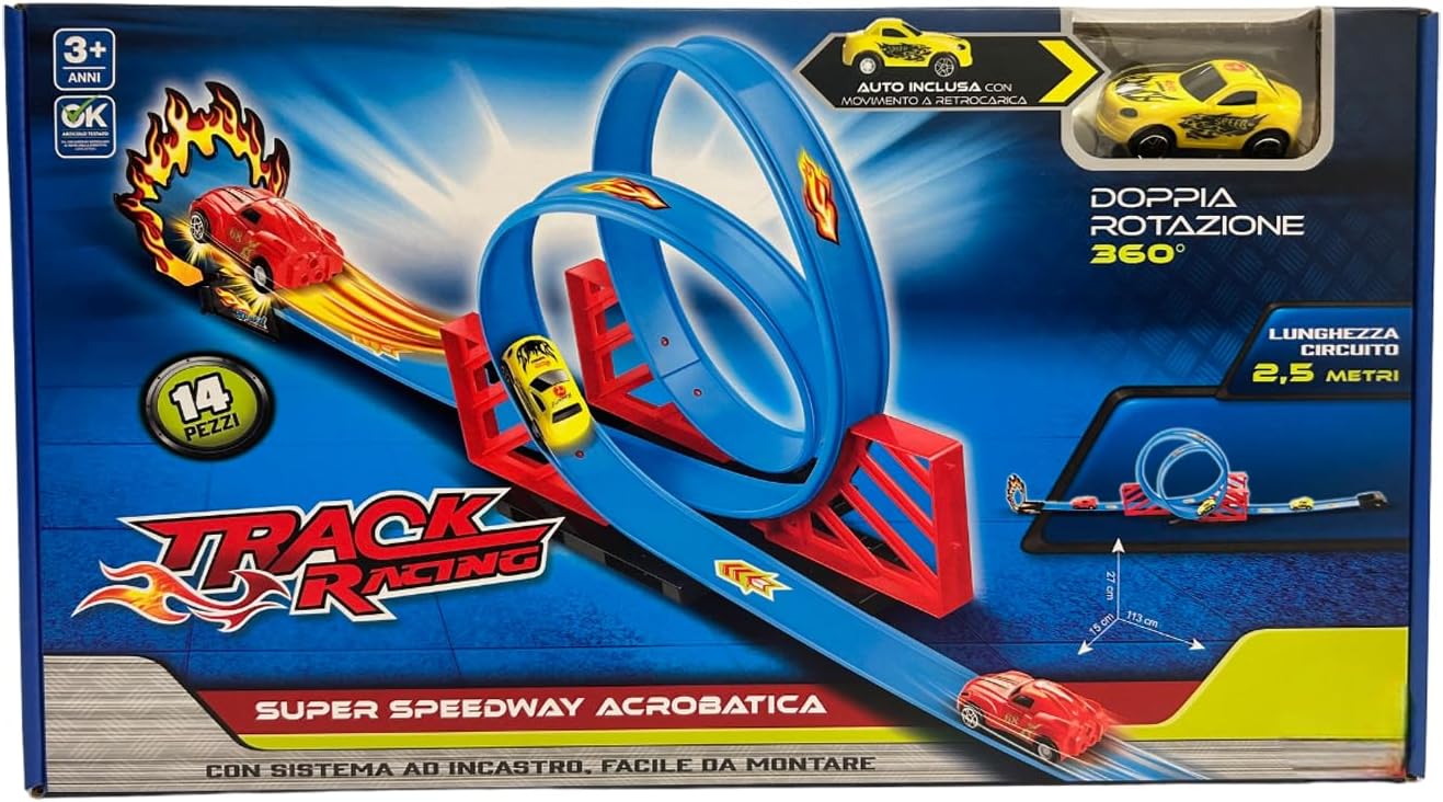 Pista Giocattolo Luminosa con Circuito di 2,5 Metri: Entra nel mondo delle corse con la Pista Track Racing lunga 250 cm, progettata per offrire un’esperienza di gioco unica e coinvolgente. Con 14 pezzi facili da assemblare grazie al sistema ad incastro, questa pista permette ai bambini di creare circuiti personalizzati e sfidanti, perfetti per ore di divertimento assicurato. Super Pista Acrobatica con Doppio Giro della Morte e Rotazione a 360°: Questa pista giocattolo è pensata per emozionare con i suoi giri della morte e la spettacolare doppia rotazione a 360°. L'auto inclusa è in grado di girare su se stessa mentre avanza, offrendo acrobazie incredibili che lasceranno i bambini senza fiato! Ideale per chi ama gare e trick da brivido. Pista Track Flessibile e Personalizzabile: Grazie alla sua configurazione flessibile, questa pista macchinine può essere assemblata in varie combinazioni, offrendo curve mozzafiato, rettilinei ad alta velocità e salti audaci. I bambini possono costruire ogni volta un percorso diverso, stimolando la creatività e rendendo ogni gara unica e coinvolgente. Sistema ad Incastro Facile da Montare e Smontare: Con il sistema ad incastro intuitivo, questa pista per macchinine è facile e veloce da montare e smontare. Perfetta per i più piccoli, permette di realizzare circuiti complessi in pochi minuti, rendendola ideale per il gioco autonomo o per momenti di condivisione con amici e famiglia. Auto con Movimento a Retrocarica Inclusa: La pista include una macchinina con movimento a retrocarica, progettata per correre a tutta velocità attraverso i giri della morte e le curve strette. Con il suo design robusto e le prestazioni dinamiche, l'auto offre una spinta ulteriore alla corsa, rendendo ogni gara elettrizzante e appassionante. Dimensioni Perfette per Giocare in Spazi Diversi: Con un ingombro di 27x15x113 cm, questa pista da corsa si adatta perfettamente a spazi interni, regalando divertimento anche in ambienti più piccoli. La Pista Track Racing è un giocattolo ideale per il gioco indoor e per sfide in casa con amici, diventando un centro di attrazione per i bambini in qualsiasi ambiente.