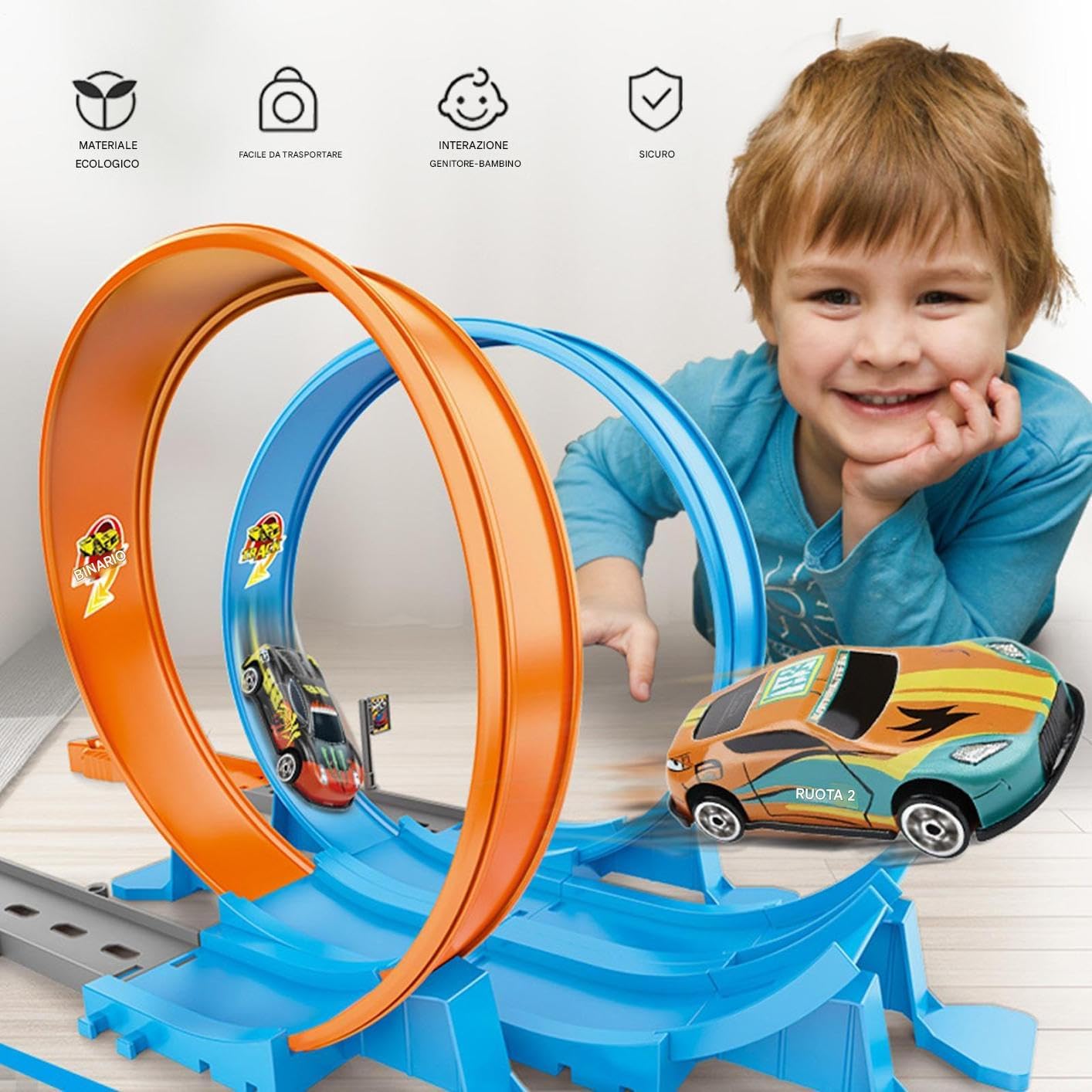 Ecologico e Sicuro: Progettato con particolare attenzione alla sicurezza infantile e realizzato con materiali sostenibili, questa pista per automobiline offre serenità ai genitori attraverso una manodattura robusta e affidabile nel Playset Antistress: Crea sessioni di gioco rilassanti ma stimolanti con questo set pista auto, a migliorare la concentrazione e la coordinazione occhio-mano attraverso sfide creative gratificanti ed educative Intrattenimento Sociale: Design versatili garantiscono divertimento continuo con corse sfidanti, promuovendo il coinvolgimento attivo tra bambini e adulti durante feste e attività familiari Gioco Competitivo Condiviso: Progettato per bambini 3-14 anni, questa pista per macchinine sviluppa capacità collaborative garantendo divertimento interattivo e competizione condivisa durante il gioco di coinvolgente e dinamico per tutti i partecipanti Esperienza di Gioco Immaginativo: Favorisce scenari fantastici permettendo alle auto di compiere acrobazie emozionanti come arrampicarsi sulle pareti e guidare sul soffitto, creando momenti di gioco avvincenti