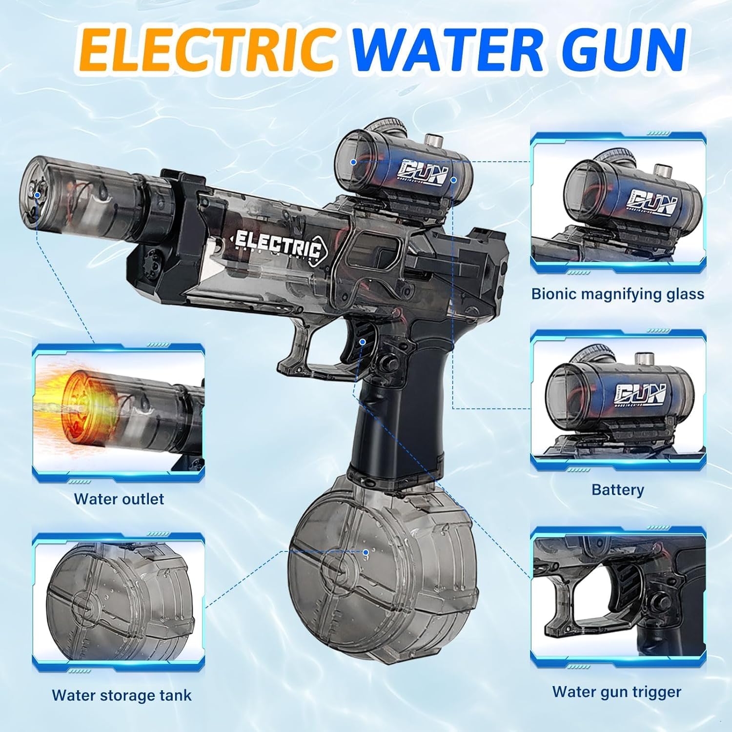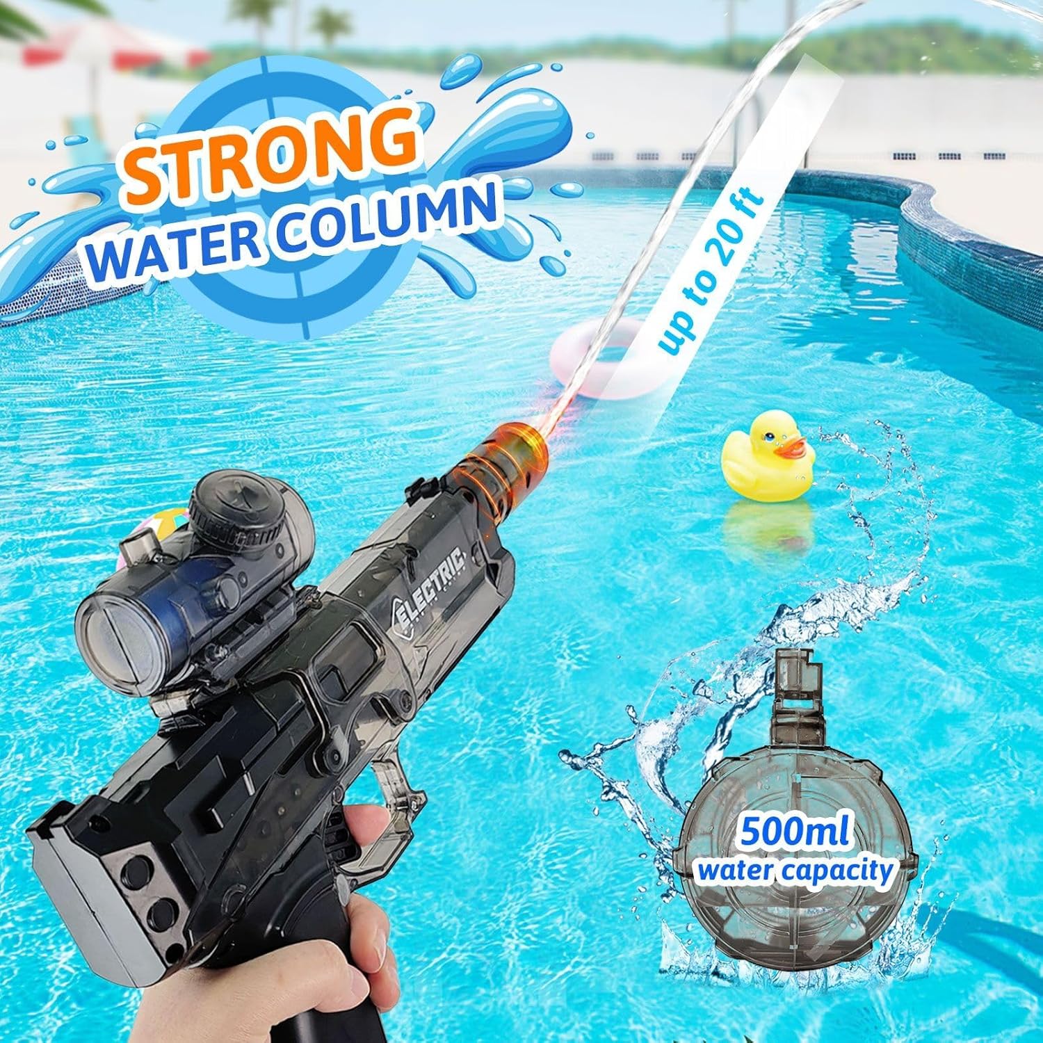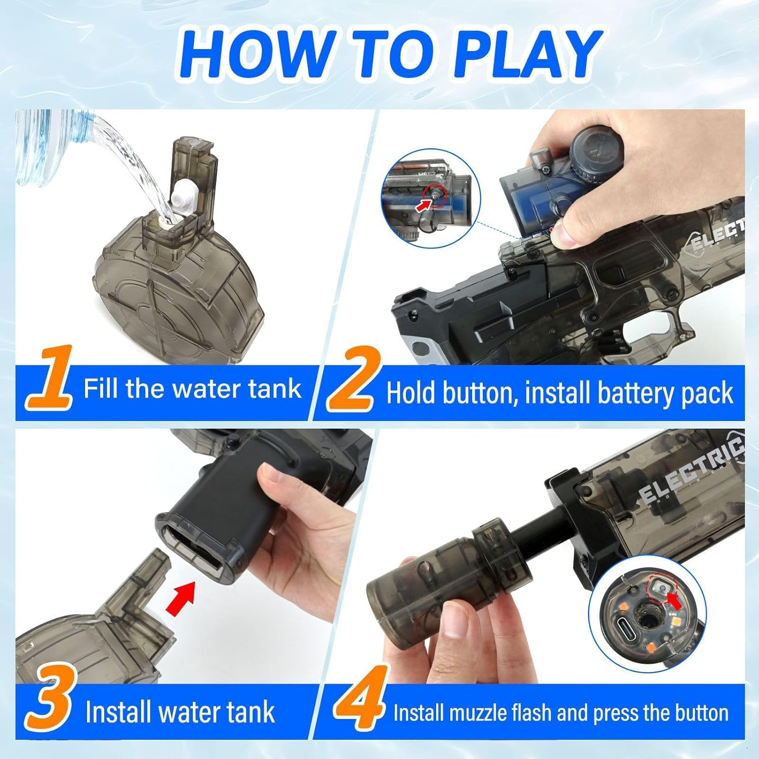 Fantastici effetti di illuminazione a LED: questa pistola ad acqua elettrica è dotata di un accattivante sistema di illuminazione a LED che si sincronizza con il flusso dell'acqua, creando un effetto visivo abbagliante. Perfette per le battaglie acquatiche diurne o notturne, le luci migliorano la tua esperienza di gioco complessiva, rendendo le tue battaglie più emozionanti e coinvolgenti. Grande serbatoio dell'acqua a tenuta stagna: la pistola idroblaster Aqua Shooter è dotata di un grande tamburo da 500 ml e un caricatore da 50 ml, progettato per un riempimento e una sostituzione facili e veloci. Il design resistente mantiene l'acqua al sicuro all'interno, prevenendo perdite e garantendo combattimenti d'acqua più lunghi e ininterrotti per tutte le età. (Segui l'immagine 5 o le istruzioni per l'installazione) Portata impressionante per i combattimenti in acqua: la pistola ad acqua offre un raggio di tiro impressionante fino a 6 m. Che tu stia mirando a un bersaglio o impegnandoti in un combattimento acquatico a lunga distanza, questa pistola ad acqua offre precisione e portata migliorate, rendendola perfetta per bambini e adulti. Sistema di alimentazione affidabile: dotata di una batteria ad alta capacità da 1200 mAh, questa pistola ad acqua elettrica fornisce un flusso d'acqua stabile e potente. Garantisce prestazioni eccellenti, mantenendoti al top del tuo gioco durante le battaglie in acqua. Il sistema di alimentazione durevole garantisce affidabilità in tutte le situazioni di gioco. Perfetto giocattolo acquatico estivo: le pistole ad acqua per bambini sono un giocattolo estivo indispensabile per il divertimento all'aria aperta. Che si tratti di una festa in piscina, di una gita in spiaggia o di una battaglia d'acqua in giardino, questo irrigatore facile da trasportare garantisce un divertimento senza fine, creando ricordi indelebili con la famiglia e gli amici.