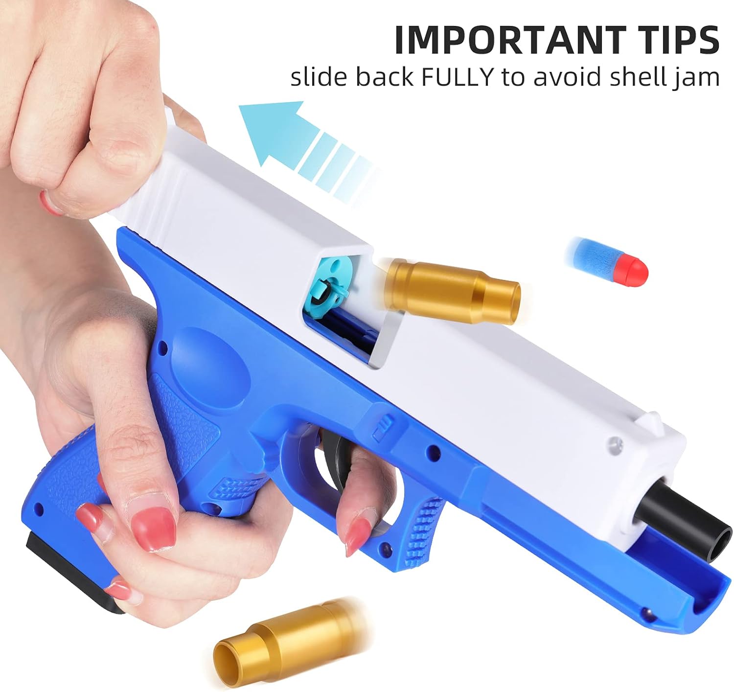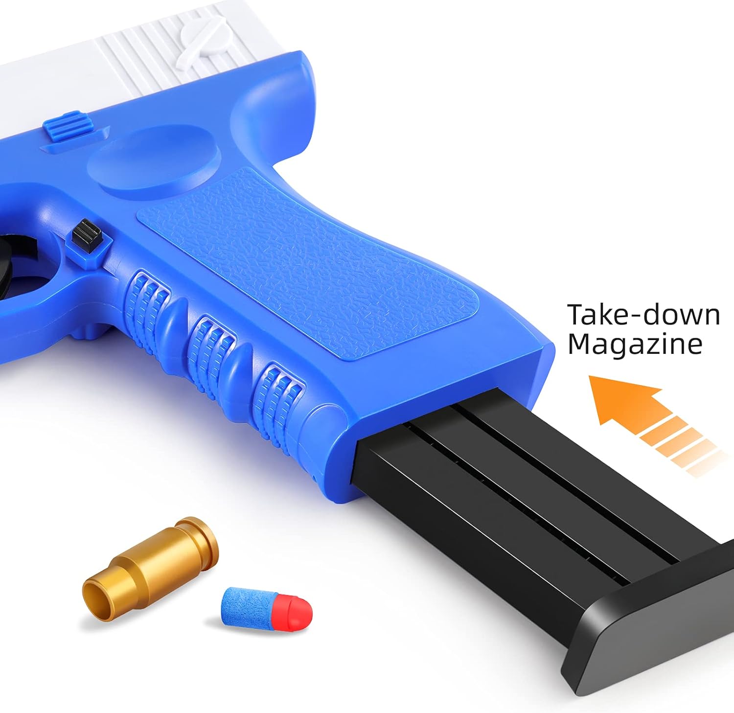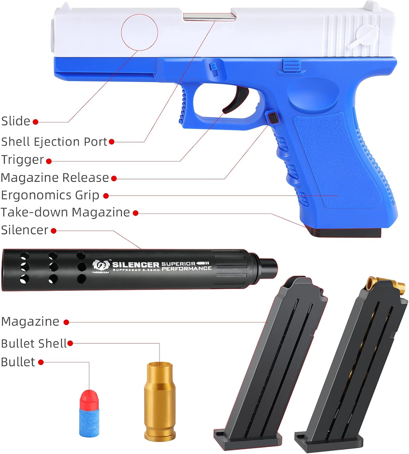 Caratteristiche: espulsione del proiettile, caricatore staccabile, proiettile morbido e sicuro, kit di accessori all-in-one per combattimenti senza fine. Esperienza di tiro: la pistola giocattolo utilizza un caricatore a molla per la ricarica dei proiettili. L'azione Slide back è realistica come se fossero autentici mentre è molto più leggera e liscia per i bambini per le loro mani non così forti. Scopo educativo: per il gioco di combattimento, il gioco della pistola fornisce pratica, migliore concentrazione e capacità di mira. Il set di pistole giocattolo è appositamente progettato per i bambini di età superiore ai 6 anni. Qualità e SICUREZZA: EN71 Test approvato. Anti-goccia — Stampo pressofuso per impieghi gravosi. Realizzato in plastica ABS di alta qualità. Le freccette sono realizzate in morbida schiuma eva che assicura che le persone non si facciano male. Confezione: il kit pistola giocattolo viene fornito con 1 pistola, 1 silenziatore, 2 caricatori, 60 proiettili di gomma, 24 bossolo, 1 manuale.