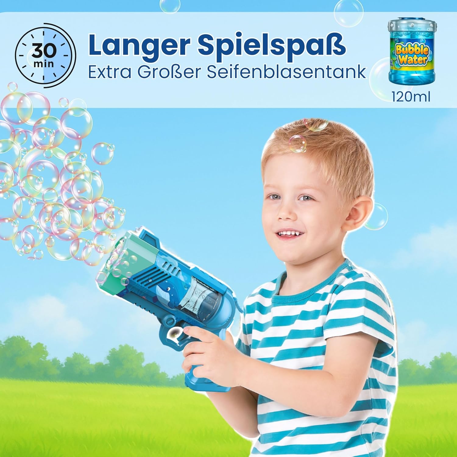 Oltre 8000 bolle grandi: la pistola a bolle Blubbel Blaster è dotata di un enorme serbatoio per bolle di liquido da 90 ml e un potente motore per bazooka a bolle. La macchina per bolle crea fino a 8000+ bolle di sapone al minuto. La macchina elettrica per bolle nuziali è alimentata da 4 batterie AA. (non incluso) Macchina per bolle facile da usare e illuminata per bambini: la pistola per bolle ha un'impugnatura ergonomica che consente un funzionamento senza sforzo per i bambini di tutte le età. Inoltre, la pistola a bolle è dotata di affascinanti luci LED che creano un'atmosfera magica durante il gioco. Macchina per bolle durevole e a prova di perdite - Realizzata in resistente materiale ABS, la macchina per bolle Blubbel è progettata per resistere al gioco duro dei bambini. Il suo design a prova di perdite a 360 gradi garantisce che il liquido delle bolle non fuoriesca. Design adatto ai bambini La macchina per bolle portatile xxl è dotata di pulsanti facili da premere per bambini dai 3 anni in su. La grande pistola a bolle è per ragazzi e ragazze, fratello, sorella, uomini, donne. Regalo ideale: un'atmosfera giocosa piena di bolle di sapone per i bambini nel giorno del loro compleanno o come regalo di Natale per ragazze, ragazzi di 3, 4, 5, 6, 8, 9, 10 anni. La macchina per bolle è ideale come decorazione per matrimoni, bomboniere per attività per bambini, bomboniere per bolle di sapone nuziali.