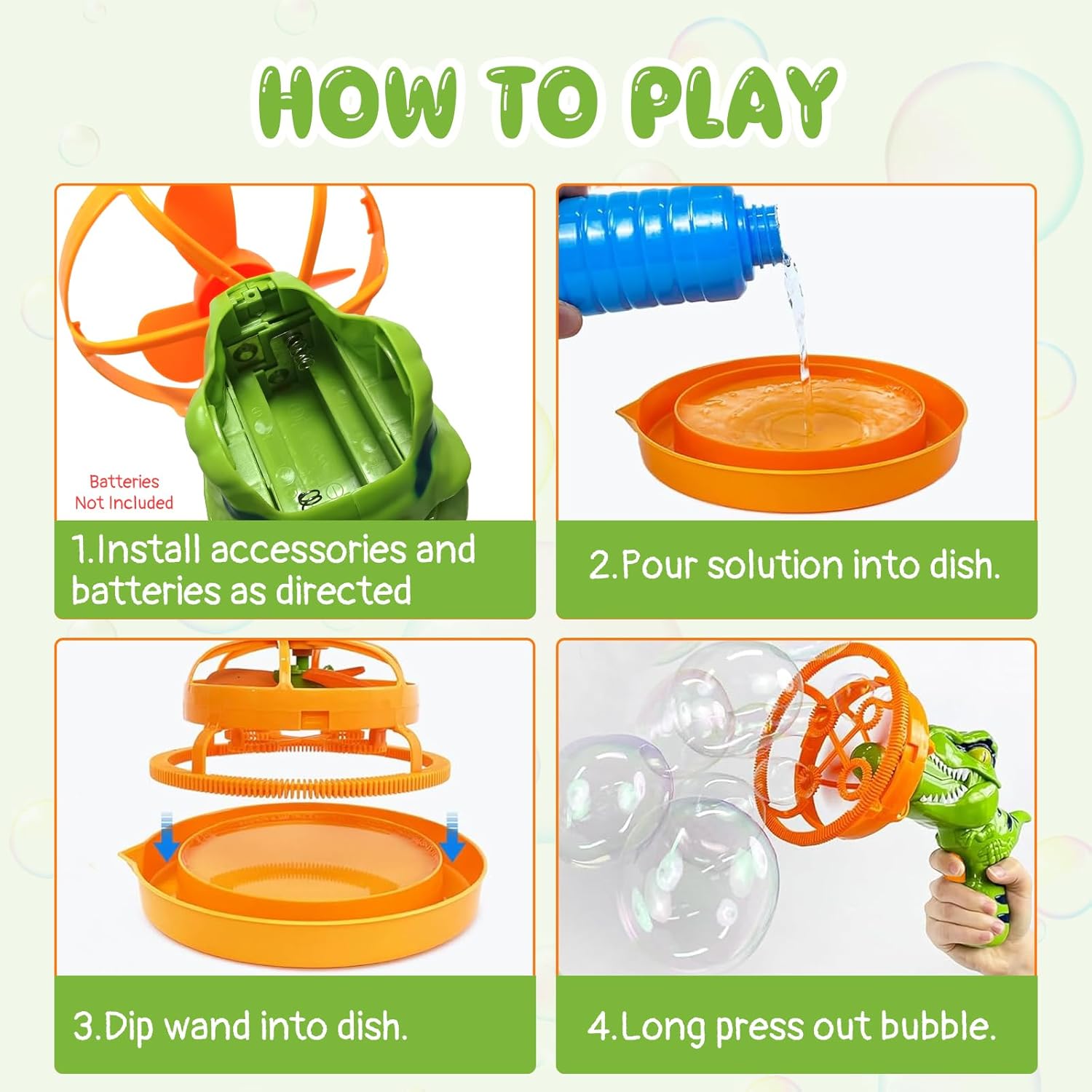 【Crea bolle gigantesche】 È un giocattolo divertente e speciale che si distingue dalle altre pistole a bolle. La nostra esclusiva pistola a bolle di dinosauro crea bolle grandi e piccole contemporaneamente e avvolge le bolle piccole con un grande effetto bolla, offrendo un divertimento senza fine ai bambini. Sorprendi ed emoziona tutti i fan dei dinosauri o gli amanti delle bolle con questa divertente e unica pistola a bolle. 【Rapporto qualità-prezzo】 La nostra esclusiva macchina per bolle forma una grande bolla che avvolge bolle più piccole, godendo del doppio piacere delle bolle. La confezione contiene una pistola per bolle dinosauro, 1 piatto per bolle, 1 flacone di soluzioni da 250 ml e 5 pacchetti aggiuntivi di liquido per bolle concentrato. Questo è un set regalo con bolle di grande valore per ragazzi, ragazze e bambini piccoli. Facile da usare: basta inserire 3 batterie AA (non incluse), aggiungere il liquido per bolle sul fondo della macchina per bolle e premere il pulsante di commutazione. Il cannone a bolle produrrà una serie di bolle colorate, offrendo intrattenimento infinito ai bambini nei parchi, cortili, campi da gioco e prati. Inoltre, può essere utilizzato come un piccolo ventilatore per una brezza fresca. 【Perfetto per riunioni all'aperto】 Sorprendi i tuoi cari con un divertimento infinito e un'atmosfera da sogno. Adatto a molti tipi di attività all'aperto e perfetto per catturare foto e video straordinari. Ottimo per feste a tema, feste di compleanno, bomboniere, viaggi in campeggio, matrimoni, aule e altro ancora. Regalo ideale per ragazze e ragazzi. 【Sicuro e durevole】 Realizzata in resistente materiale ABS, la nostra pistola a bolle garantisce un divertimento duraturo. Senza spigoli vivi o odori sgradevoli, garantisce ai bambini un momento di gioco senza preoccupazioni e la soluzione a bolle non tossica è sicura per bambini e animali domestici. I bambini possono trasportarlo, lasciate che si divertano a rincorrere le bolle in tutta sicurezza!