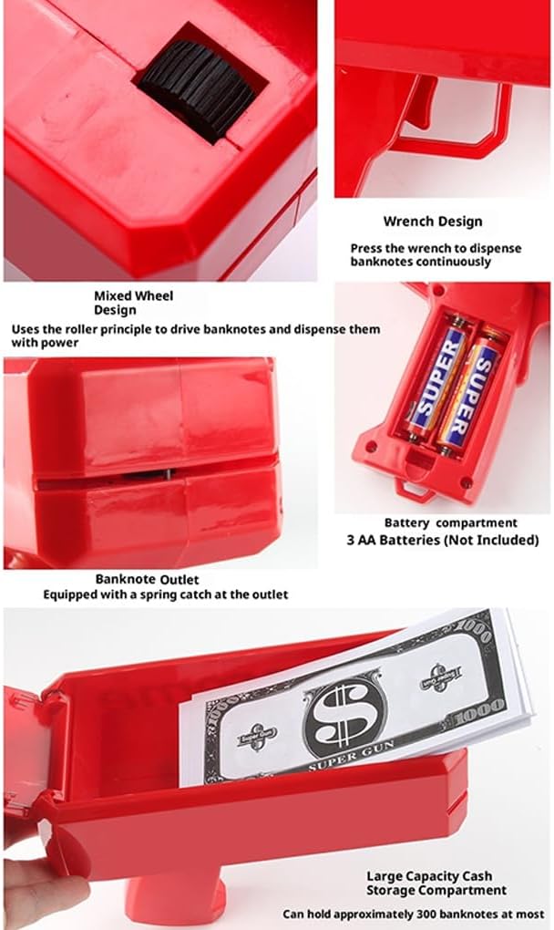 Materiale robusto: questo nuovo e fantastico giocattolo spruzza denaro come una doccia a pioggia. Realizzato in materiale di sicurezza ABS di alta qualità, è bello e divertente Facile da usare: utilizzare un cacciavite per svitare il coperchio, inserire la batteria (non inclusa) nel coperchio, aprire il coperchio superiore e inserire le banconote in modo pulito e uniforme (senza pieghe). Lasciali cadere come una doccia a pioggia e assicurati che le banconote siano distribuite nella giusta direzione. Multiuso: questo fantastico giocattolo per feste è adatto per feste, lauree, addii al nubilato, discoteche, matrimoni, Natale, feste di compleanno, riunioni di famiglia, feste aziendali e altro ancora. Regalo: questo fantastico regalo per ragazzi e ragazze è adatto per feste, compleanni, riunioni e festività. È disponibile su entrambi i lati senza loghi e può essere progettato da solo. Adatto per più oggetti: allineare gli oggetti inseriti nella money gun in banconote o simili e poi coprirli