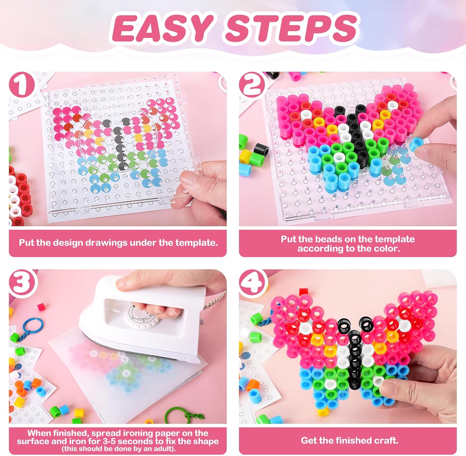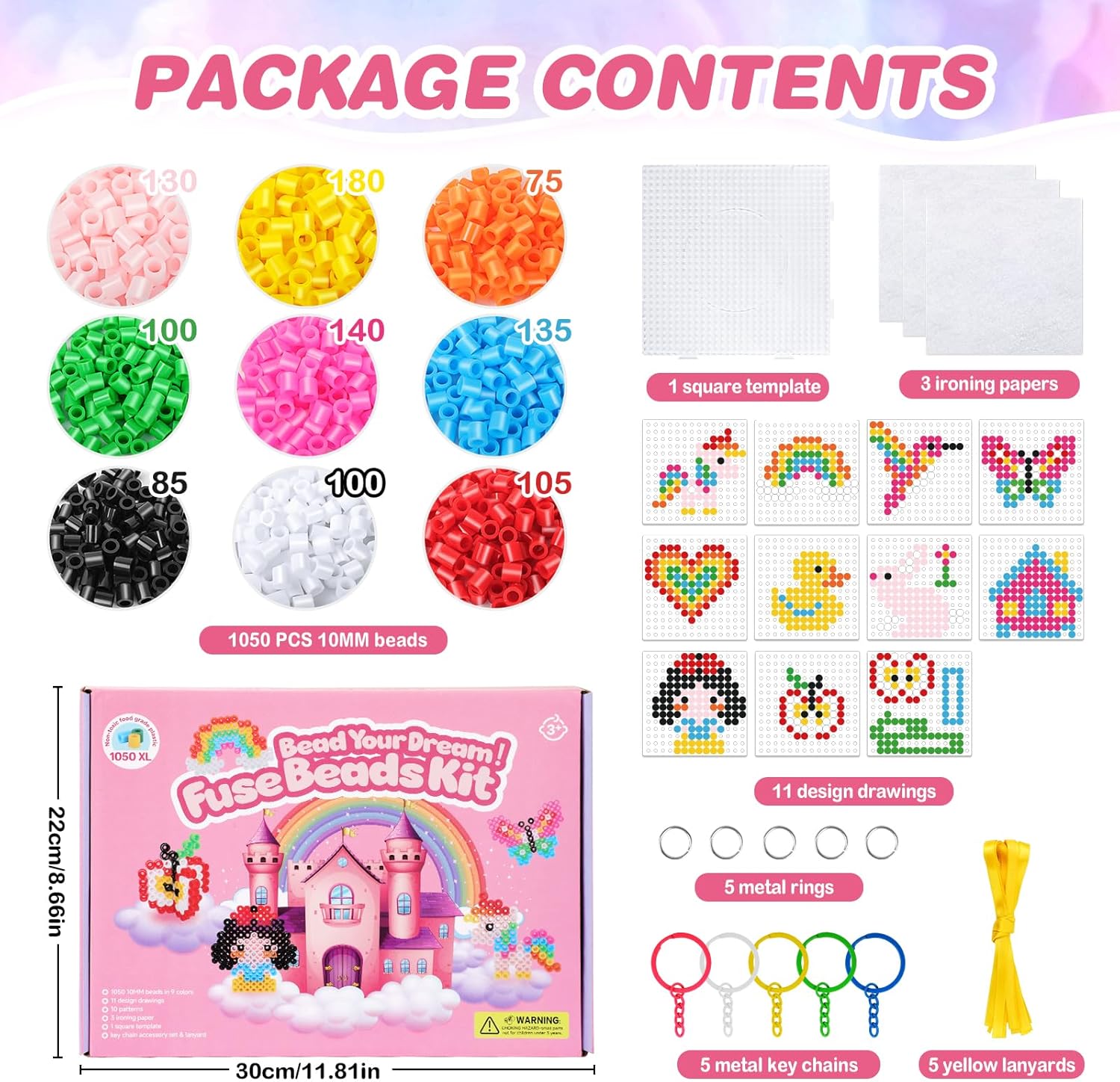 🦄【Contenuto della Confezione】Kit perline da stirare include: 1050 pezzi perline da stirare in 9 colori, 1 quadrato trasparente base per perline da stirare, 11 disegni di design, 3 carte da stiro, 5 portachiavi in metallo colorato, 5 anelli aperti e 5 cordini gialli. Dotato di una gamma completa di strumenti, puoi provare a creare diversi modelli. 🌈【Materiale Sicuro】Perline da stirare 10mm e gli accessori sono realizzati in materiale EVA ecologico. Gli perline da stirare 10mm sono dai colori vivaci, sicuri e inodori e adatti ai bambini. Il materiale è resistente e durevole, non facile da rompere. I chiodi di plastica sugli pegboard per perline a fusione hanno meno probabilità di sciogliersi o piegarsi durante la stiratura. 🍎【Giocattoli Educativi】Le attività artigianali possono coltivare l'abilità pratica dei bambini, la capacità di coordinazione e la capacità di riconoscimento dei colori. Perline a fusione set include la modellazione tridimensionale 3D per stimolare la creatività e l'immaginazione dei bambini. Perline da stirare porta un divertimento creativo fatto a mano ai bambini dai tre anni in su. 👸【Facile da Usare】 Gli fuse beads sono facili da tenere anche per le mani piccole. Basta mettere il disegno del design sotto base per perline da stirare, mettere le perline sul modello in base al colore e infine stirarlo dagli adulti per ottenere squisiti lavoretti. Semplici giochi genitore-figlio possono farti trascorrere un momento felice con la tua famiglia. 💗【Regalo Perfetto】Per i bambini che amano la creazione artistica, perline da stirare kit completo può essere utilizzato per realizzare portachiavi, magneti da frigorifero, decorazioni per la scrivania, sottobicchieri, opere d'arte decorative. Questo perline da stirare viene fornito con una bellissima confezione regalo, che è un regalo ideale per i bambini a Pasqua, Natale, Capodanno, compleanni o altre occasioni memorabili.