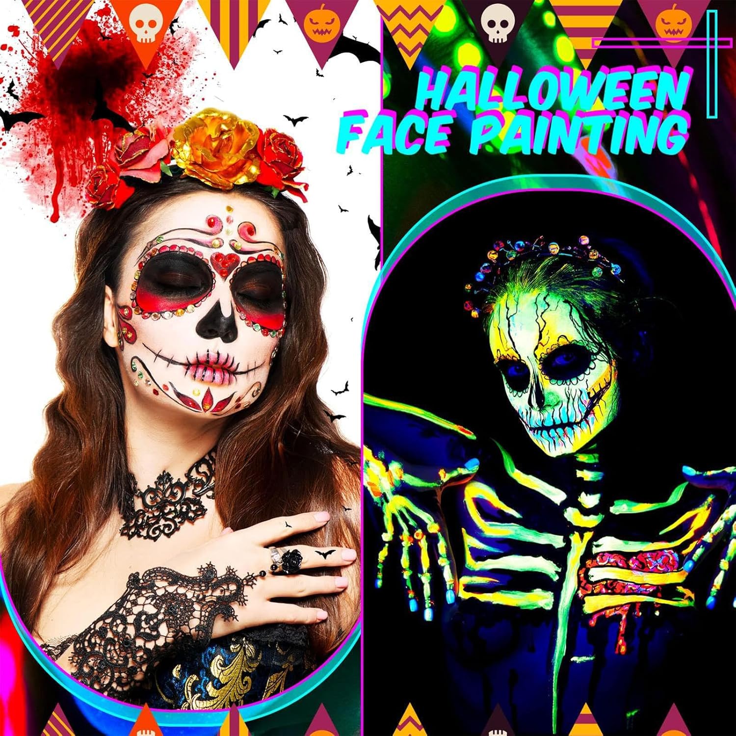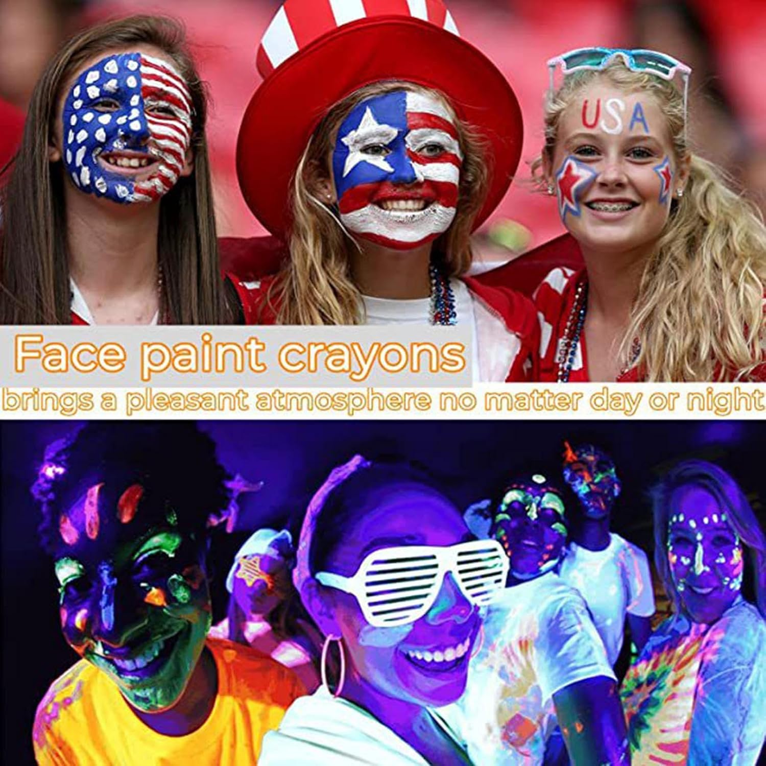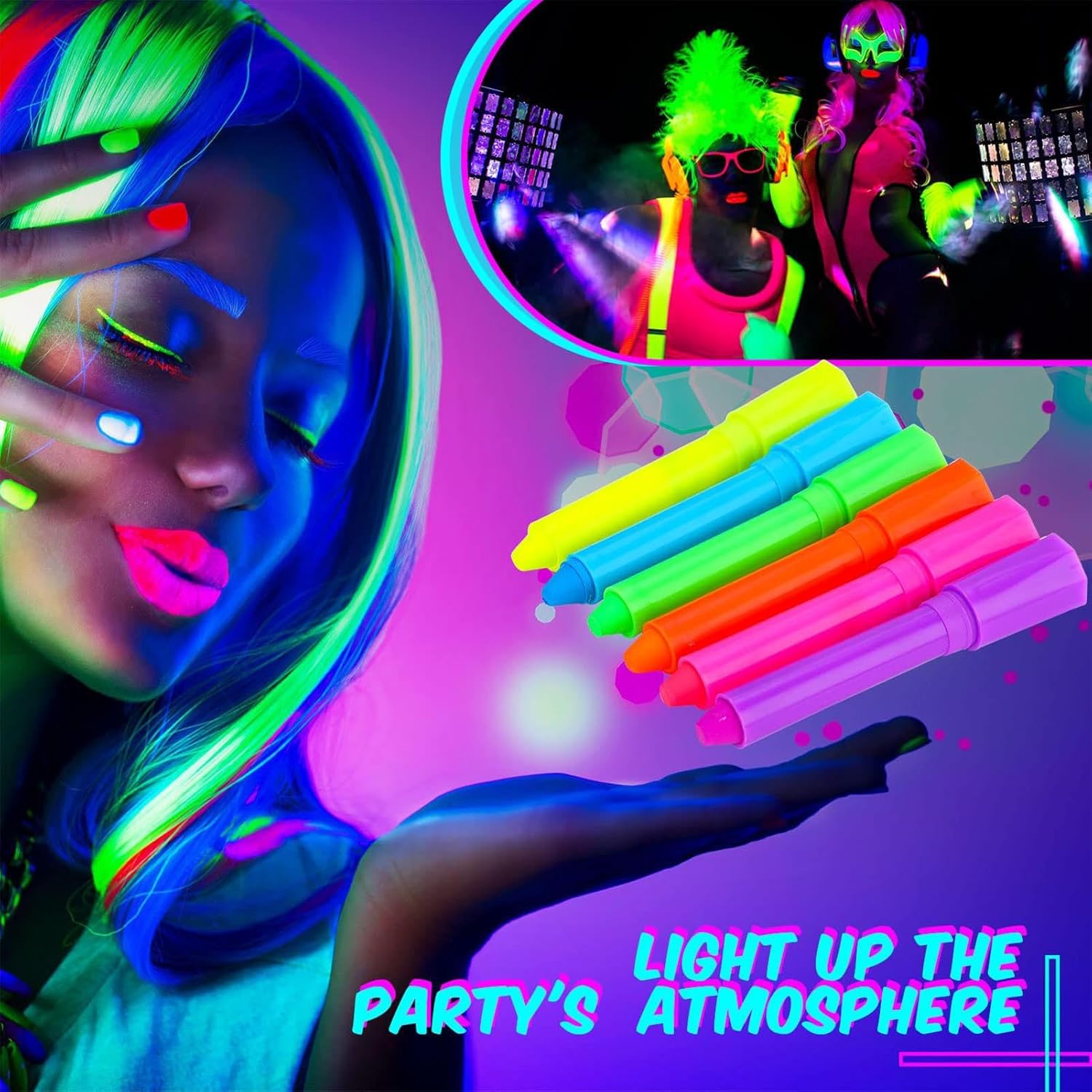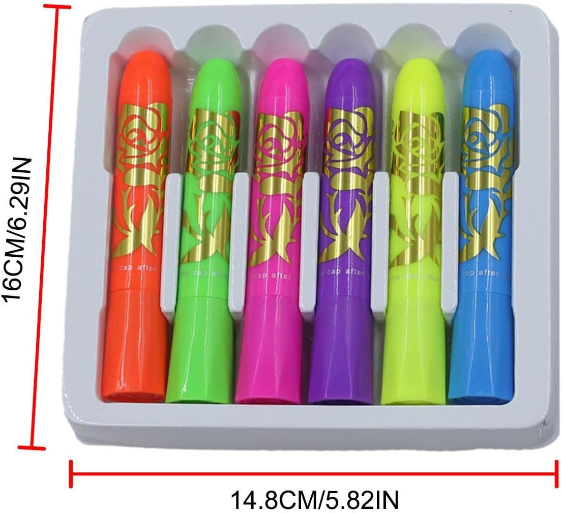 Materiali Durevoli: Realizzata con materiale PP a lunga durata, questa vernice per il corpo fosforescente evita deformazioni o rotture, assicurando una delicata e sicura applicazione sulla pelle Esperienza senza sforzo: Formula luminosa abbinata a design a torsione assicura applicazione facile e rimozione delicata con salviette struccanti Impieghi Diversificati: Adatto alla creatività quotidiana e performante in contesti teatrali, costume play, celebrazioni Halloween e incontri sociali. Affidabile in ogni utilizzo Vernice Glow Condivisibile: Include 6 colori radianti luminescenti, pensata per essere condivisa con amici e famiglia, offre varietà sufficiente per creatività quotidiana o festeggiamenti senza limiti, adatta a ogni momento Colori Neon Vividi: Effetto luminescente sotto luce nera assicura disegni brillanti e visibili, rendendo questa pittura corpo ideale per risaltare a festival, o eventi a tema con tonalità neon vivide