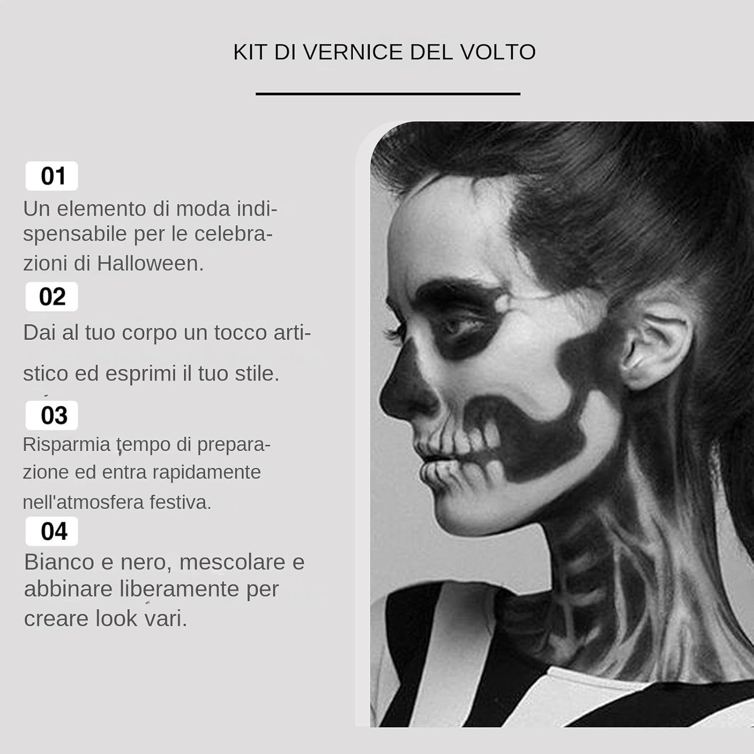 Formula delicata: concediti una pittura per il viso in bianco e nero con i nostri ingredienti per il trucco delicati e non irritanti. Perfetto per tutti i tipi di pelle, anche quella sensibile. Tonalità in bianco e nero: le tonalità in bianco e nero si adattano perfettamente al tema misterioso e inquietante di Halloween, in forte contrasto per entrare immediatamente nella baldoria festosa, sia che ti trasformi in fantasmi, zombi o personaggi classici dei film in bianco e nero. Semplice da usare: potenzia la tua immaginazione con la nostra pittura per il viso in bianco e nero. La nostra vernice per il viso garantisce una facile applicazione, consentendoti di rappresentare disegni straordinari senza esperienza precedente. Trucco prolungato: assicurati che il tuo trucco rimanga intatto con la nostra vernice per il viso in bianco e nero. Goditi un look perfetto tutta la notte con la nostra formula impermeabile e resistente al sudore. La nostra vernice assicura che la colorazione sia salda, mantenendo il tuo aspetto perfetto per tutta la notte, anche sotto risate, balli e leggeri sfregamenti. Pulizia senza sforzo: dì addio sfregamento energico poiché la nostra vernice per il viso in bianco e nero può essere facilmente rimossa con un normale detergente o struccante, senza causare danni alla pelle.