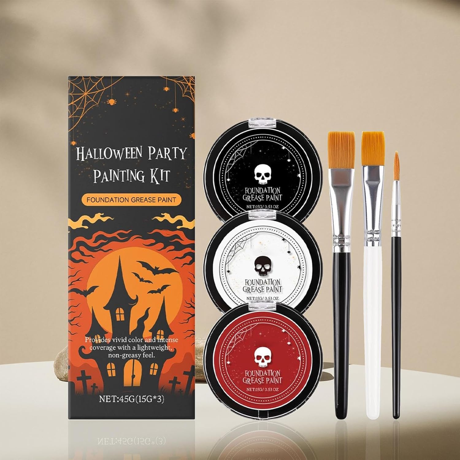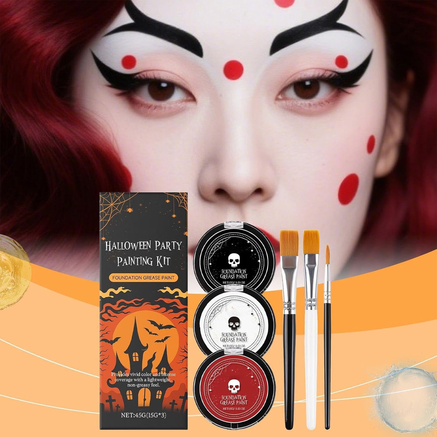 Adatto a tutti: Soluzione creativa per performance teatrali, feste Halloween ed eventi tematici, supporta la fantasia con utilizzi diversificati in occasioni speciali per bambini e adulti, garantendo esperienze coinvolgenti Formula Delicata per Pelli Sensibili: Prodotto con ingredienti cosmetici di qualità, questa pittura viso offre un comfort prolungato durante le festività di Halloween senza rischi di irritazione, ideale per pelli reattive e delicate. Effetto Duraturo: Pigmenti ricchi assicurano risultati vividi con un solo passaggio per disegni gotici e vampiri. Tenuta prolungata senza sbavature o perdita di colore durante feste movimentate. Utilizzo Intuitivo: Stendi uniformemente il colore con pennello, spugna o polpastrelli, e cancella ogni traccia con detergente delicato e risciacquo per esperienza senza stress Kit Completo: Formula crema-polvere nel bianco per effetto opaco, texture cremosa a base in nero e rosso, ideale per makeup quotidiano o festivo. Include tre pennelli per applicazione precisa.