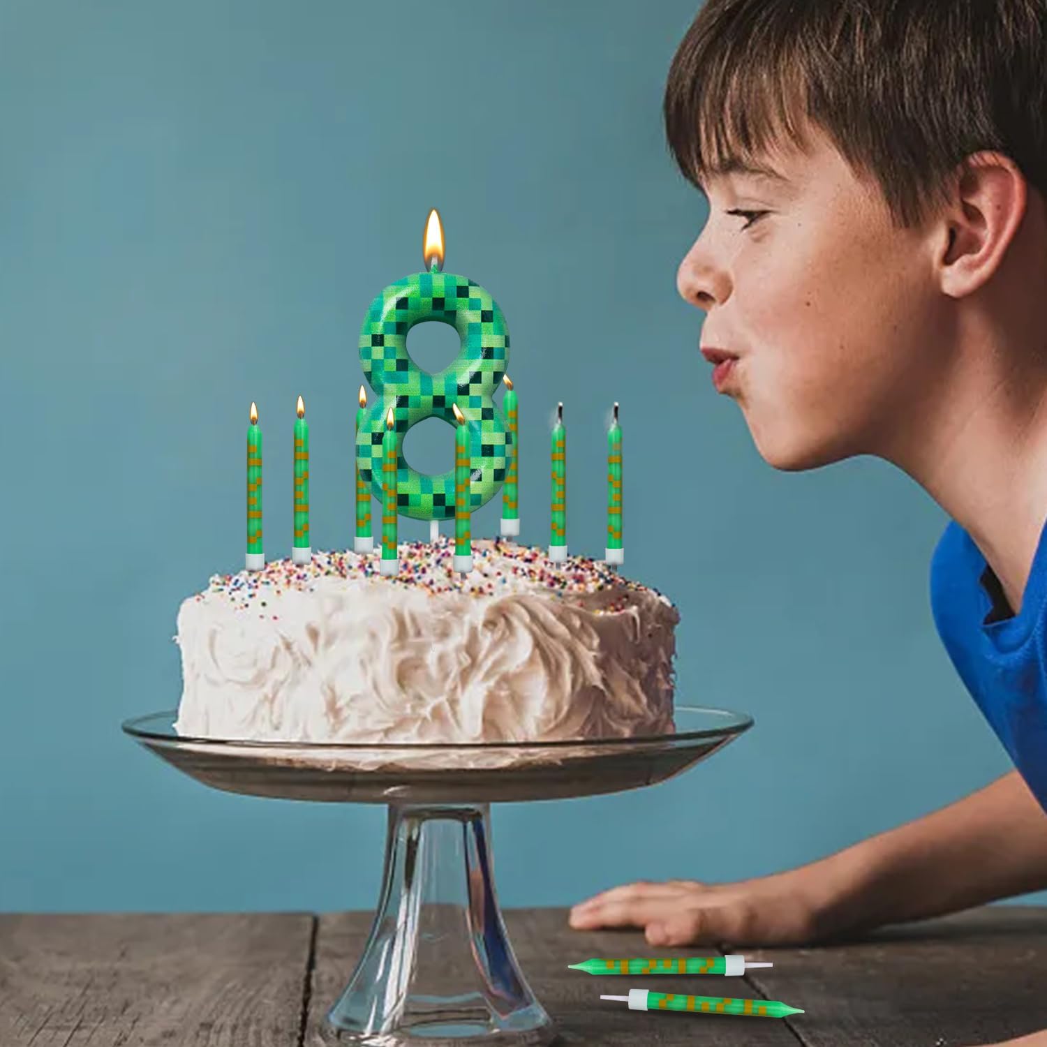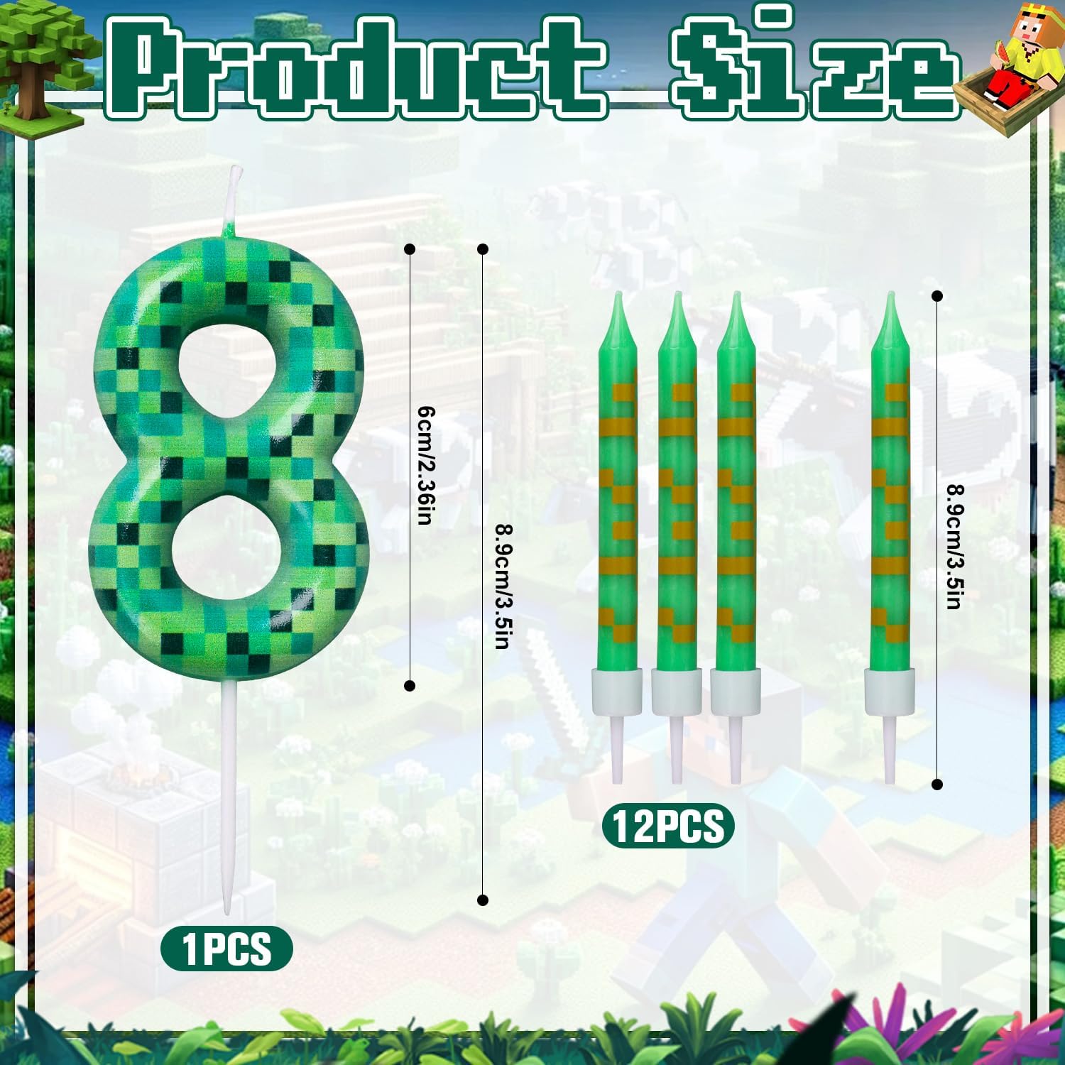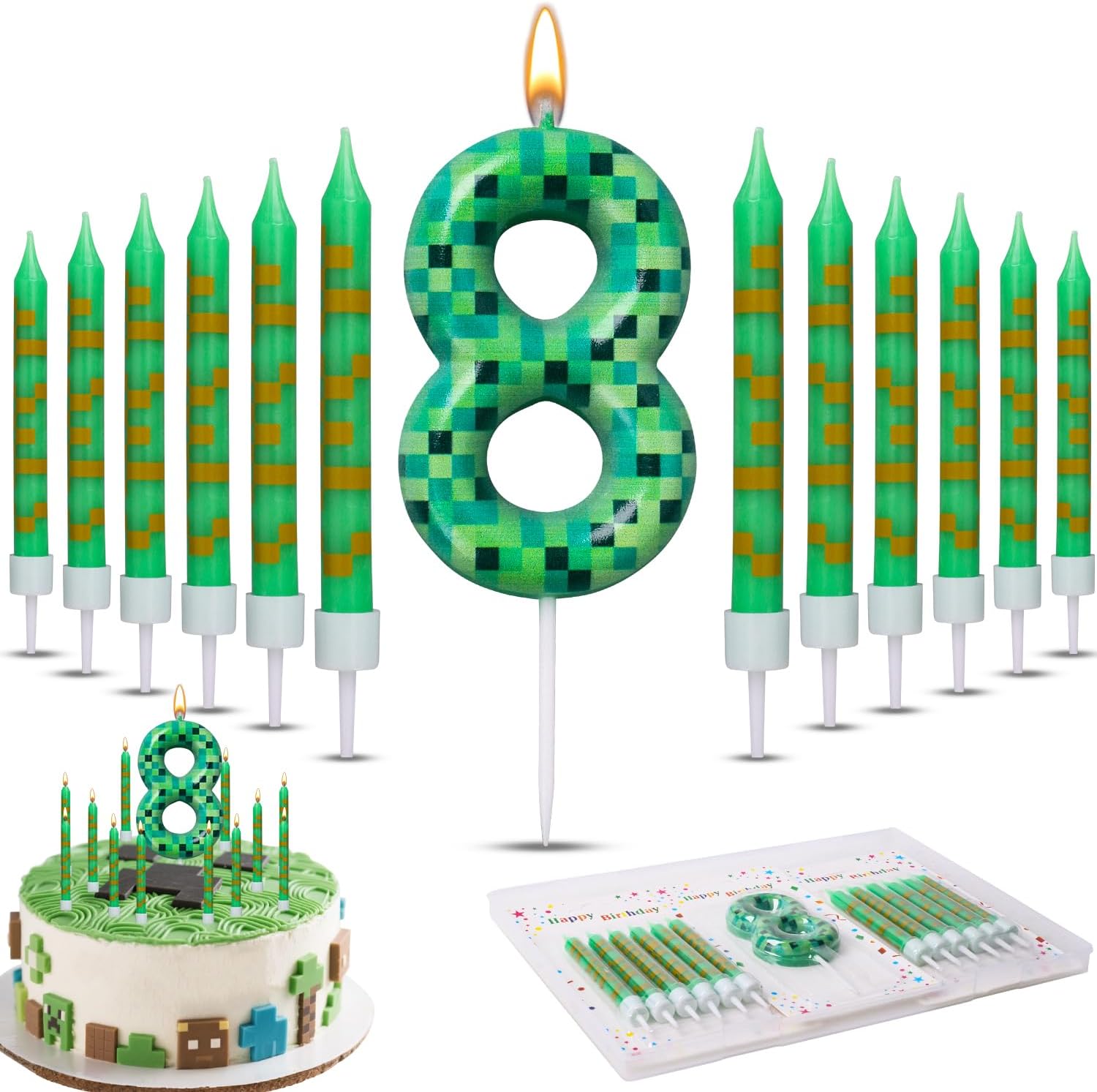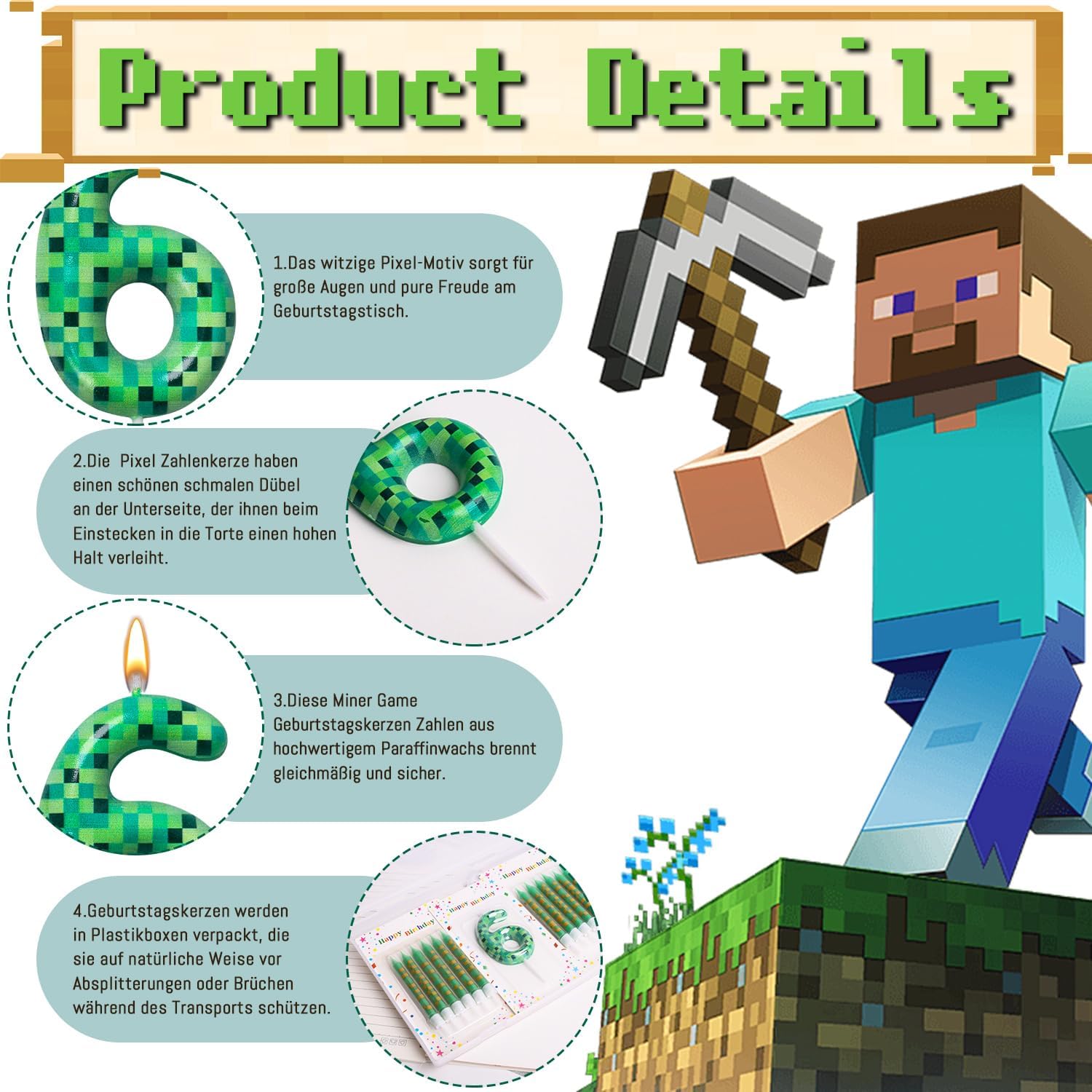 Elementi unici: la combinazione di motivi quadrati pixel e ricche tonalità verdi ricorda gli incantevoli mondi dei videogiochi classici. I bambini si sentono immediatamente come se fossero nel bel mezzo di un'avventura digitale colorata. Quando i tuoi ospiti vedono queste decorazioni per torte Pixel Candle, i loro occhi si illumineranno di eccitazione! Dimensioni ottimali: le candele di compleanno sono alte circa 9 cm, quindi non troppo grandi, né troppo piccole. Il fondo delle candele pixel ha un bel picco stretto, che dà loro un alto supporto quando inseriti nella torta. È perfetto per piccole torte, torte grandi, cupcake e persino alzate per torte e attirerà immediatamente l'attenzione di tutti Materiali di alta qualità: queste candele di compleanno per giochi di minatore sono realizzate in cera di paraffina di alta qualità, bruciano in modo uniforme e sicuro. La fiamma è calda e non produce né fumo né odori sgradevoli, quindi i compleanni possono essere senza preoccupazioni Sorpresa indimenticabile: ogni set include 1 candela di compleanno pixel accuratamente progettata con motivo digitale e 12 candele di compleanno. L'interessante tema pixel ti fa avere grandi occhi e pura gioia sulla tavola del compleanno. Le candele di compleanno non sono solo decorazioni, ma trasforma il momento di spegnere le candele in una piccola avventura Ampia applicazione: che si tratti di una festa di compleanno, anniversario, baby shower, matrimonio o festa a tema, questo divertente topper per torta Pixel può creare un'atmosfera allegra e unica, che non solo fa sentire felici i bambini, ma rende anche felici gli adulti Garanzia di qualità: le nostre candele di compleanno sono confezionate in scatole di plastica, che le proteggono naturalmente da scheggiature o rotture durante il trasporto e lo rendono anche comodo per conservarle e riutilizzarle. Se avete problemi con le vostre candele di compleanno, vi preghiamo di contattarci immediatamente e troveremo la soluzione migliore per voi